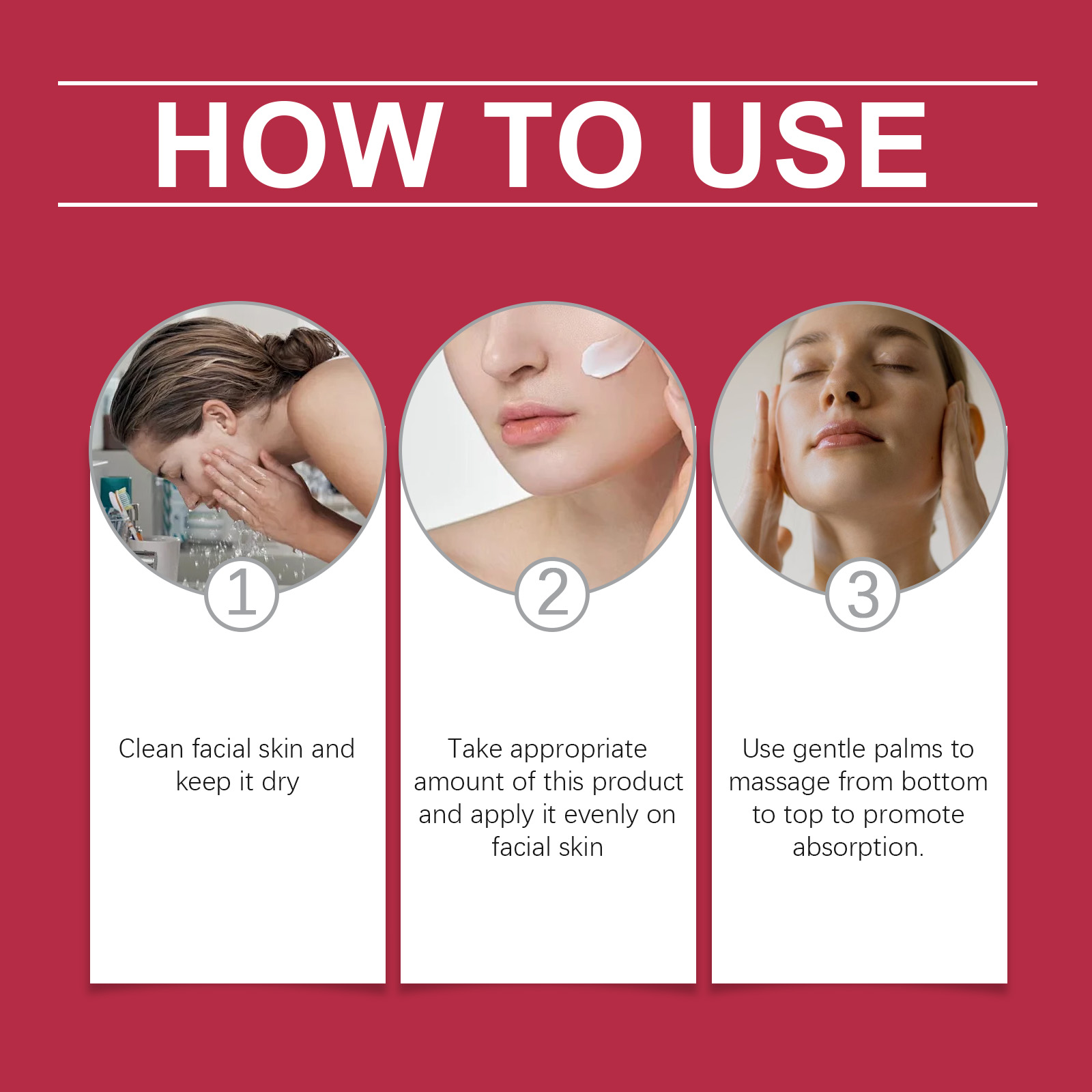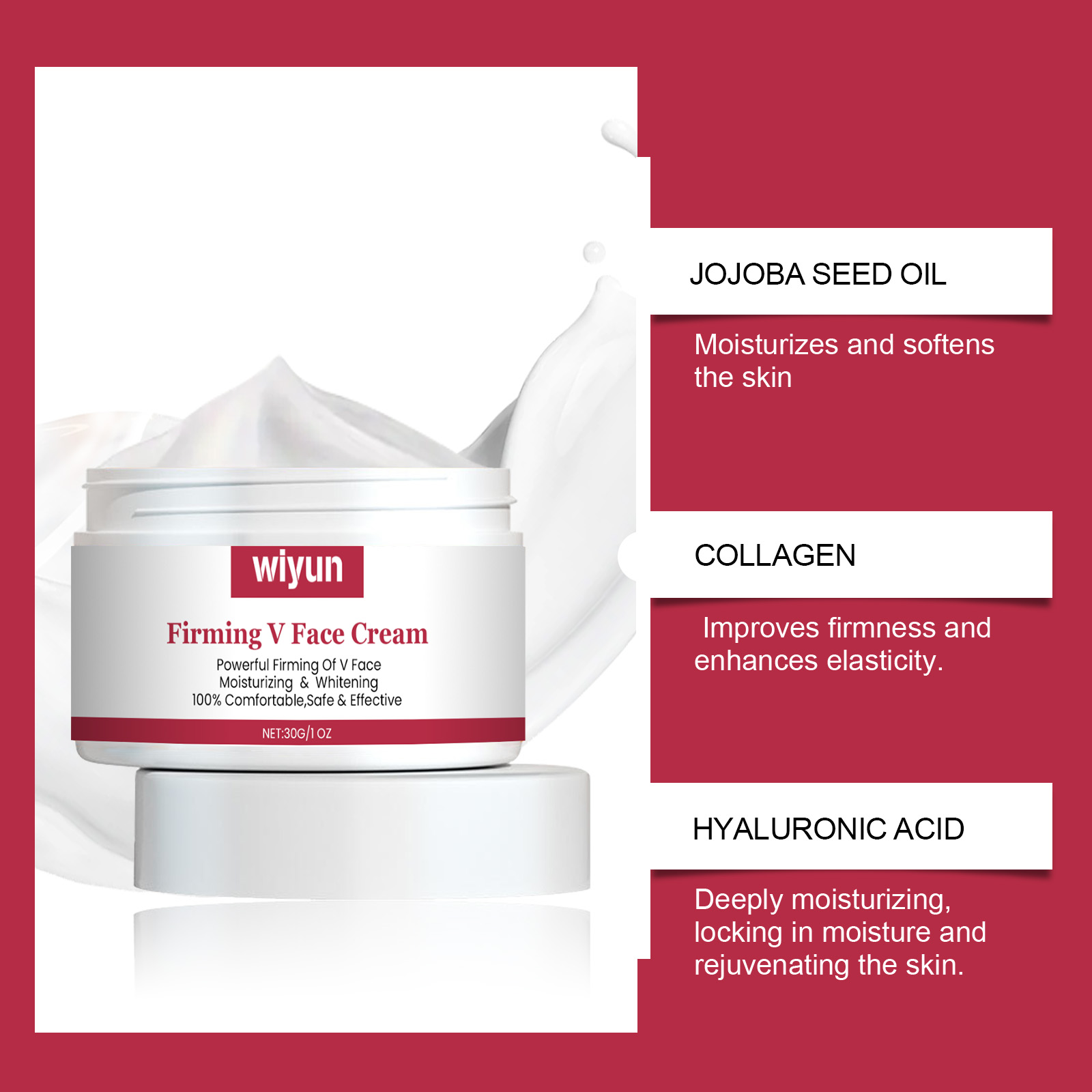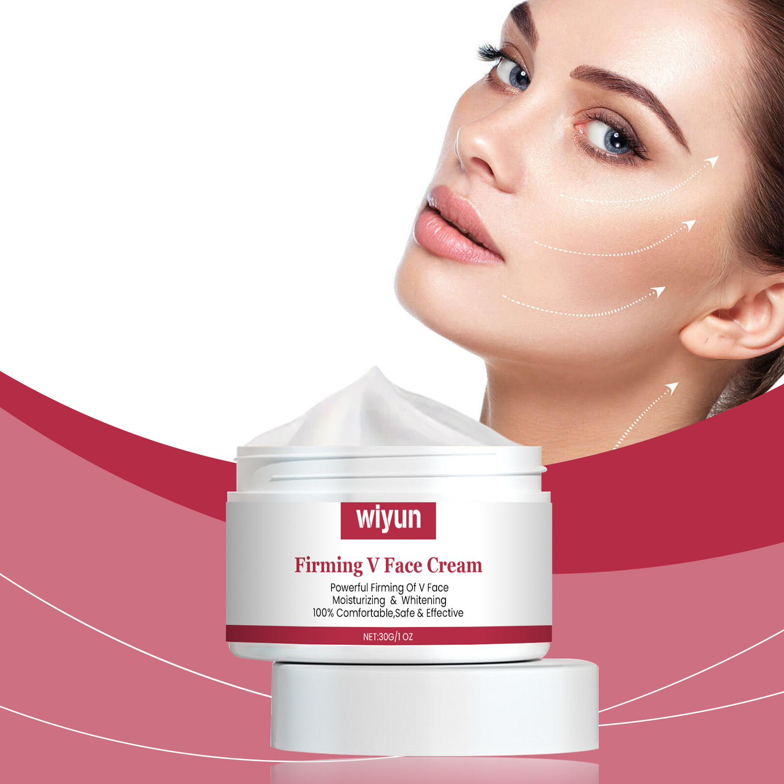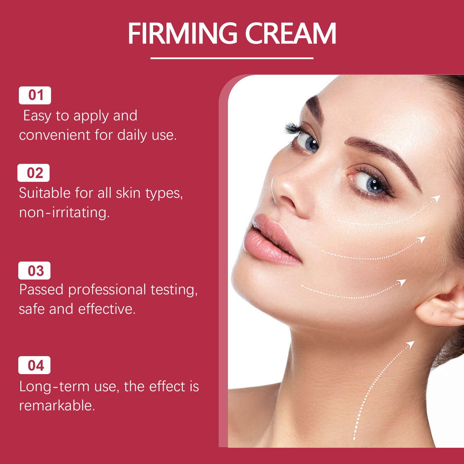 Our firming skin care cream contains Jojoba seed oil, collagen, and hyaluronic acid. It can effectively enhance the facial contour, giving a firm V-shaped face. Deeply nourishes skin and improves skin elasticity. Its use method is very simple: 1. Clean facial skin, keep dry; 2. Apply appropriate amount of the product evenly on the face; 3. Gently massage your palms from bottom to top to promote absorption. Inject rich moisturizing factor and elastic support into the bottom of the skin, effectively enhance facial contour and combat sagging.