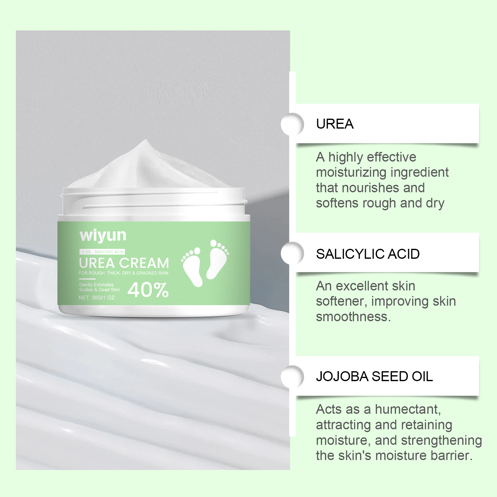 Our urea foot cream contains urea, salicylic acid and Jojoba seed oil. It strengthens the skin barrier and prevents water loss. Effectively reduce the discomfort caused by water shortage. Its use method is very simple: 1. Wash the foot skin, keep dry; 2. Apply appropriate amount of the product evenly on the heel, foot, ankle, elbow, leg and other body parts. 3. Gently massage until completely absorbed. Keep your skin moisturized for a long time. Mild and non-irritating, suitable for regular use.