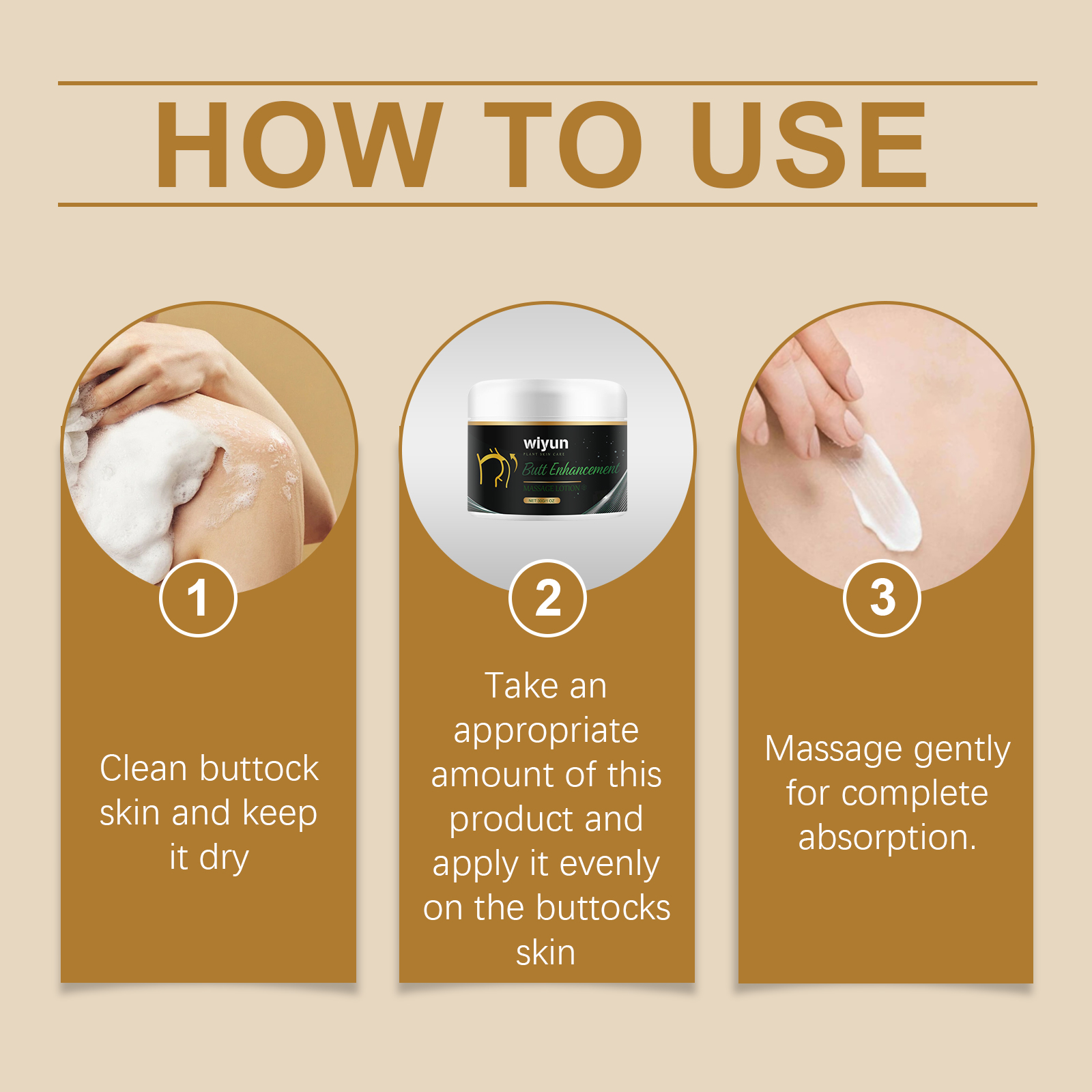 Our hip care cream contains glycerin and mineral oil. It can increase skin elasticity, improve firmness and alleviate sagging. Promote skin metabolism, improve skin quality and maintain youth; Deep nourishment, regulation of skin oil balance, and enhancement of skin barrier function. Its usage method is very simple: 1. Clean the skin on the buttocks and keep it dry; 2. Apply an appropriate amount of this product evenly to the skin on the buttocks. 3. Gently massage until fully absorbed. Designed specifically for shaping firm buttocks and improving curves; Deeply moisturize. Make the skin smooth and elastic.
