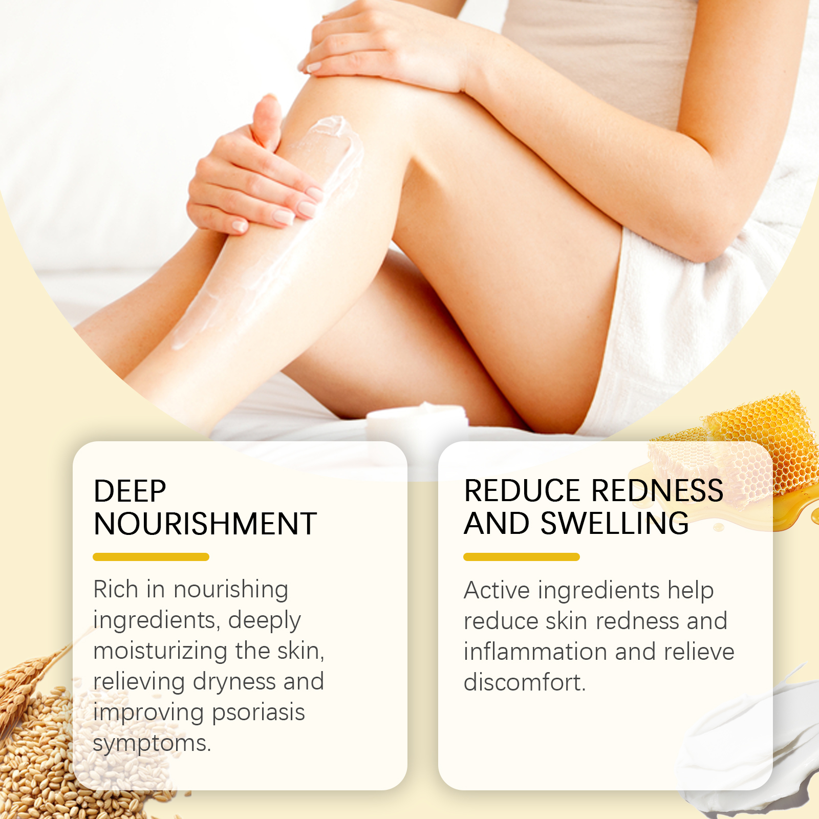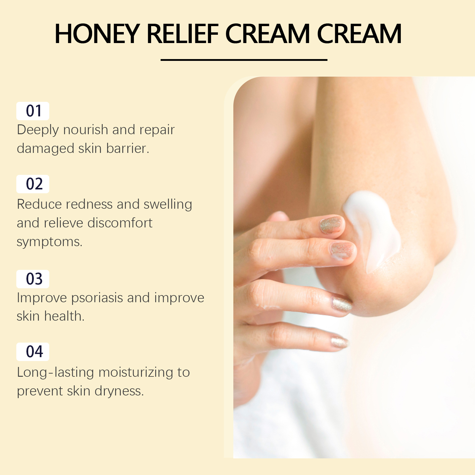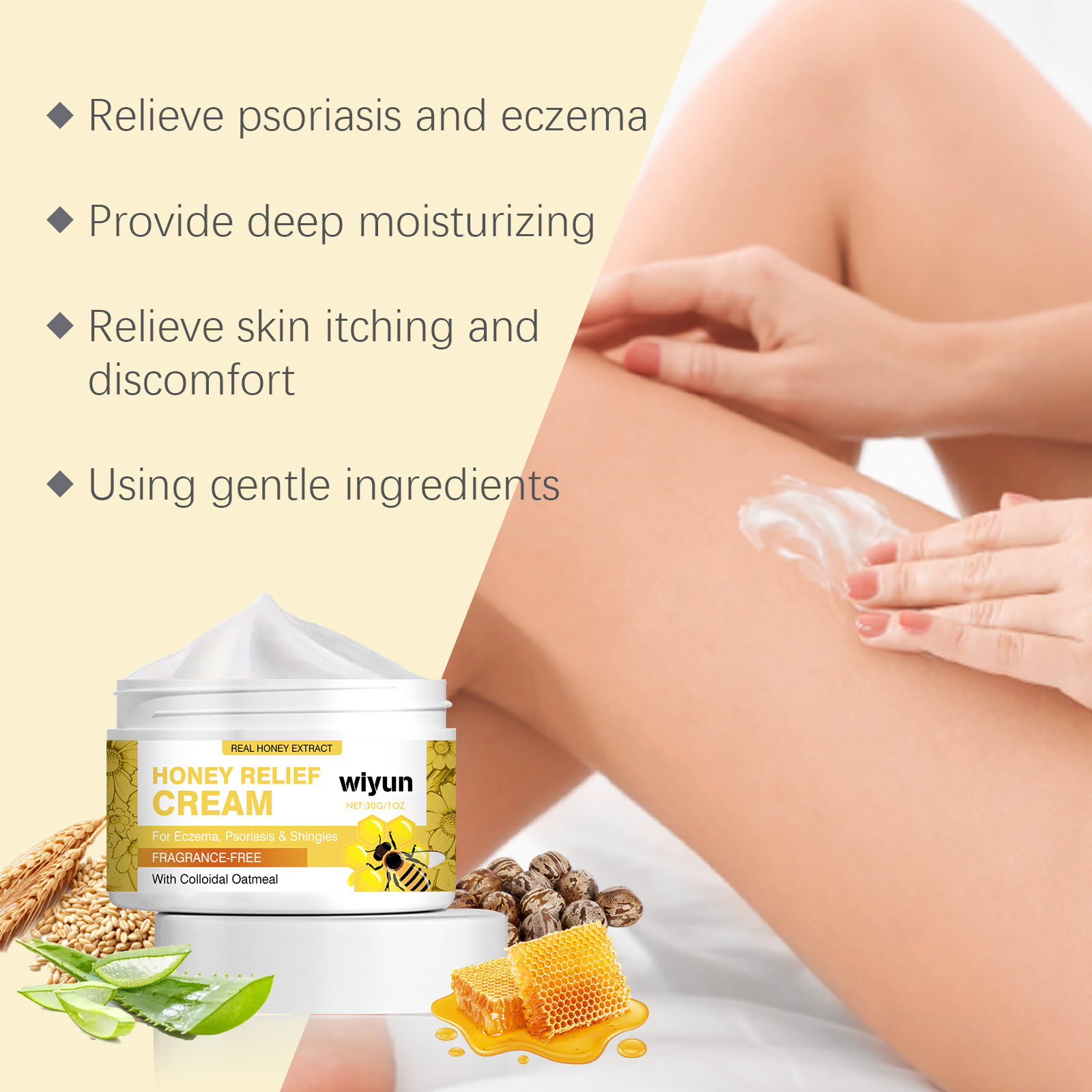 Our honey skin care cream contains honey, castor oil, oat extract. It can deeply moisturize the skin, relieve dryness and improve psoriasis symptoms. Active ingredients help reduce skin redness and inflammation and relieve discomfort. Its application method is very simple: 1. First thoroughly clean and dry the skin; 2. Apply appropriate amount of the product evenly to the psoriasis area; 3. Gently massage to promote absorption and growth. Honey Skin Care Cream with plant extract, mild, non-irritating, suitable for long-term use, protect sensitive skin.