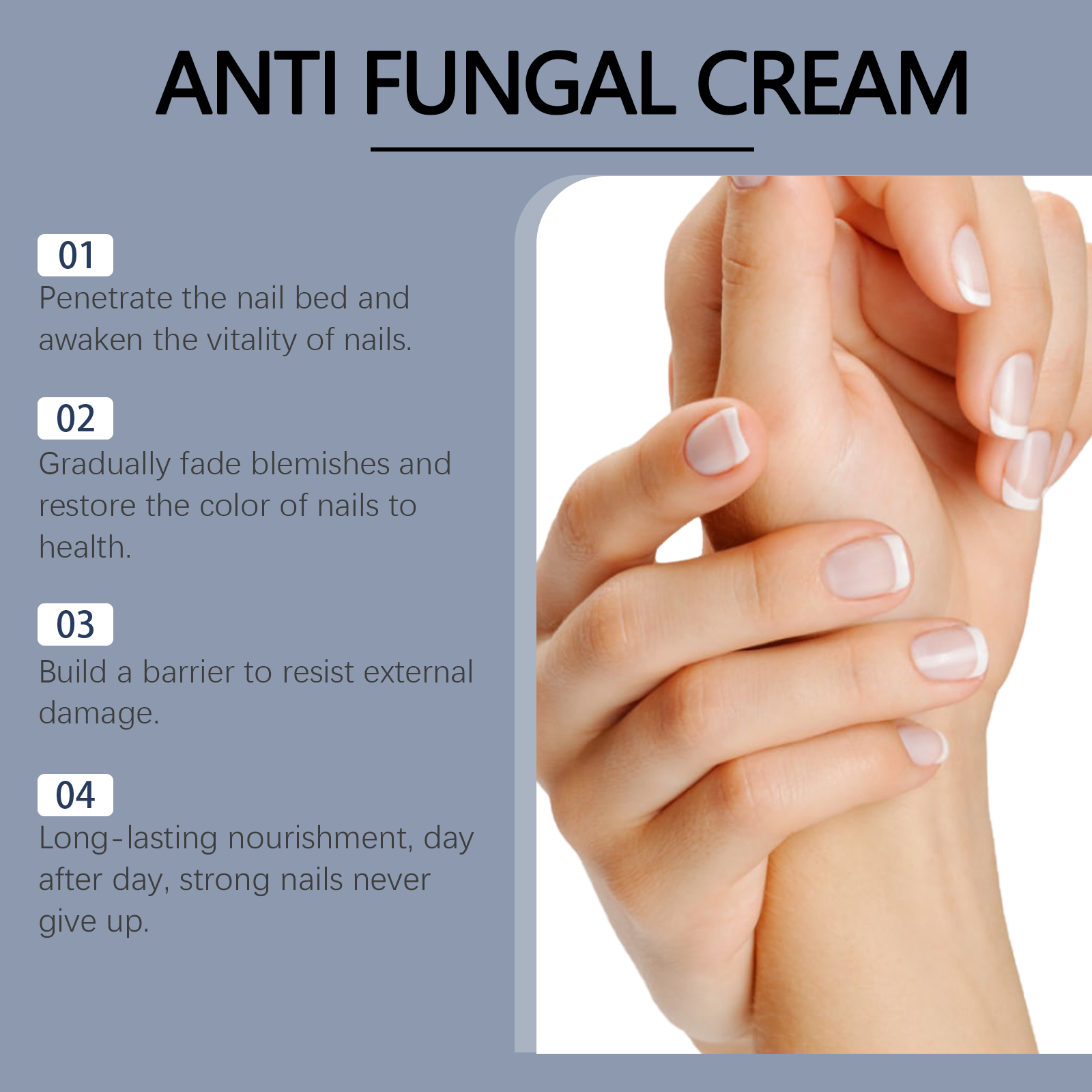 Our nail care and repair cream contains vitamin E(tocopherol), aloe leaf extract. It will soften fading and keep your nails as shiny as ever. Its application method is simple: thoroughly clean the affected nail, dry it, apply an appropriate amount of this product evenly to the nail and surrounding skin until it is fully absorbed. It can nourish nails and skin and help repair damaged tissue.