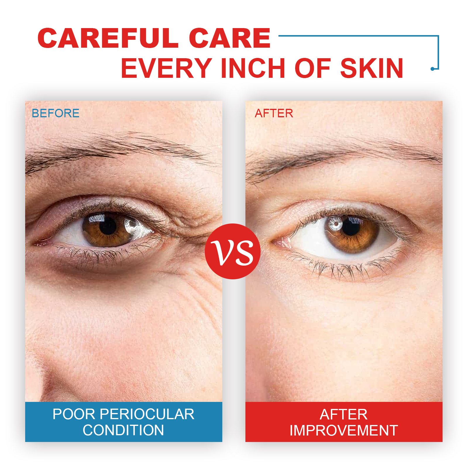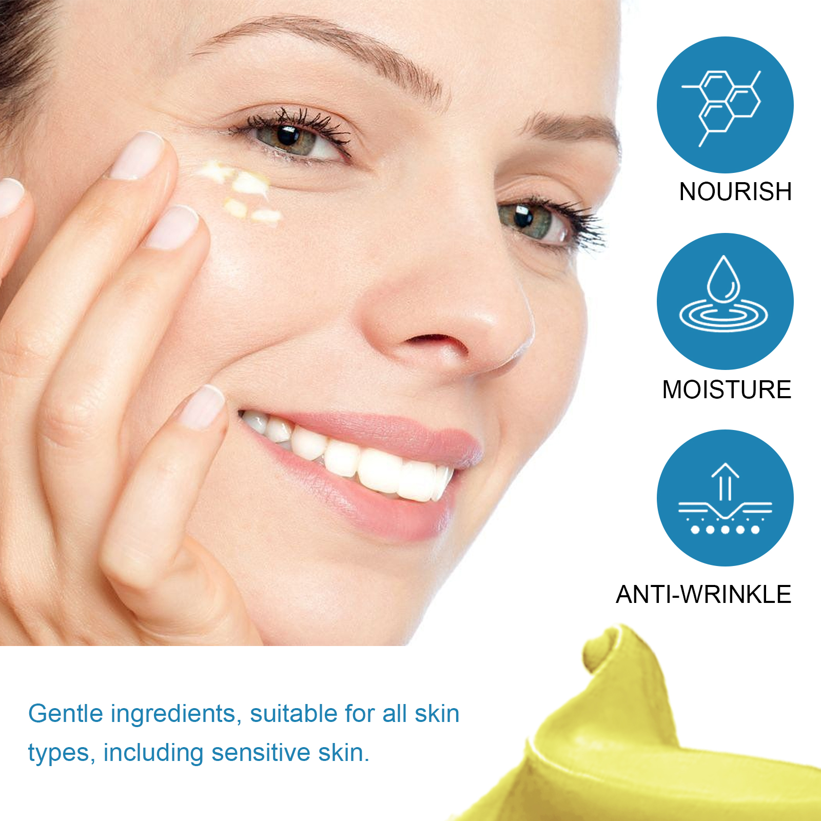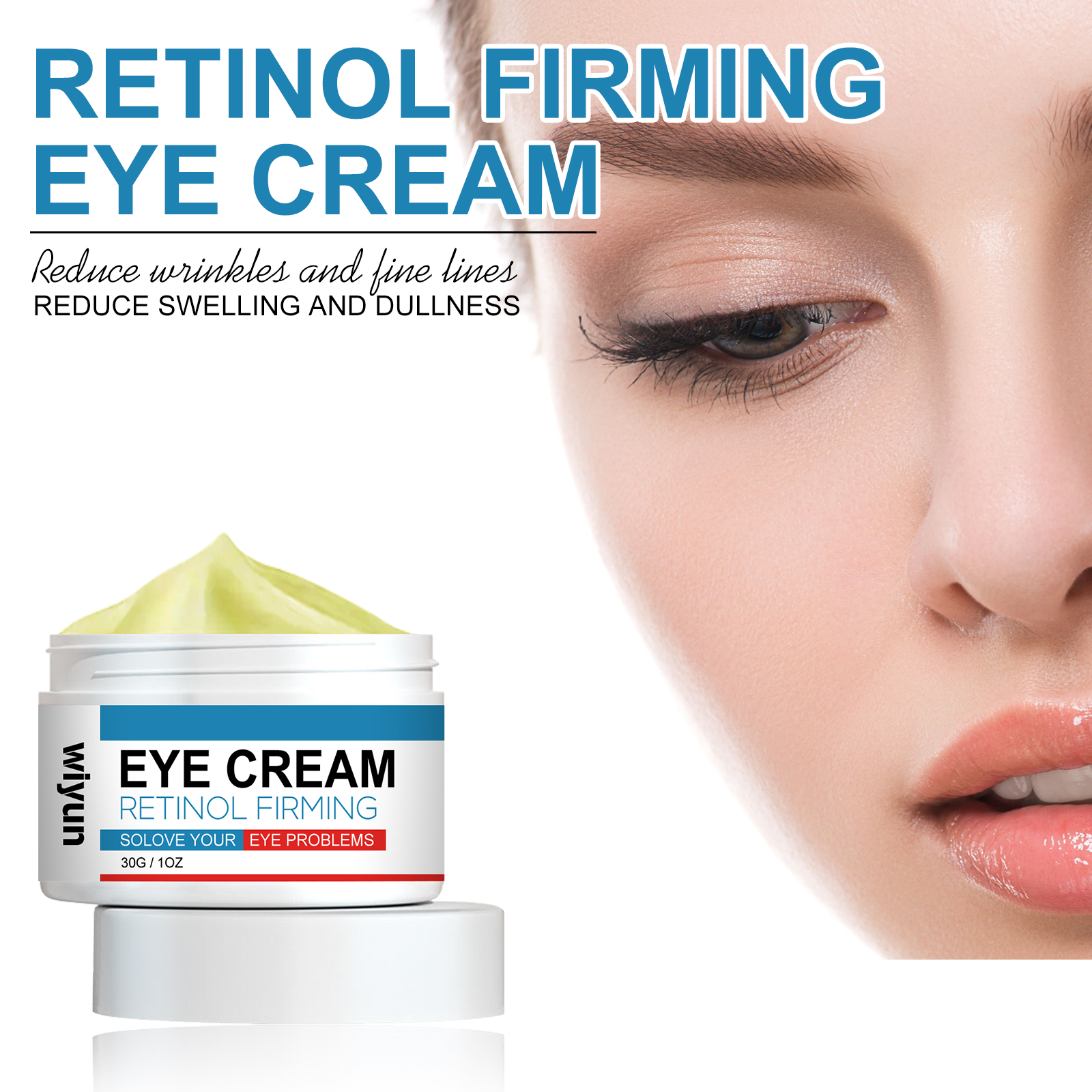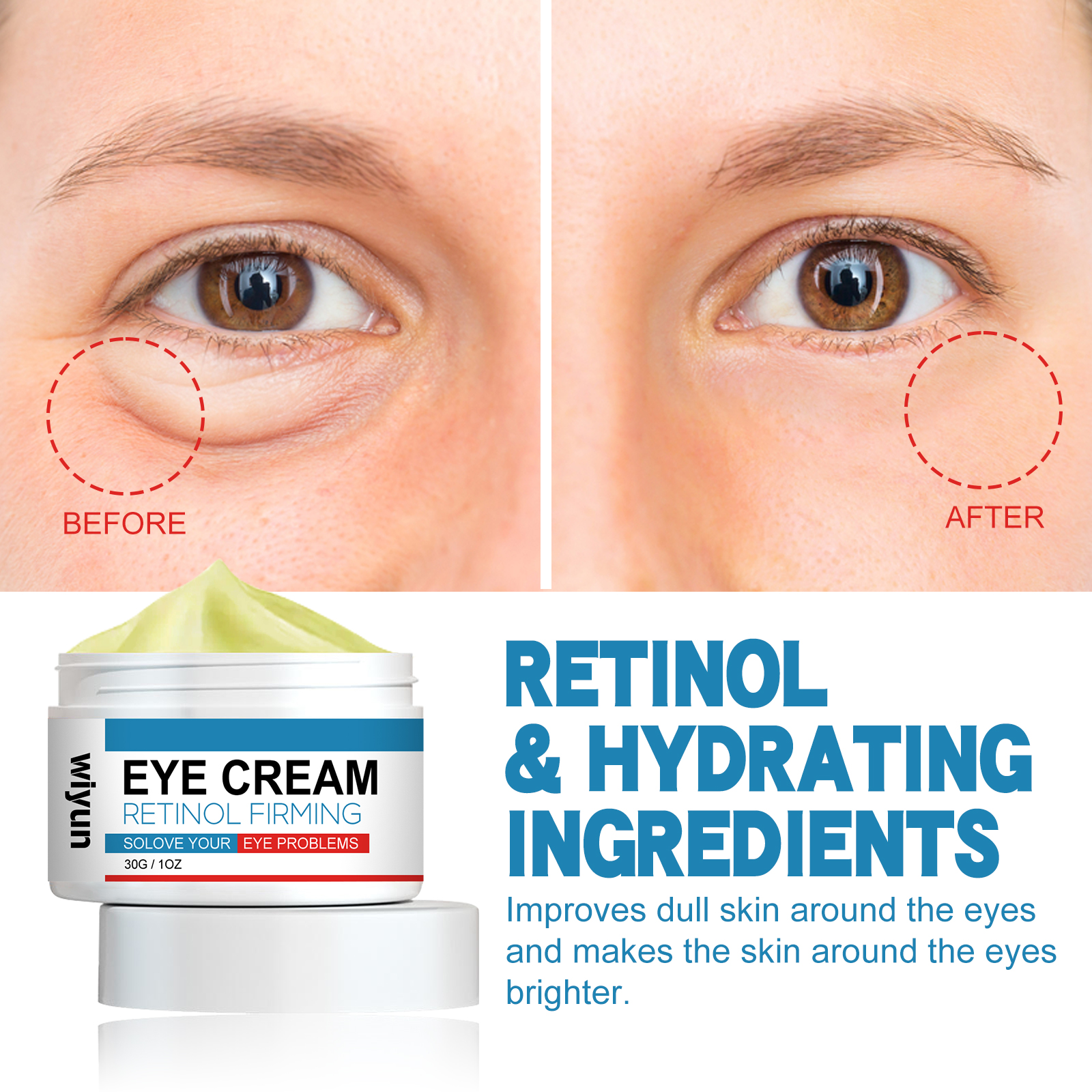 Our retinol anti-wrinkle eye cream contains retinol, collagen, and hyaluronic acid. It reduces wrinkles and fine lines, inhibits their growth, and eliminates dark circles and puffiness under the eyes. Its use method is very simple: after cleansing, take appropriate amount of eye cream evenly apply around the eyes, gently massage until completely absorbed. Retinol Eye cream improves dull skin around the eyes and makes the skin around the eyes brighter. Mild ingredients suitable for all skin types, including sensitive skin.