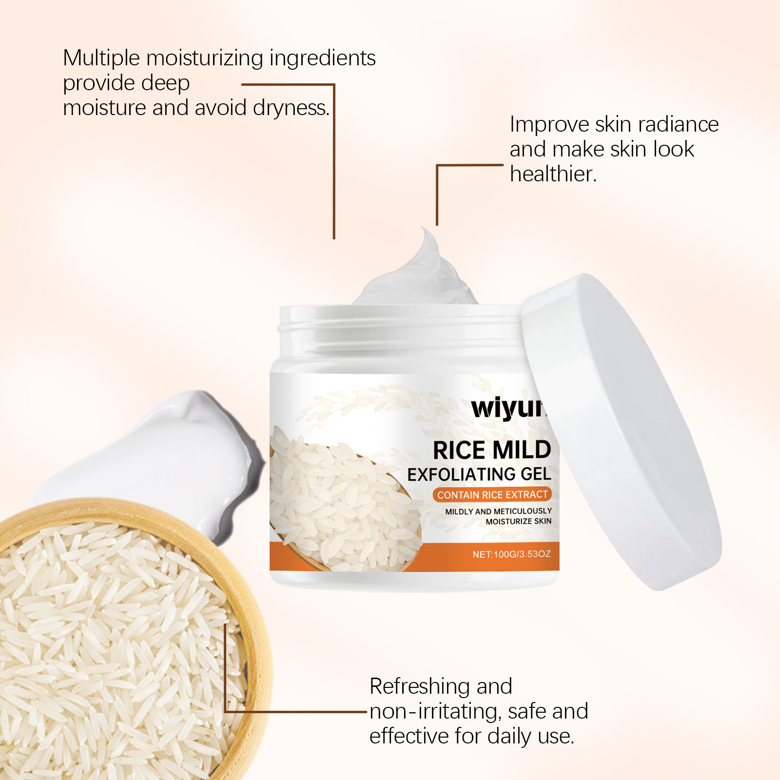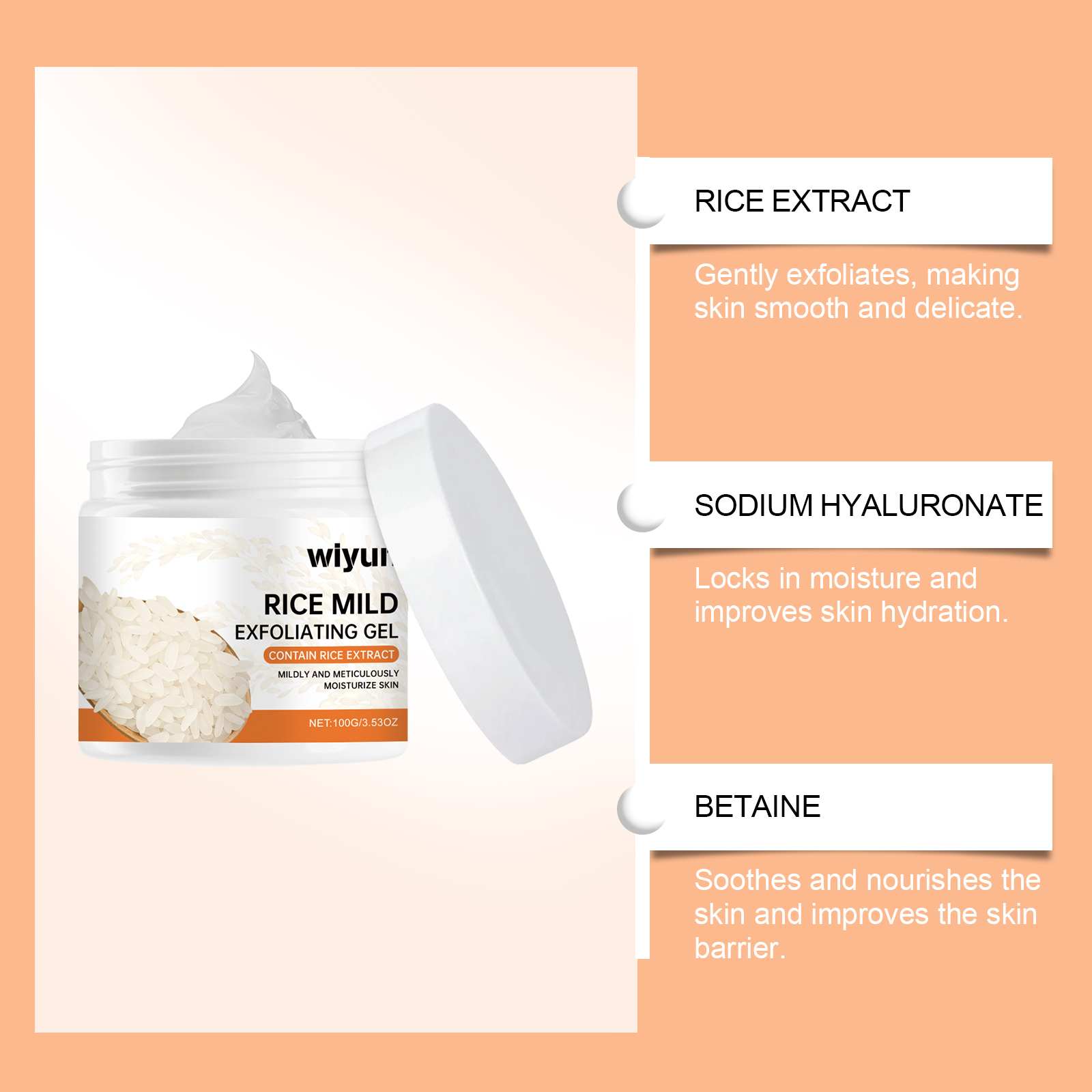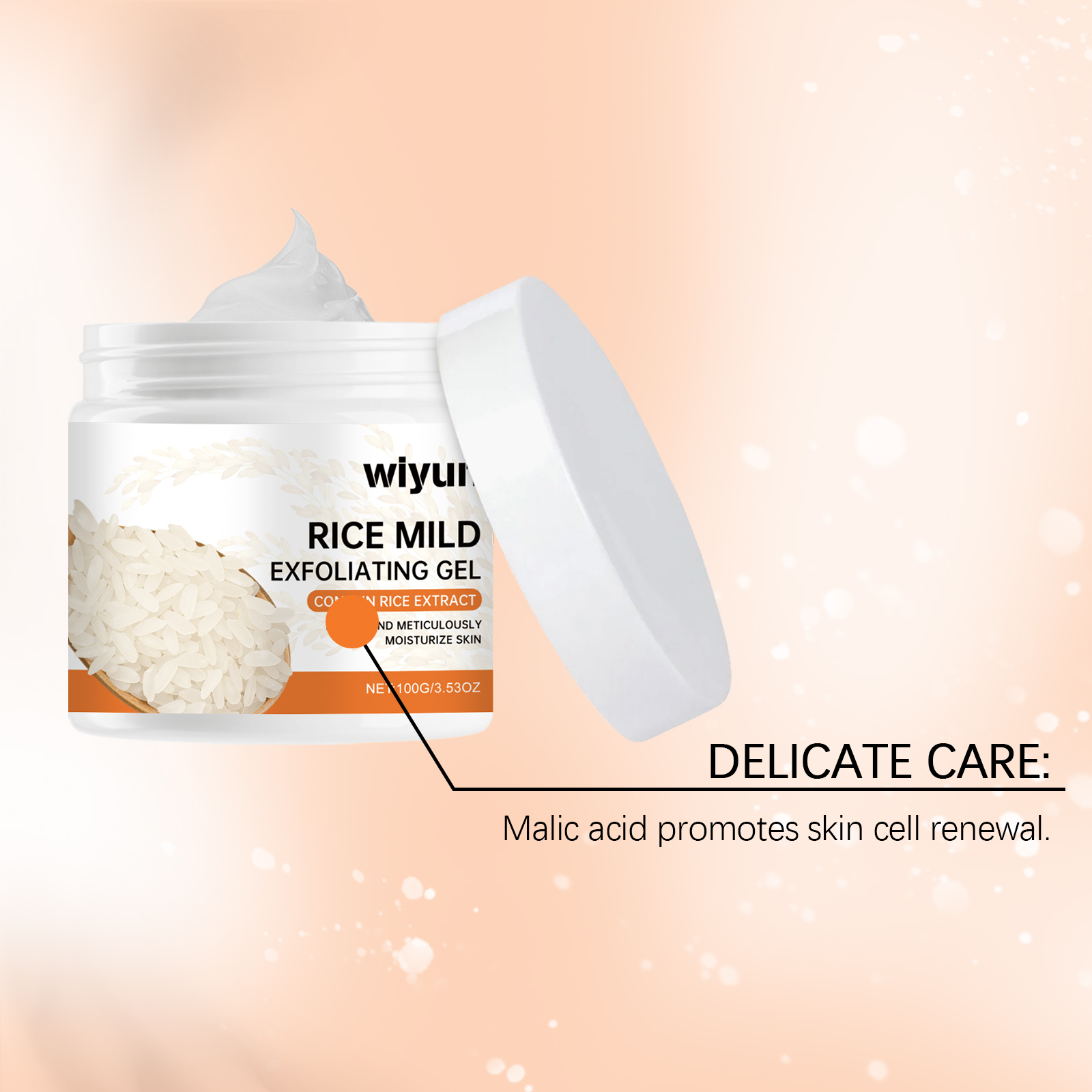 Our rice exfoliating gel contains rice extract, sodium hyaluronate, and betaine. It gently exfoliates and leaves skin smooth and delicate. Lock in moisture, improve skin moisture; Soothe and nourish the skin and improve the skin barrier. Its use method is very simple: 1. Apply appropriate amount of gel evenly on the skin to be treated, such as face, elbow, knee, etc. 2. Gently massage the skin to promote cuticle shedding. 3. Rinse with warm water. Rice extract helps gently remove old dead skin cells from the skin surface; Sodium hyaluronate locks in skin moisture and keeps skin hydrated for a long time.