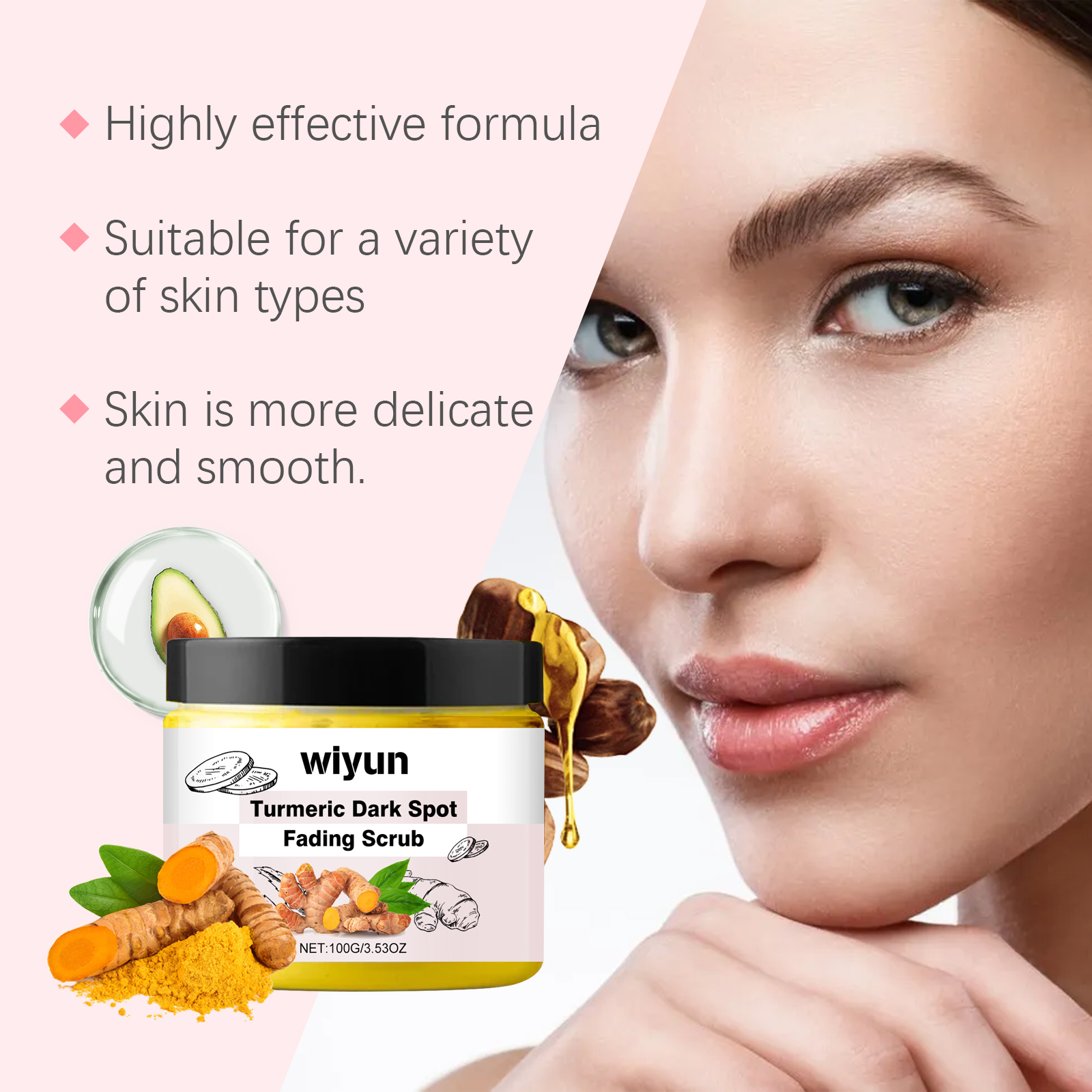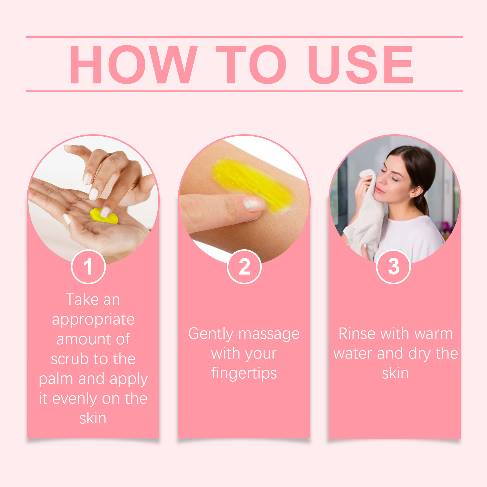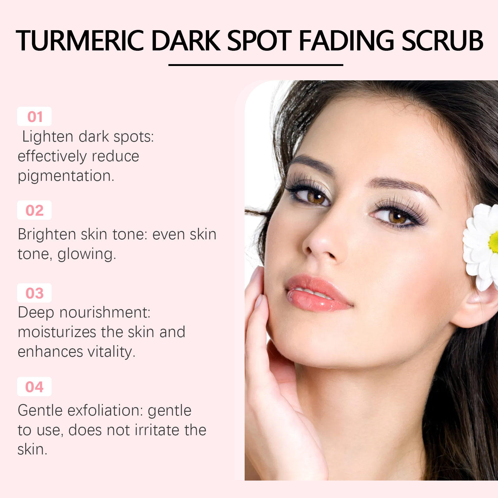 Our turmeric scrub contains turmeric root extract, avocado tree oil, Jojoba seed oil. It can effectively lighten dark spots and pigmentation and even out skin tone. Jojoba oil helps to lighten the skin. Its use method is very simple: 1. Take an appropriate amount of scrub in the palm, evenly smear on the skin; 2. Massage gently with fingertips; 3. Rinse and dry skin with warm water. Turmeric scrub contains avocado oil and gently exfoliates. Turmeric root extract deeply nourishes the skin.