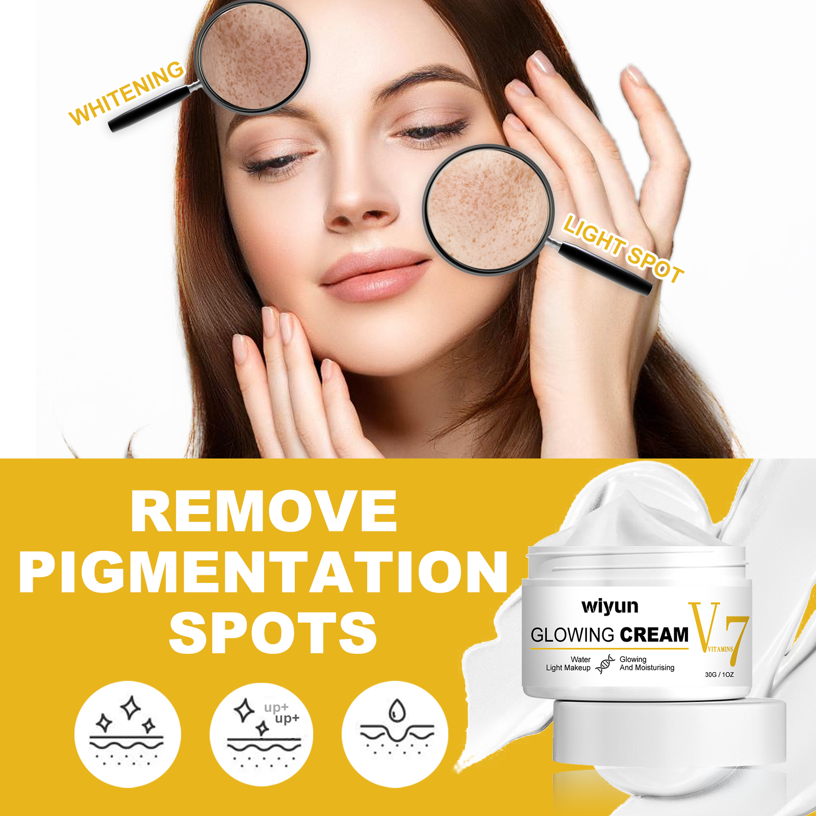 Our V7 whitening cream contains niacinamide, squalane and vitamin C. It can whiten and remove spots, lighten the skin, smooth and tender skin, and continue to use to reduce pigment spots. The way to use it is simple: after cleansing, apply the cream evenly to the face and gently massage until it is completely absorbed. 7 Whitening cream to solve the problem of pigment spots, skin dullness, remove spots, pigmentation.