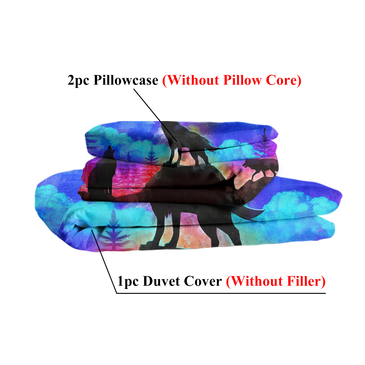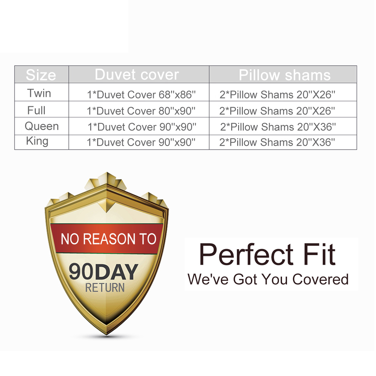 1.ATTENTION: Twin set come with one duvet cover 68" by 86" and two standard pillow shams 20" by 26"; Full set come with one duvet cover 80" by 90" and two standard pillow shams 20" by 26"; Queen set come with one duvet cover 90" by 90" and two standard pillow shams 20" by 36"; King set come with one duvet cover 104" by 90" and two standard pillow shams 20" by 36". DOES NOT include any inside fillers and accessories.