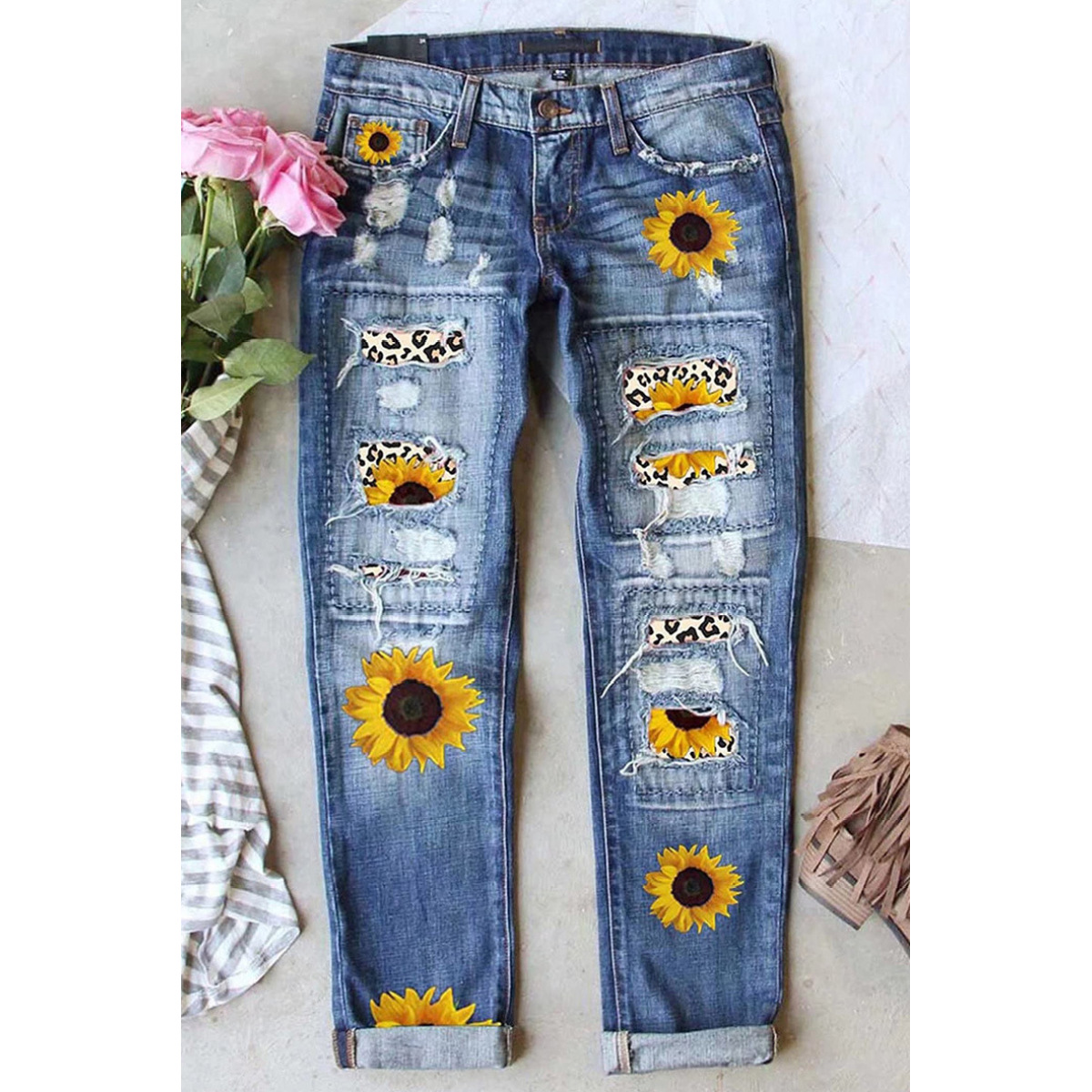Woman's Middle In Ripped Printed Jeans