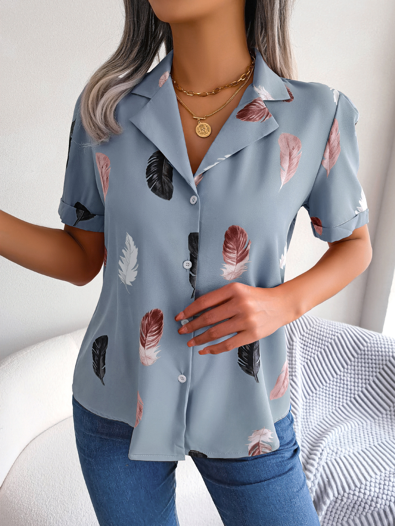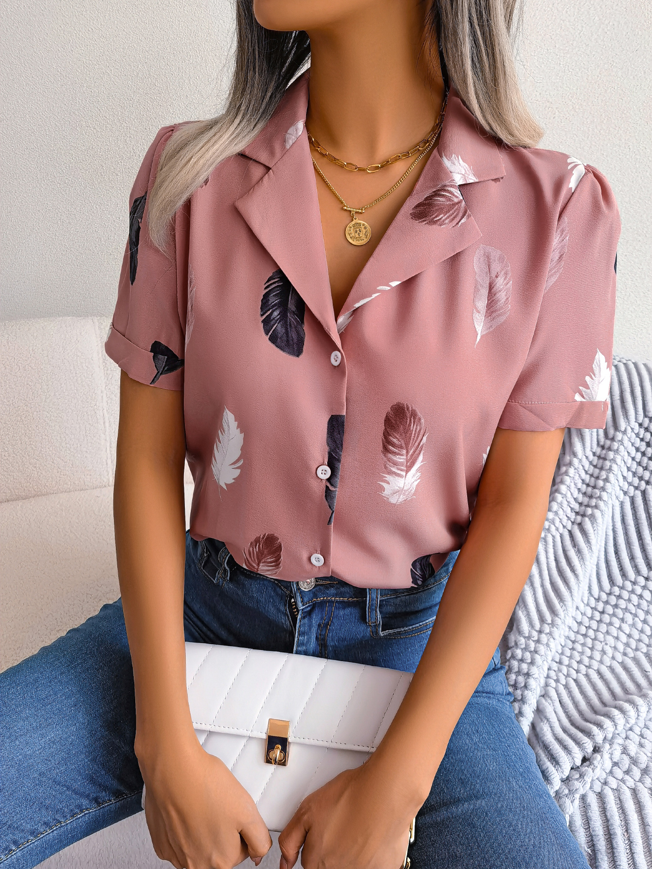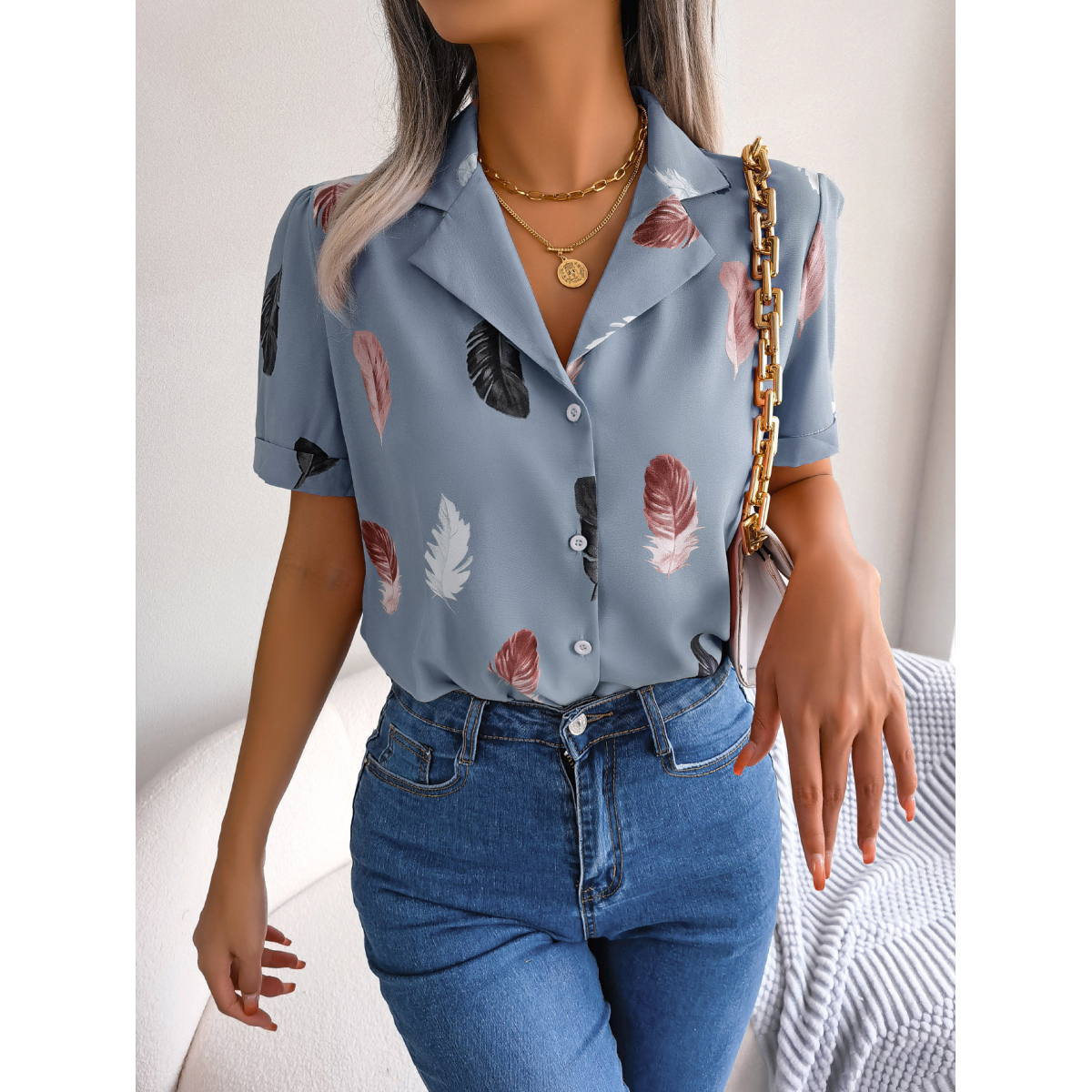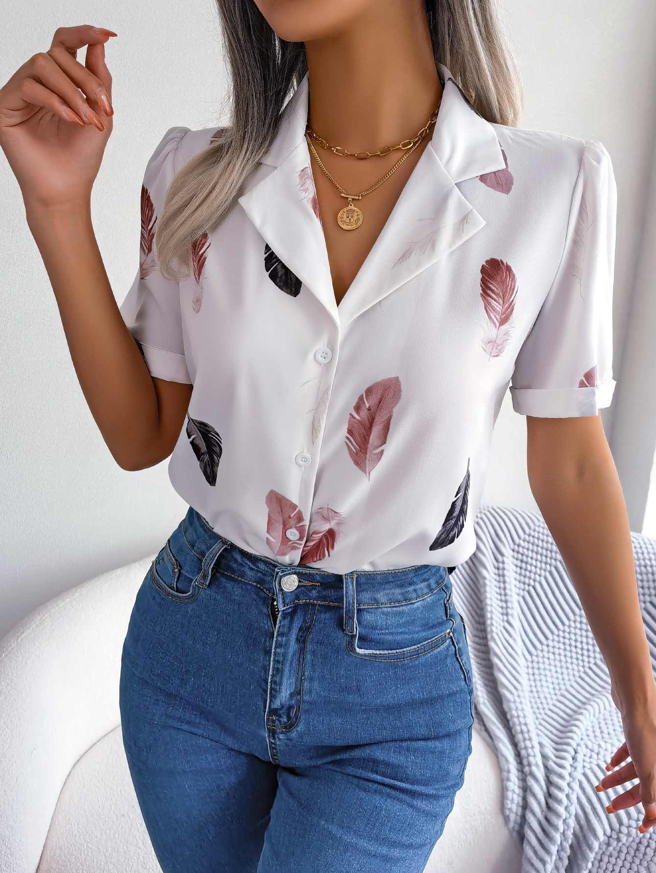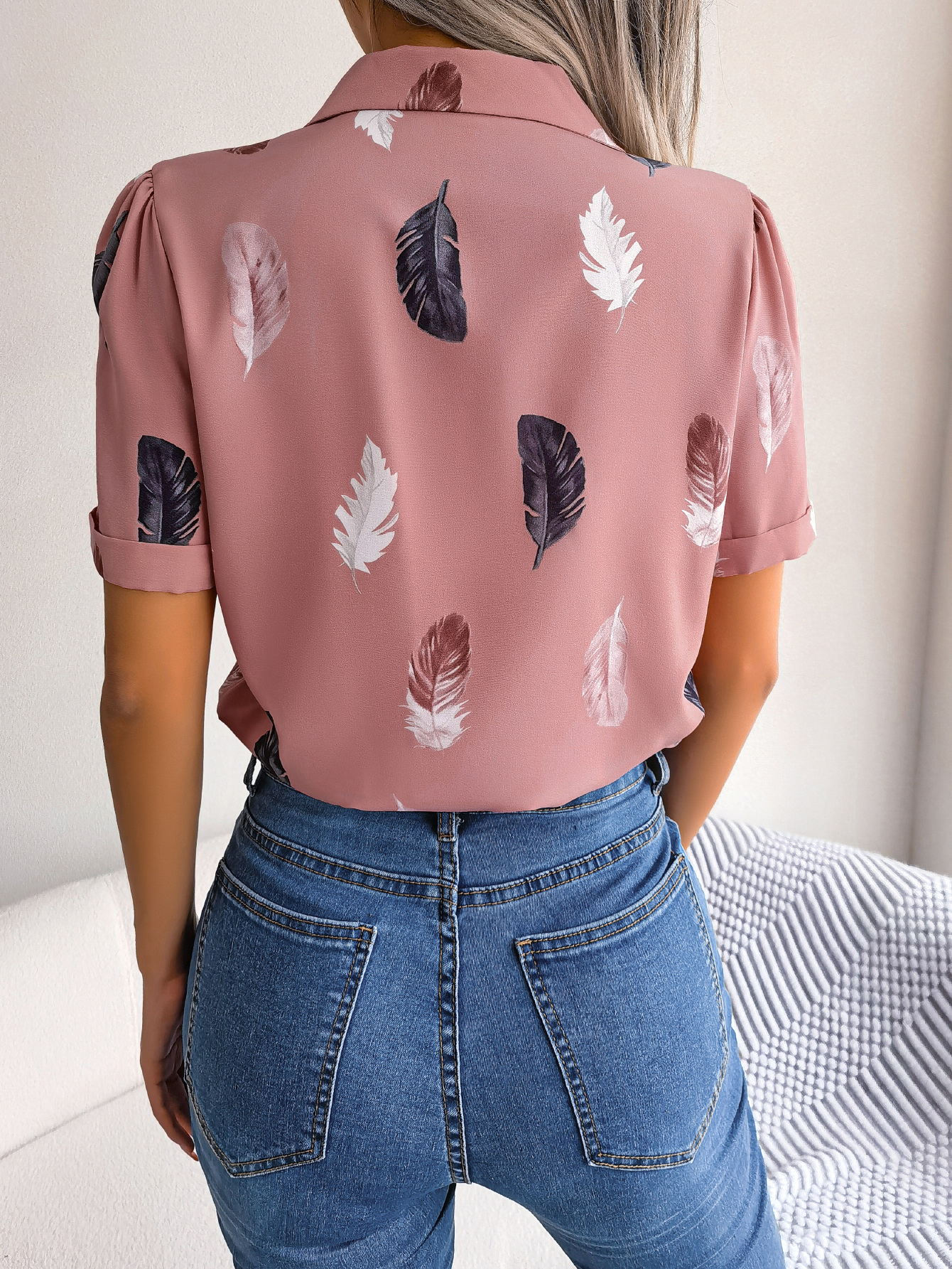 Women Elegant Notched Lapel Feather Loose Short Sleeve Shirt