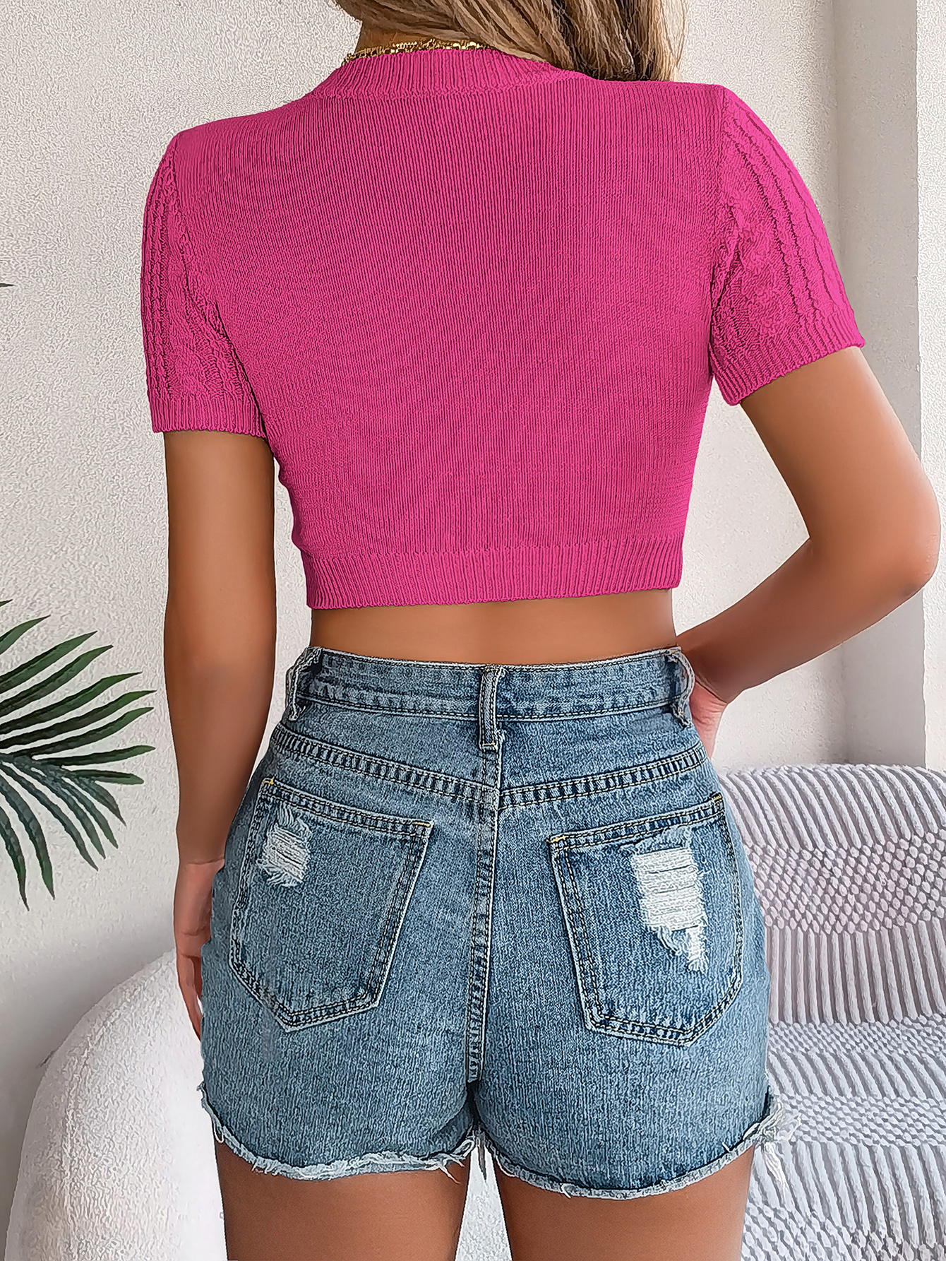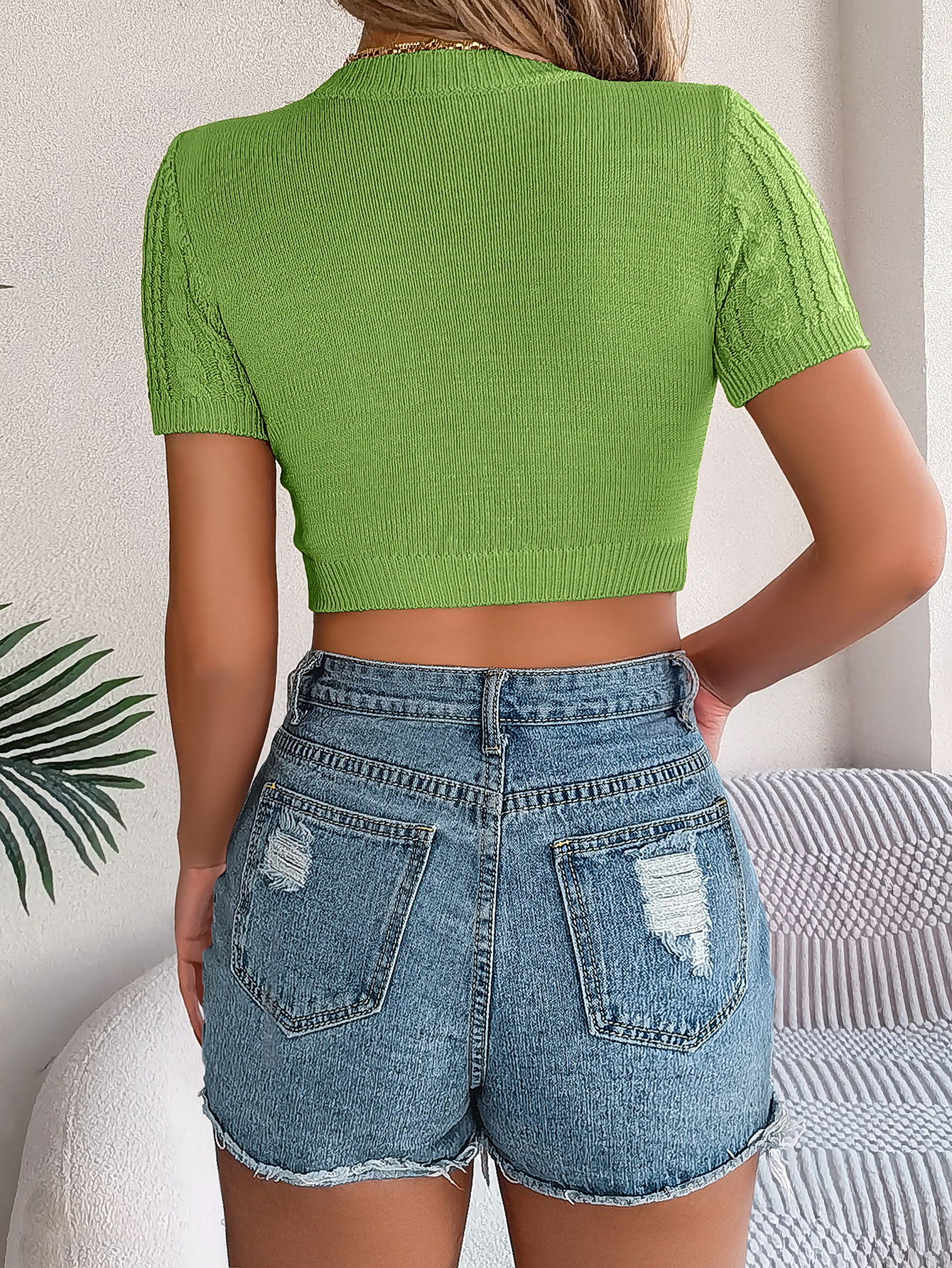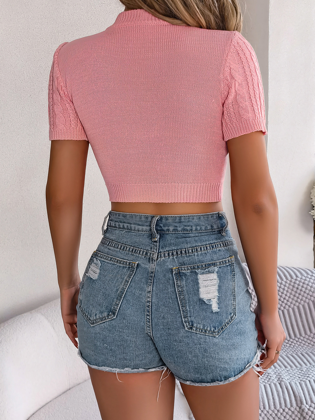 Women Casual Cable Knit Short Sleeve Cropped Vacation Top