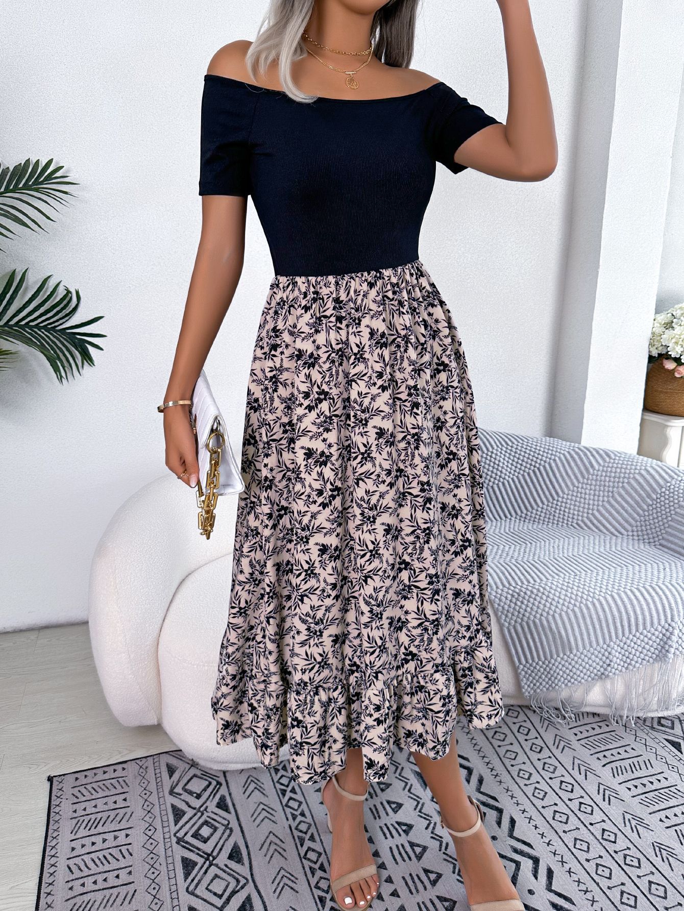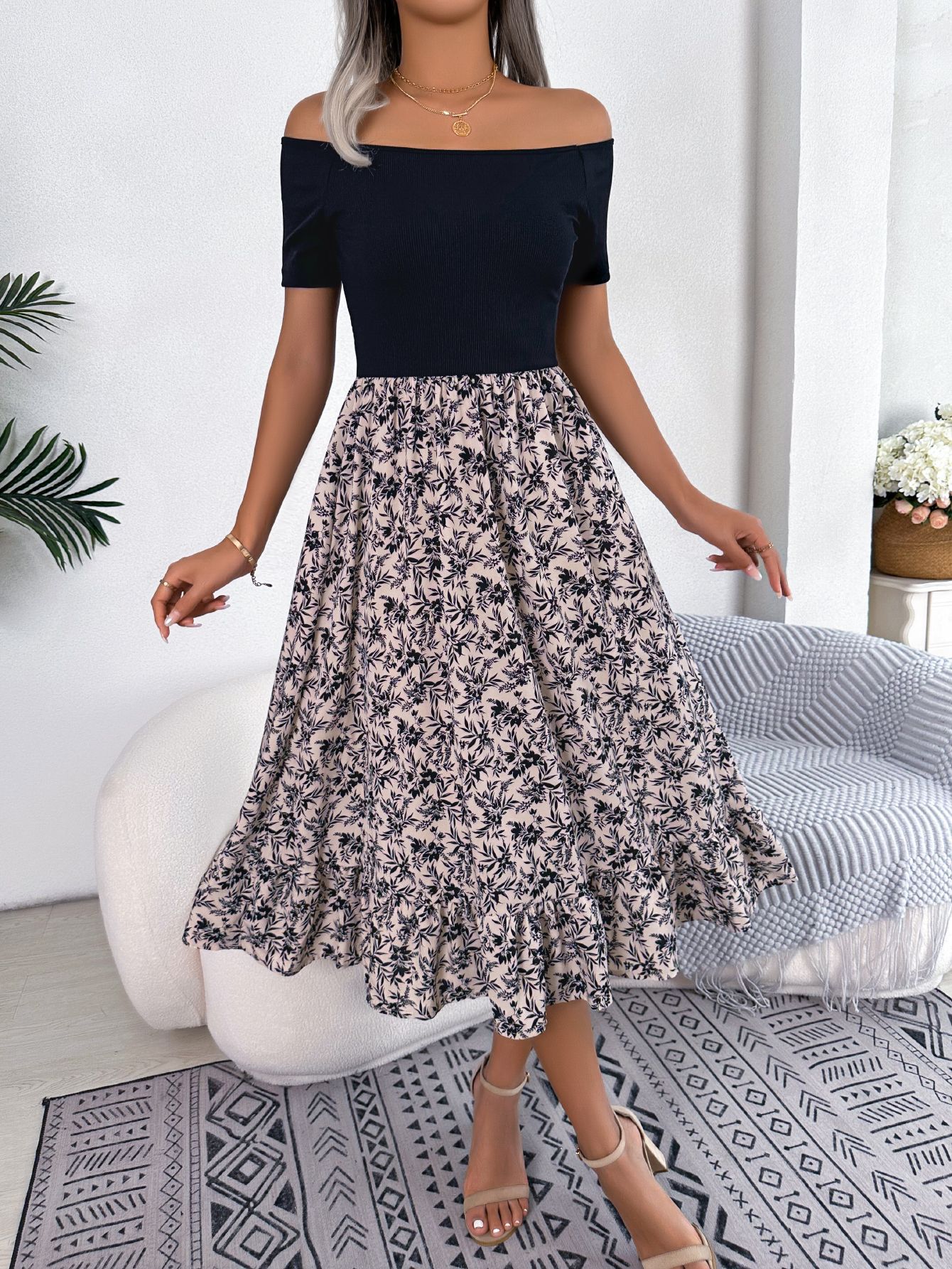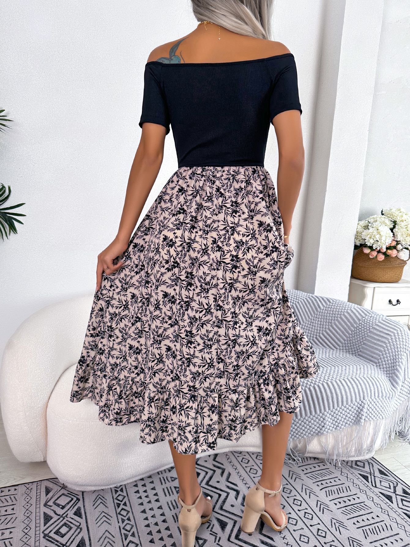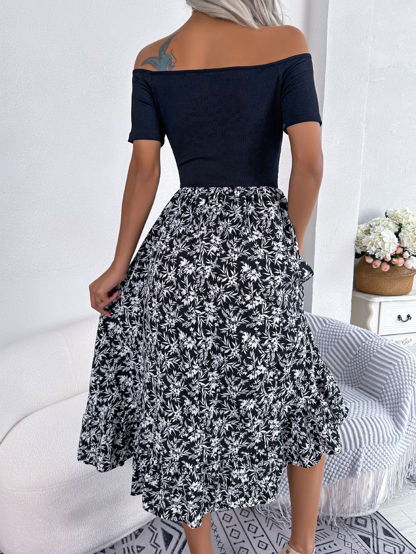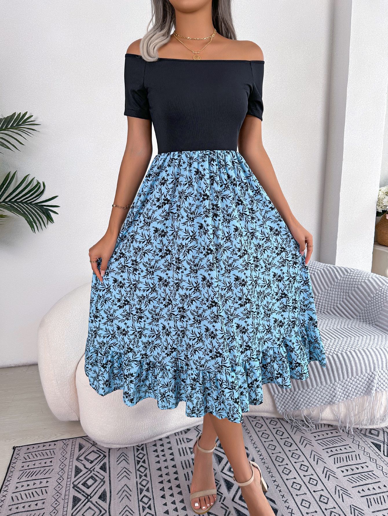 Women Casual Off Shoulder Floral Print Ruffle Midi Dress