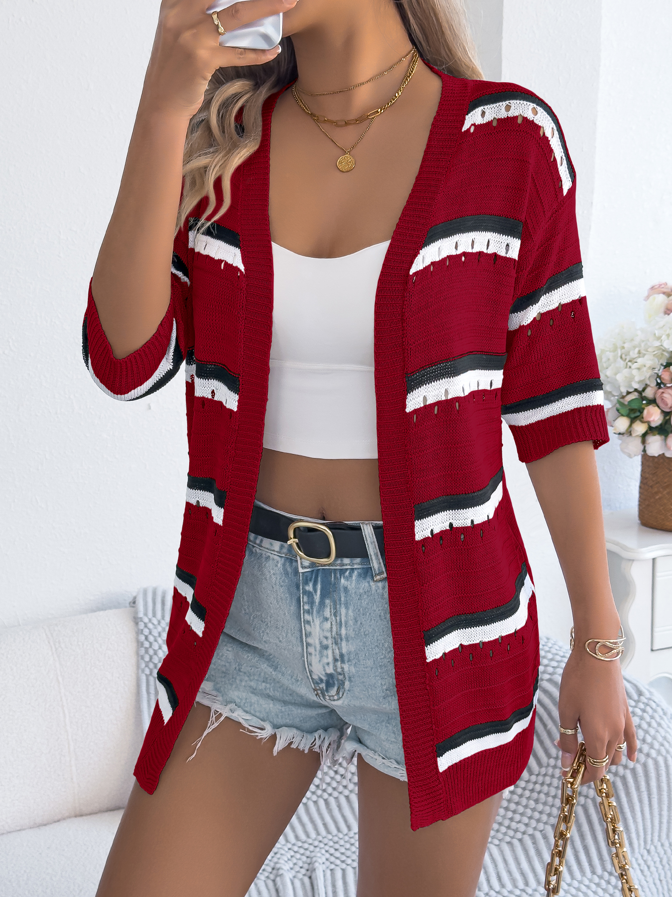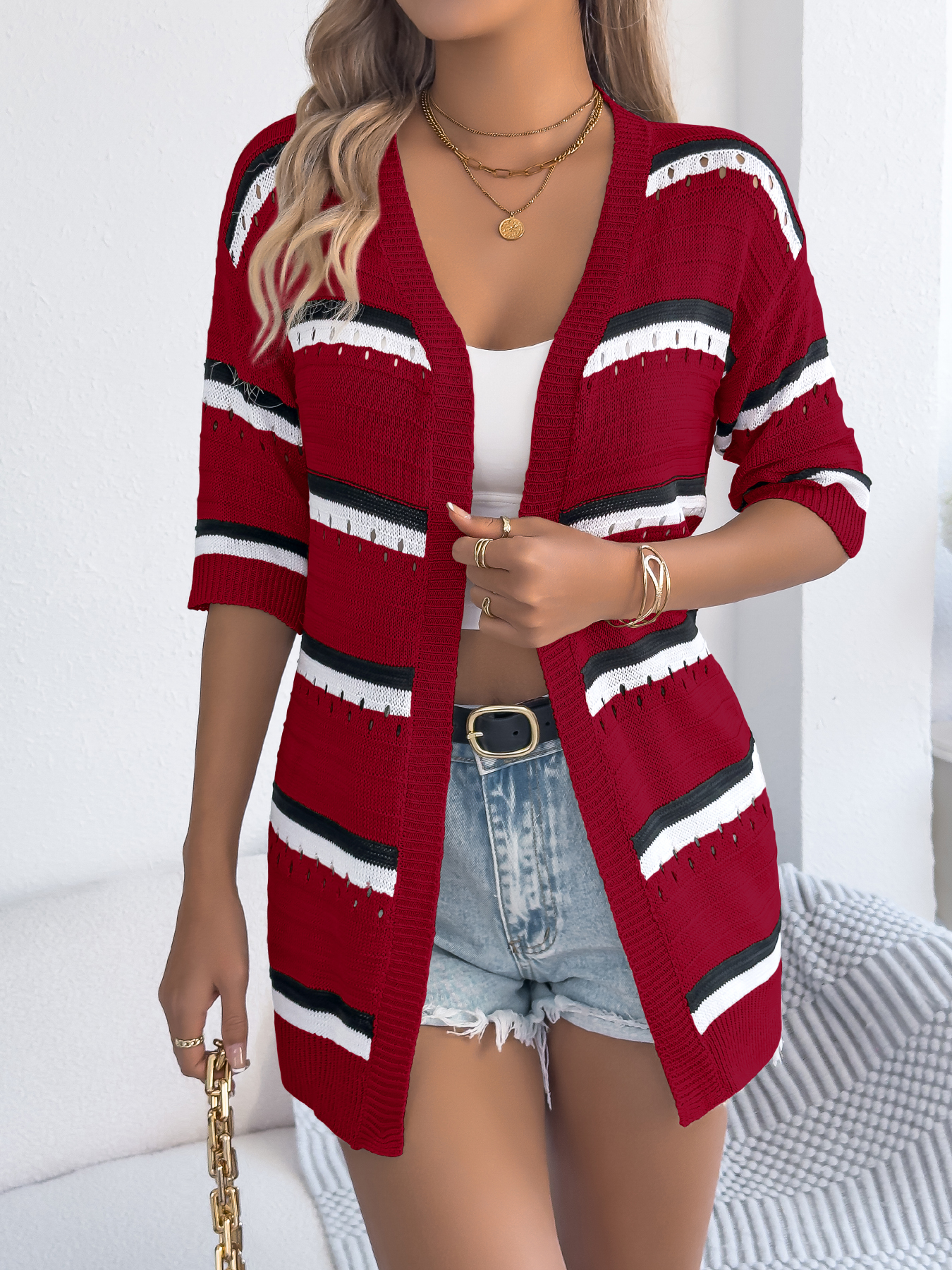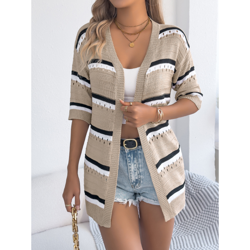 Women Casual Stripe Hollow Out Mid-Sleeve Knit Vacation Cardigan