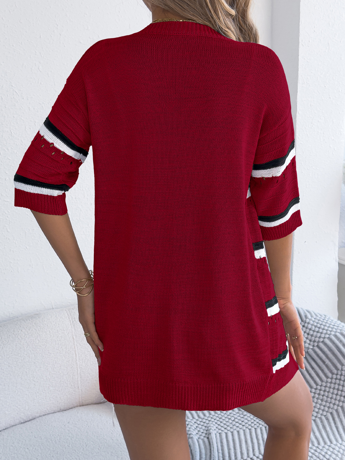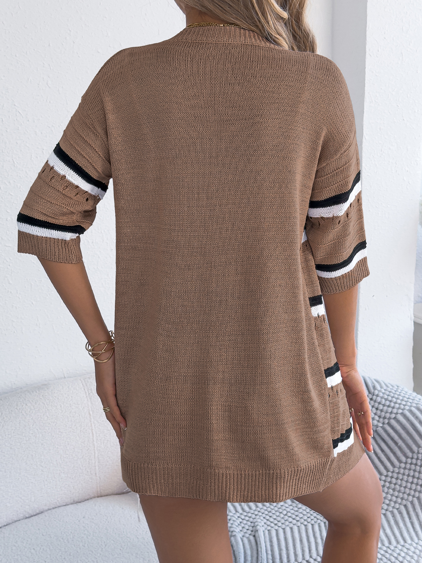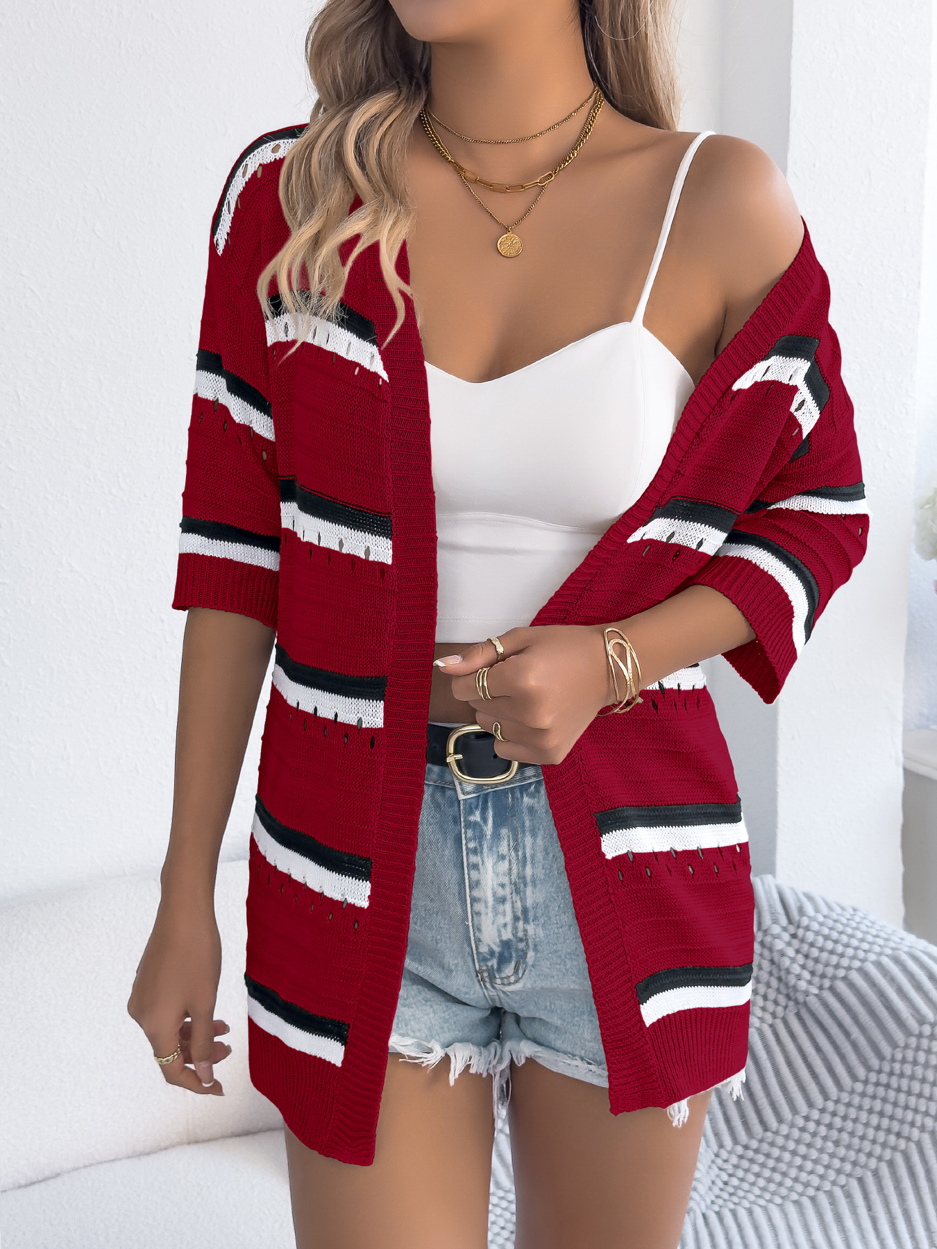 Women Casual Stripe Hollow Out Mid-Sleeve Knit Vacation Cardigan