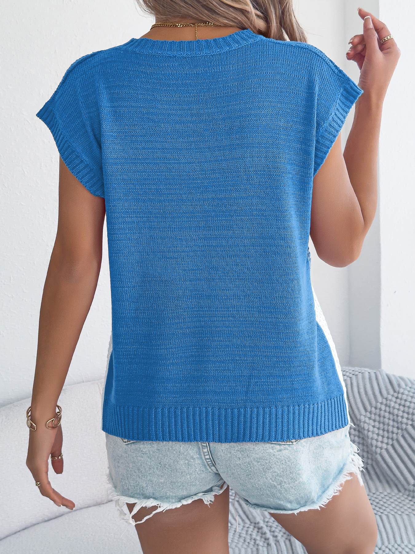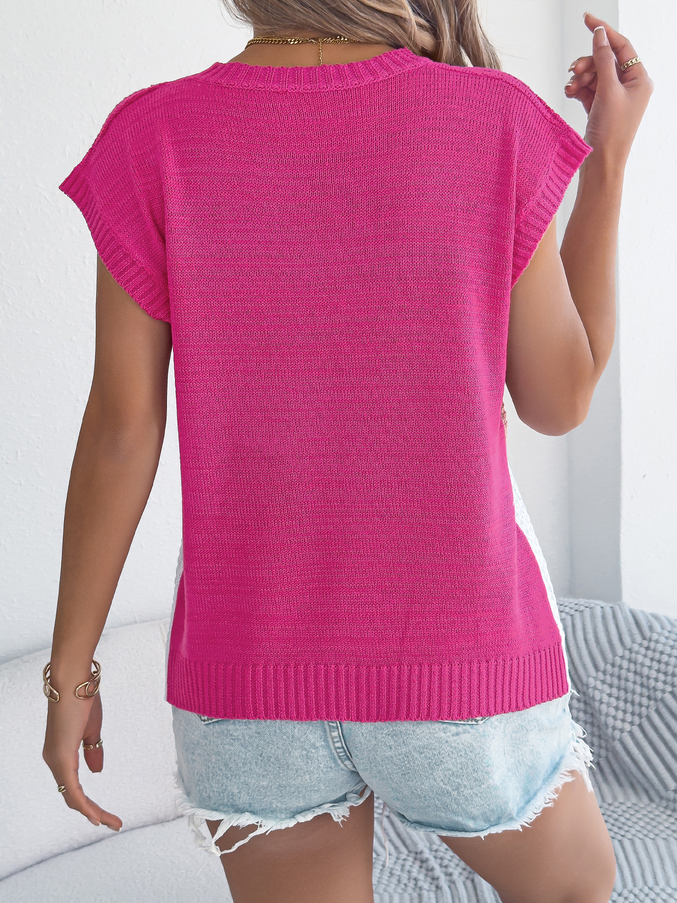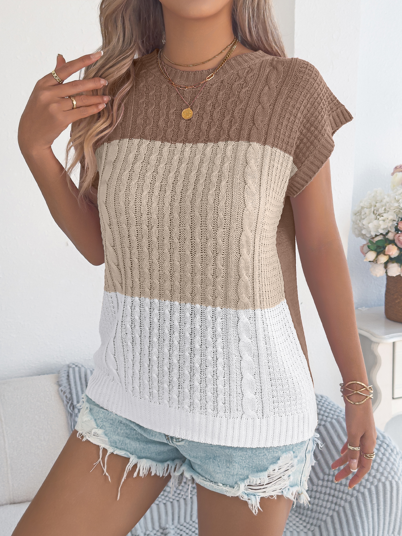 Women Color Block Cable Knit Casual Batwing Sleeve Loose Vacation Top