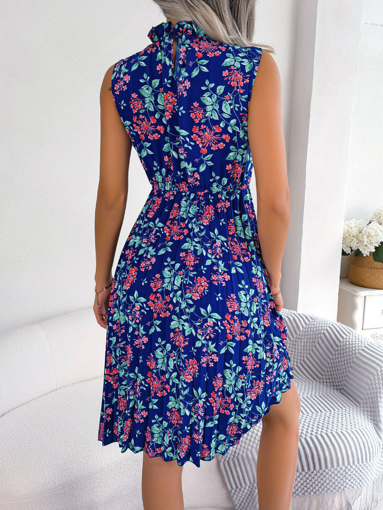 Women Elegant Ruffle Trim Floral Print Tie Waist Pleated Dress