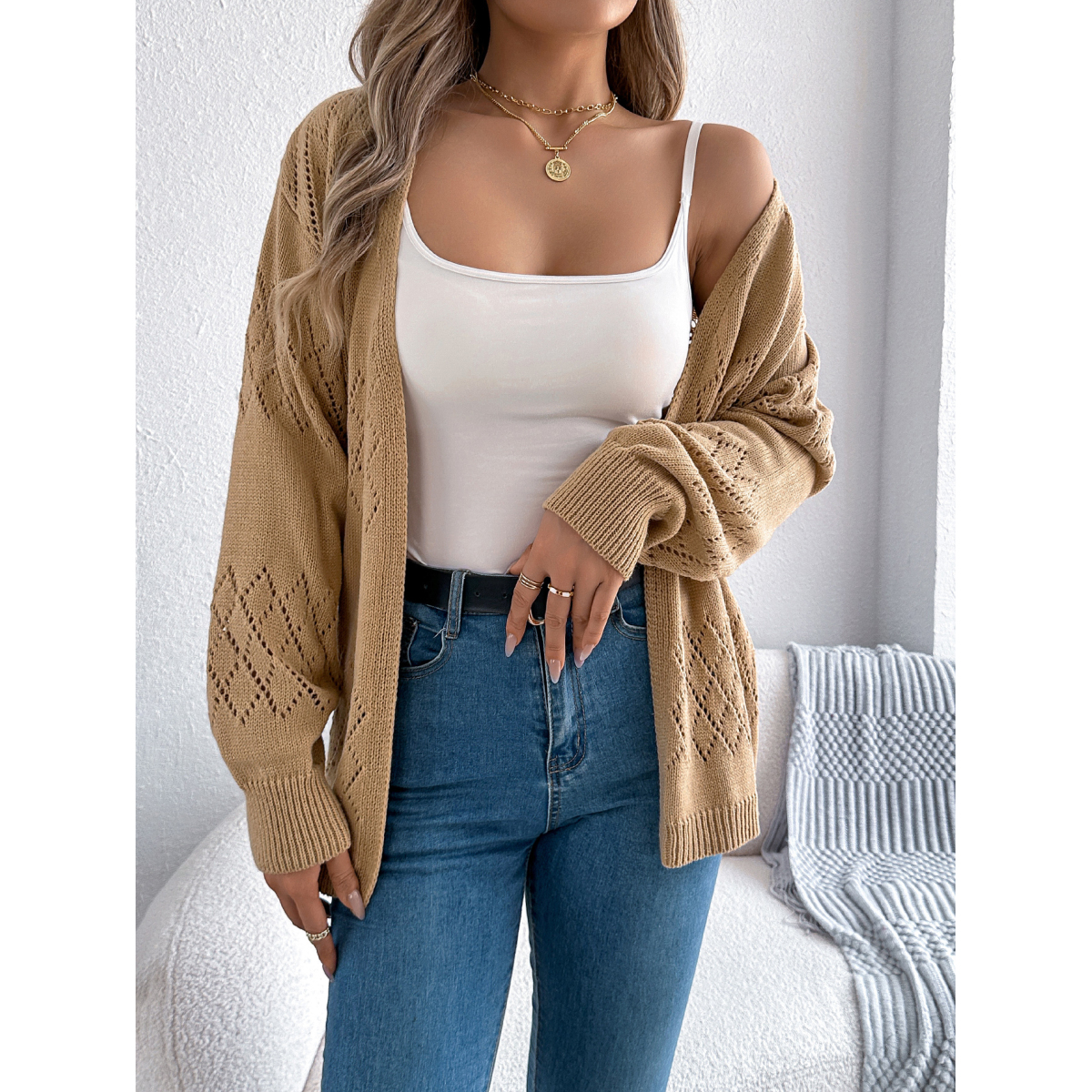 Women Casual Solid Color Hollow Out Lantern Sleeve Mid-Length Cardigan Sweater