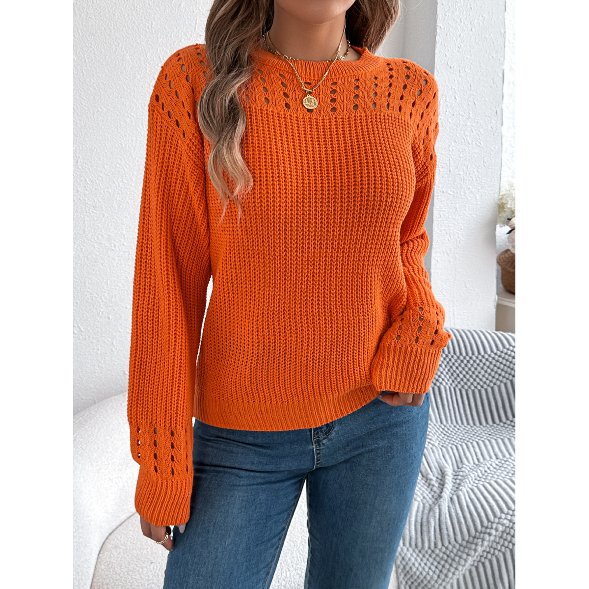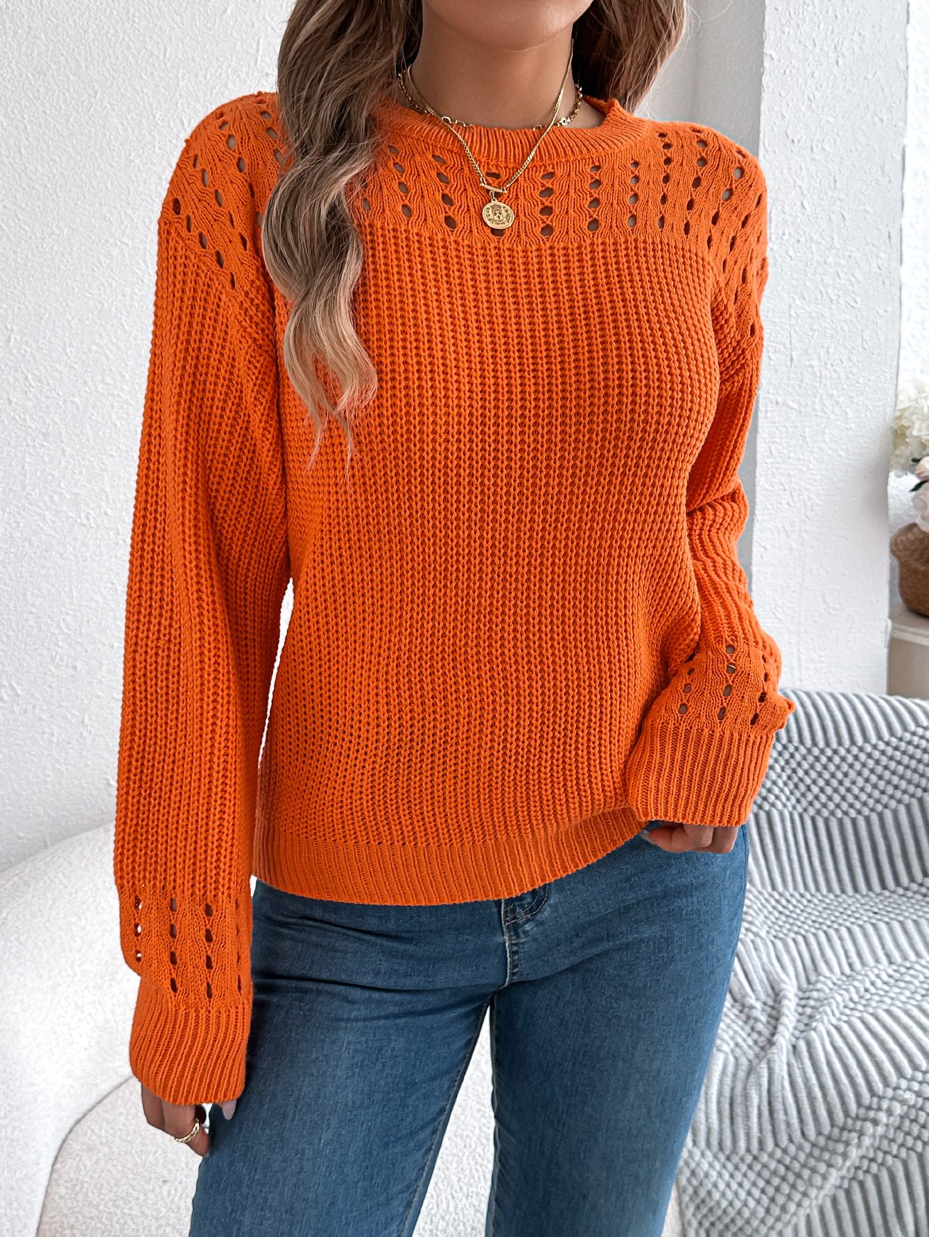 Women Casual Solid Color Hollow Out Lantern Sleeve Pullover Sweater