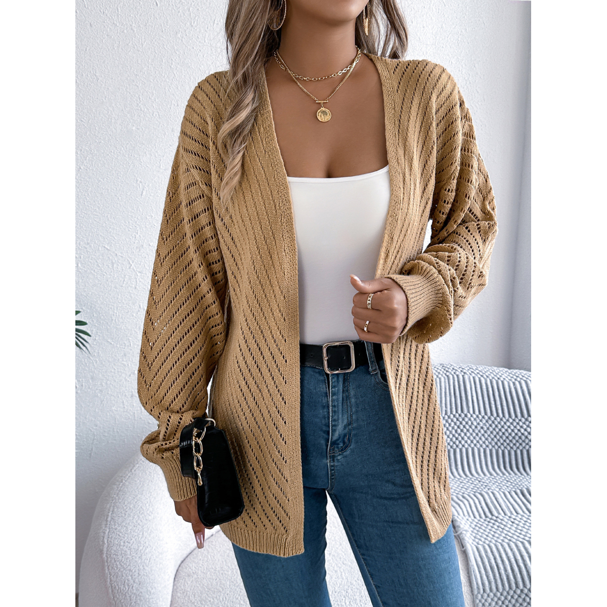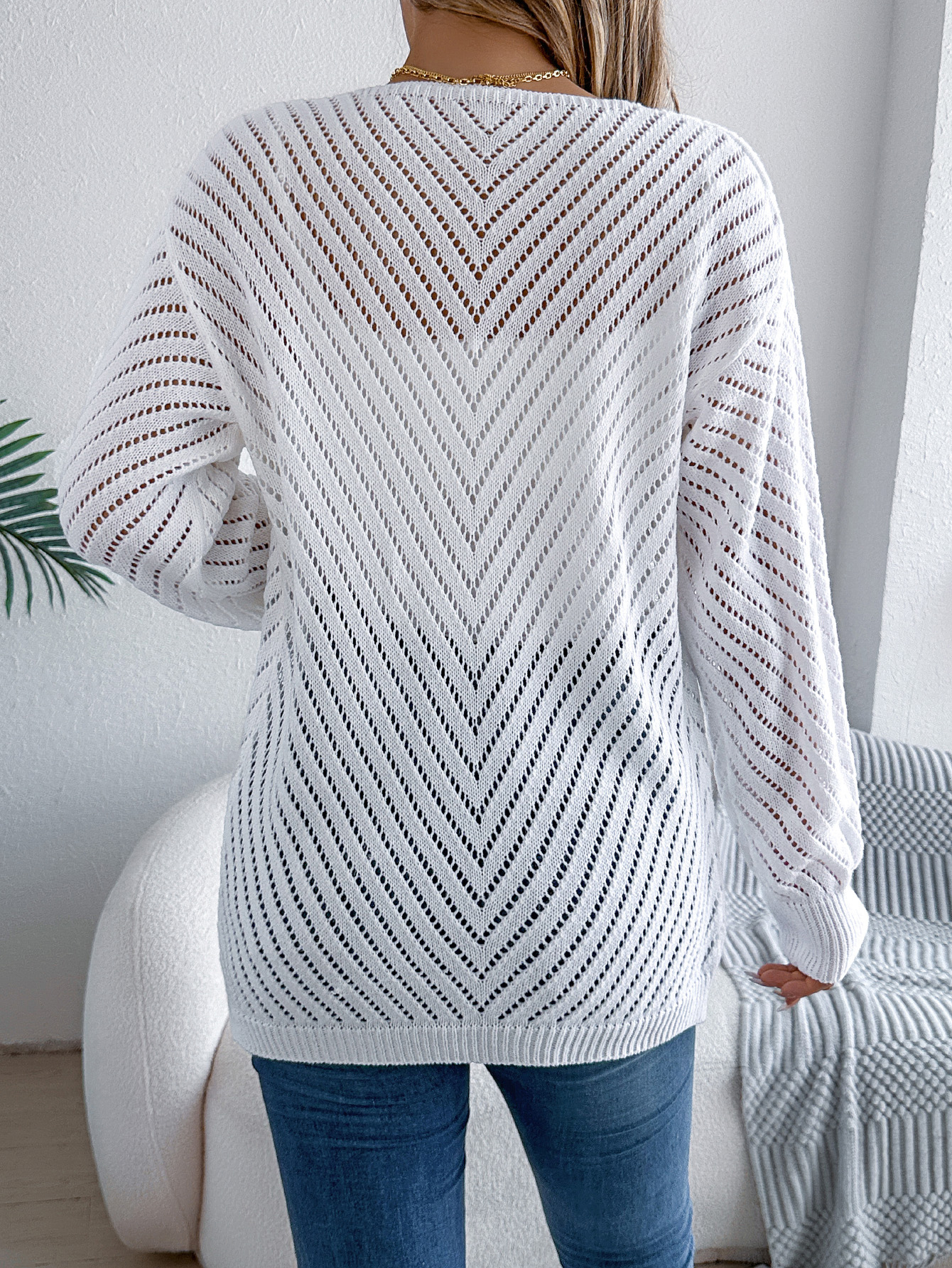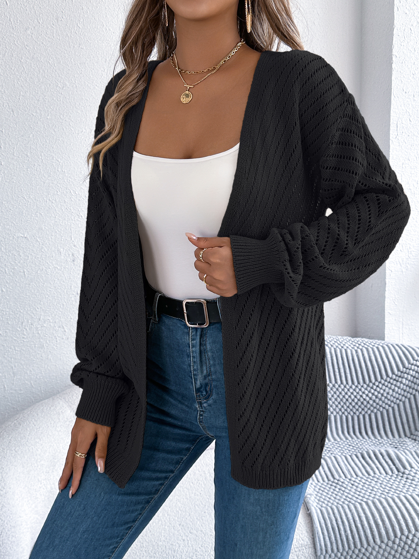 Women Casual Solid Color Hollow Out Long Sleeve Cardigan Sweater