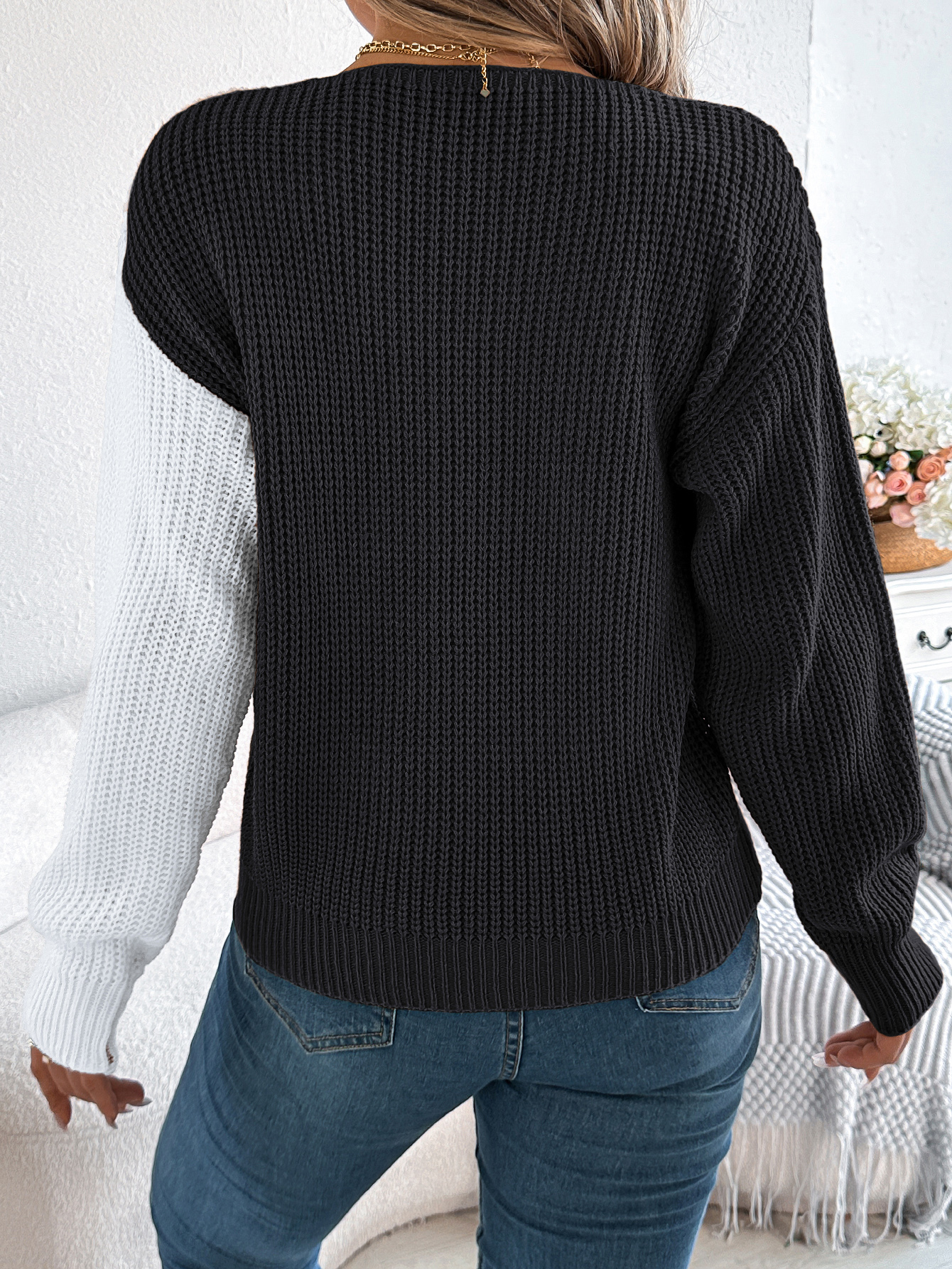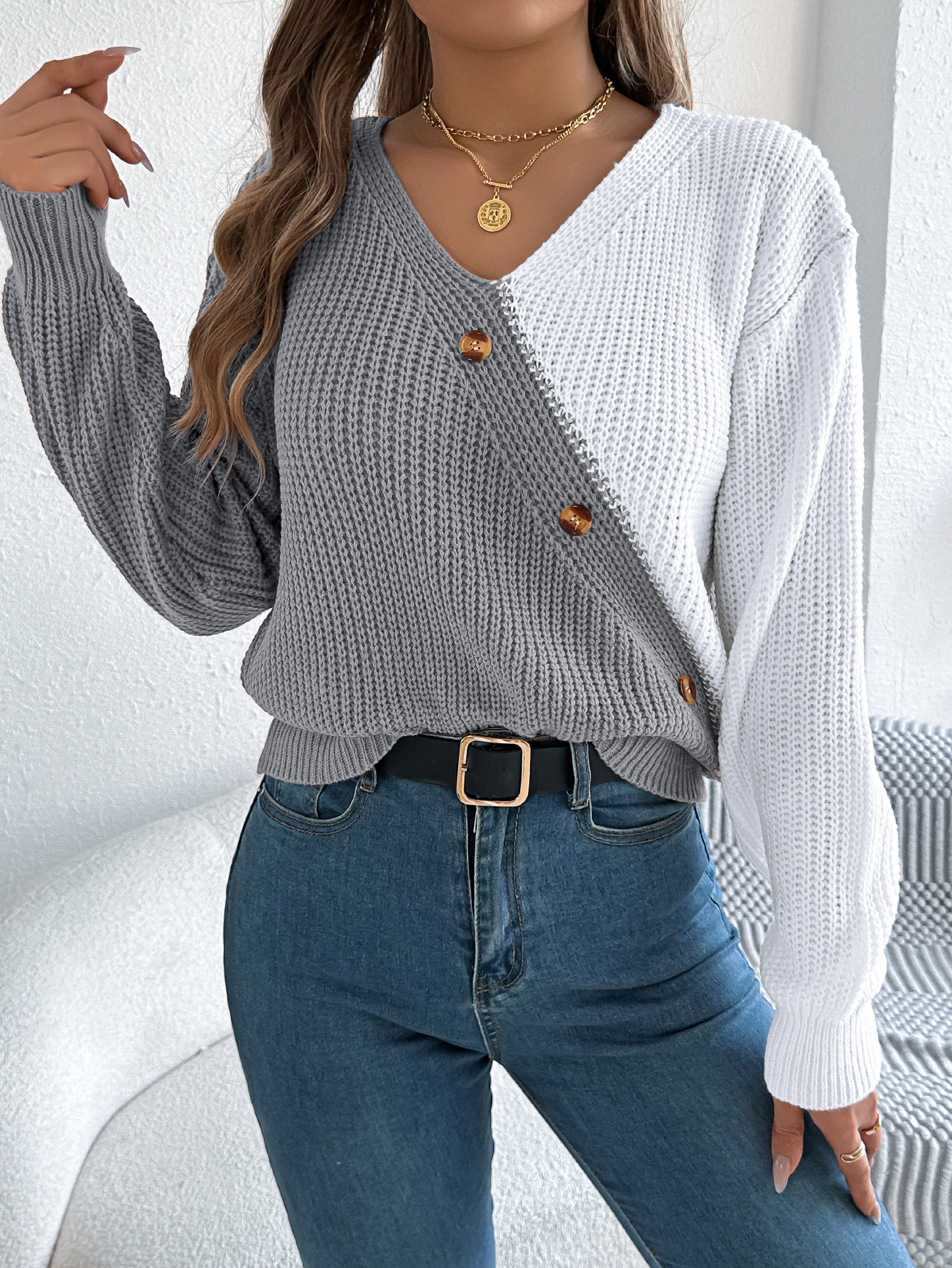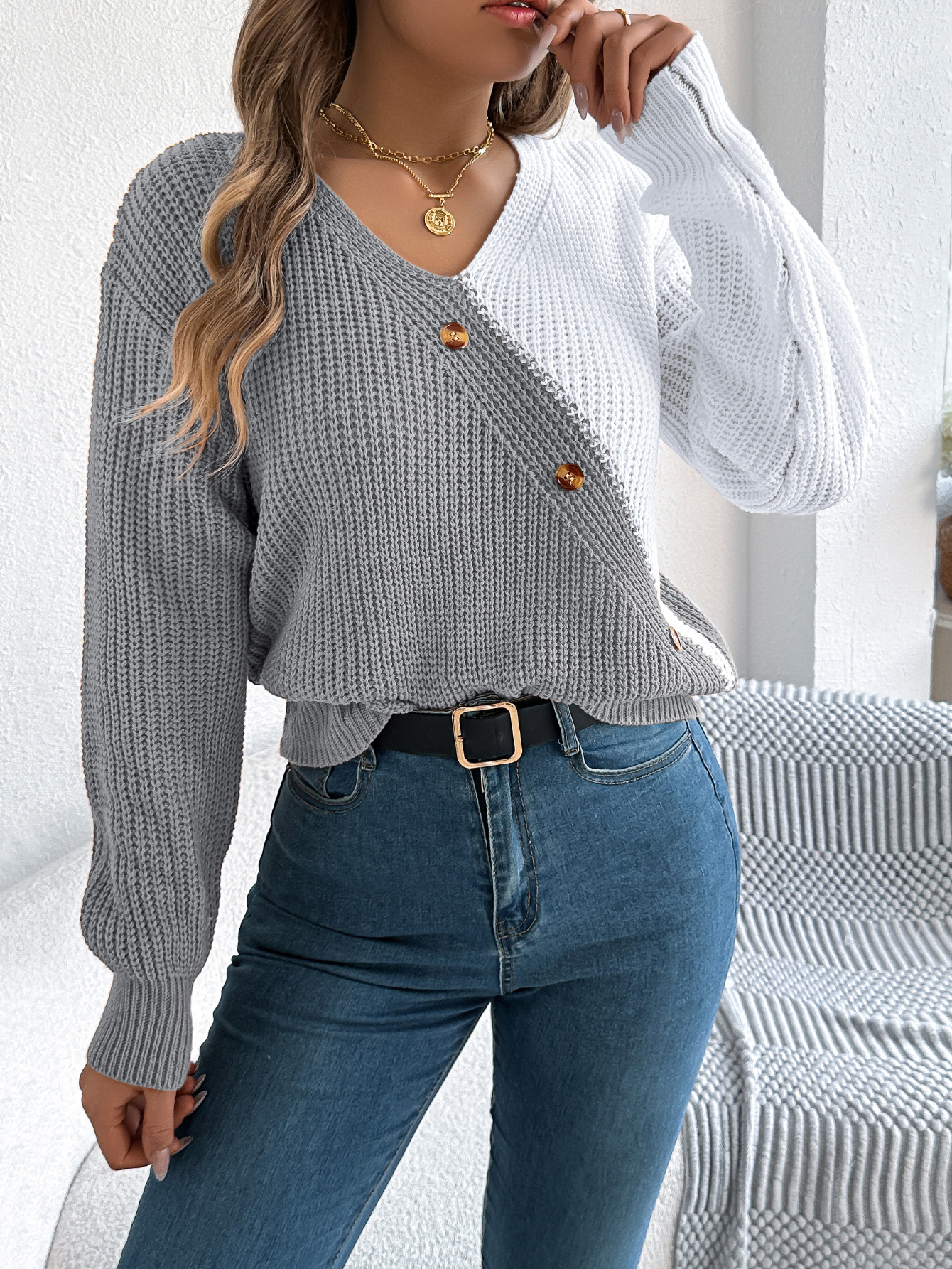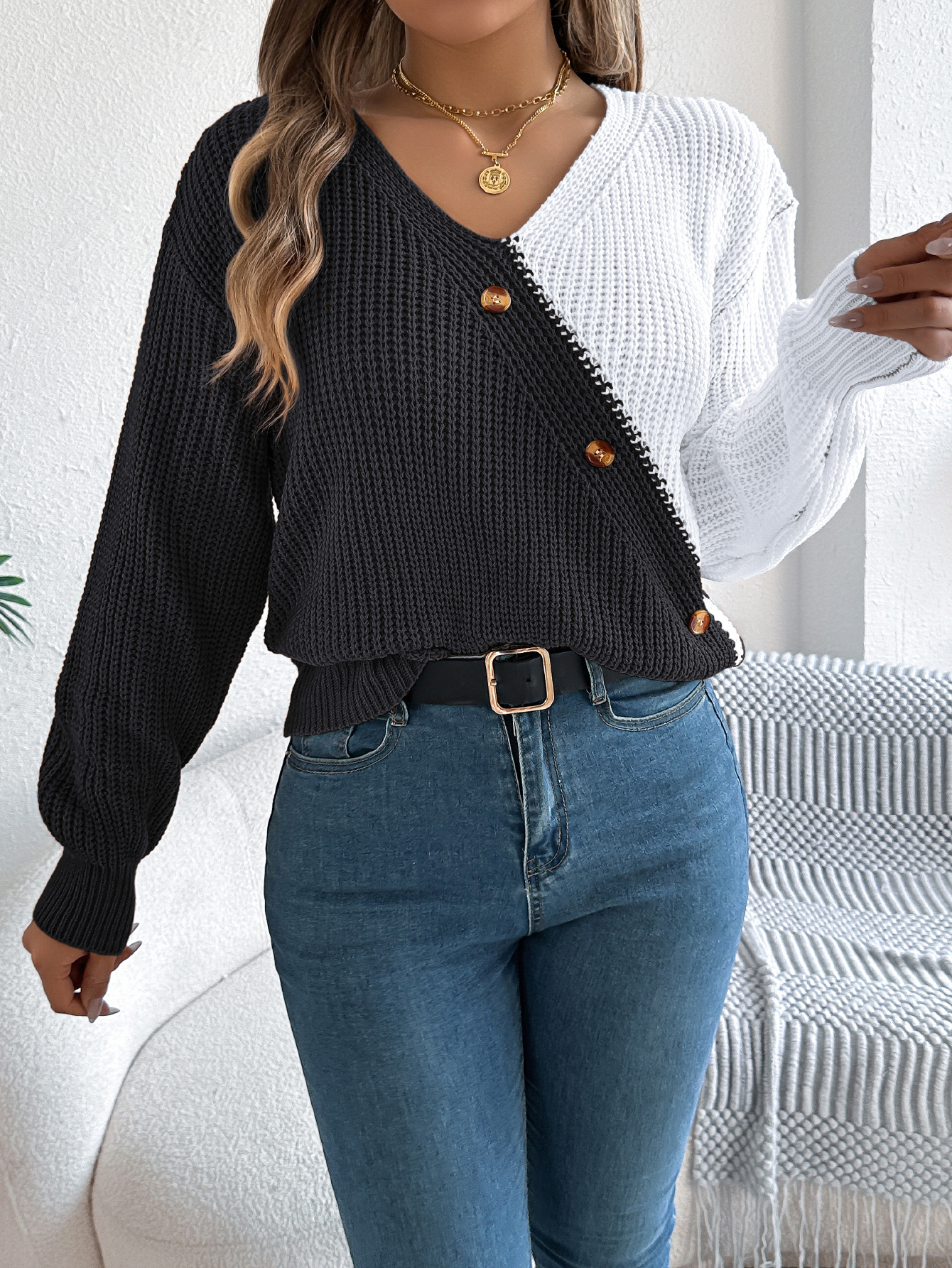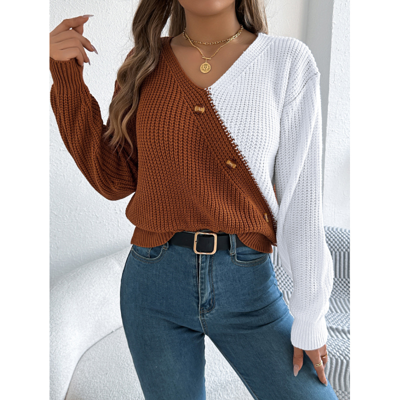 Women Casual V-Neck Button Color Block Lantern Sleeve Pullover Sweater
