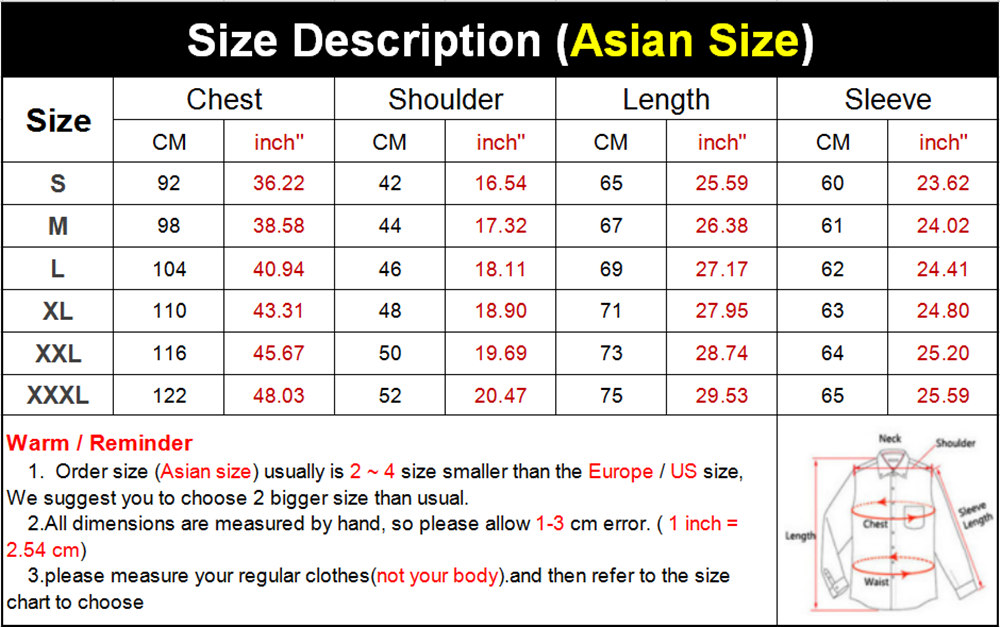 1. Asian sizes are 1 to 2 sizes smaller than European and American people. Choose the larger size if your size between two sizes. Please allow 2-3cm differences due to manual measurement.