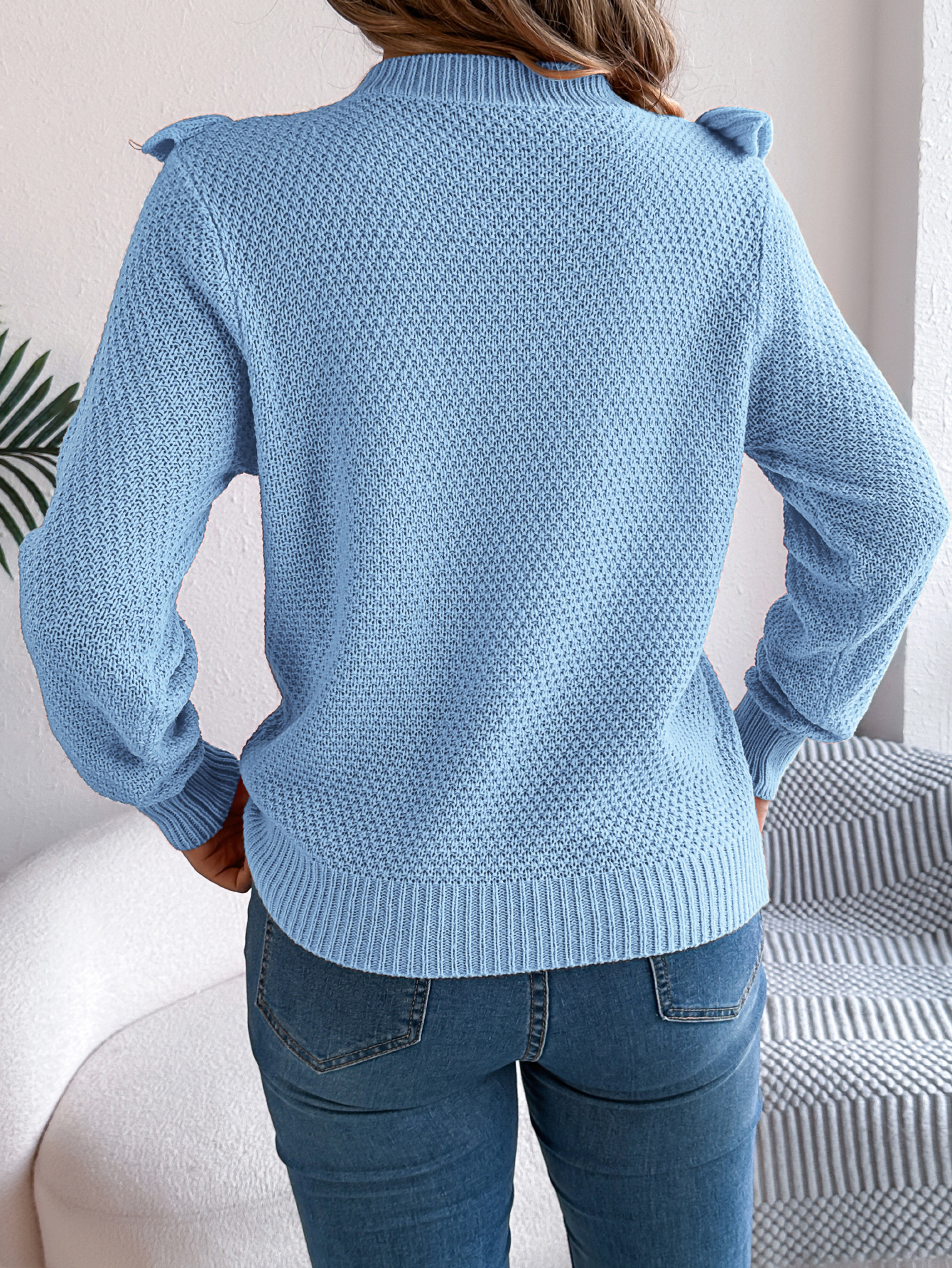 Women Elegant Solid Color Ruffled Long Sleeve Pullover Sweater