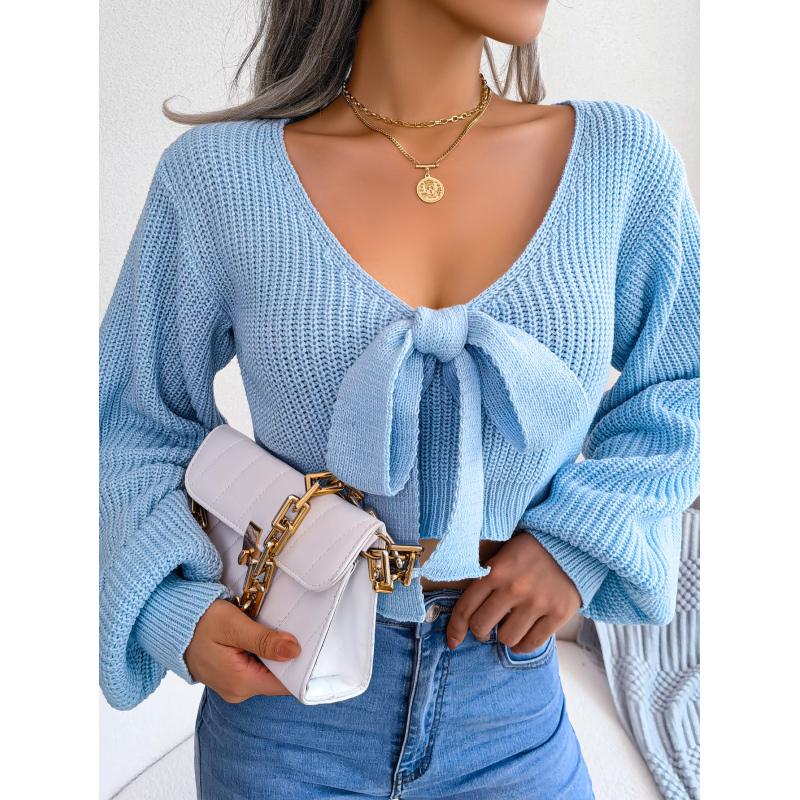 Women Fashion Bow V-Neck Lantern Sleeve Cropped Sweater