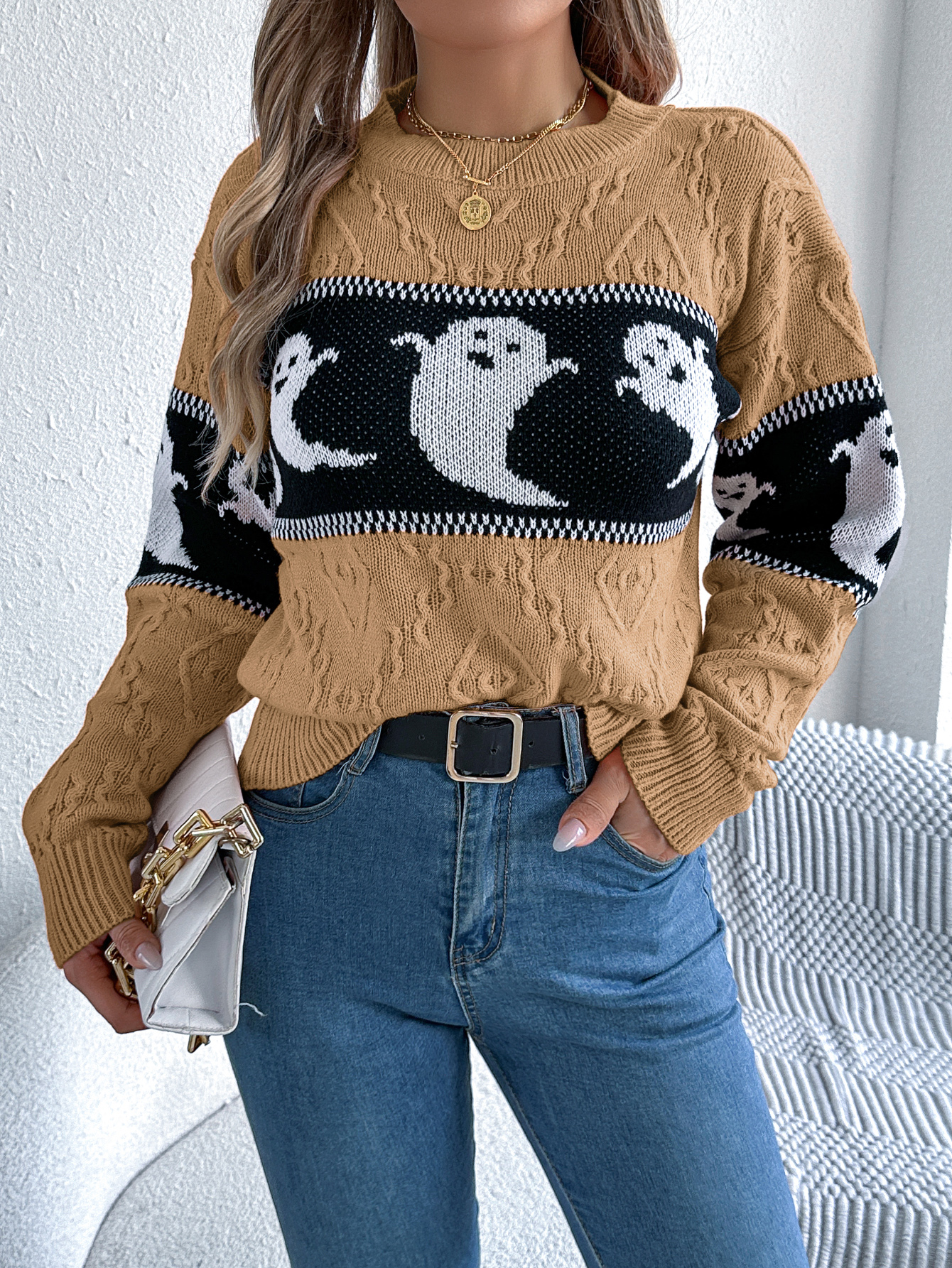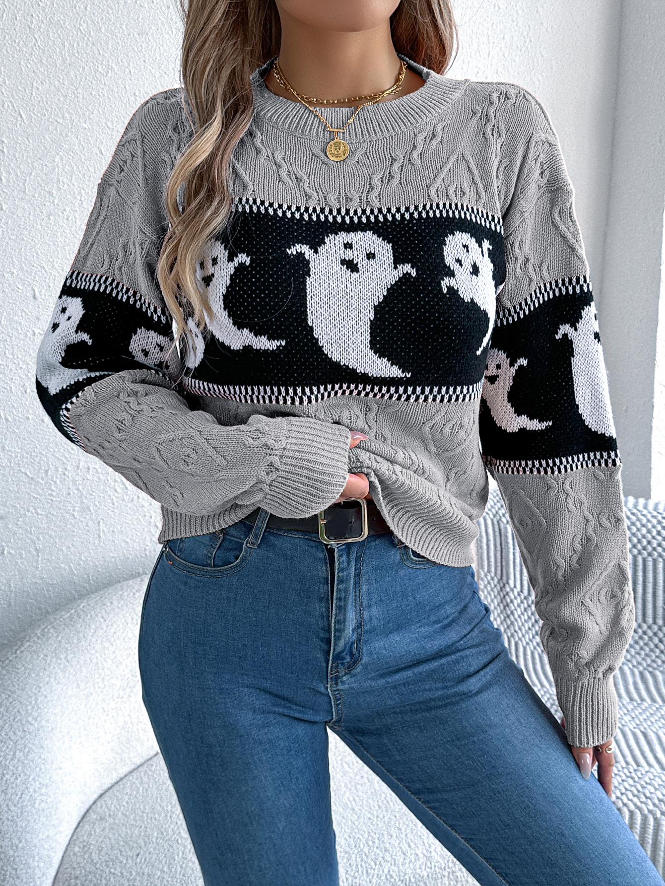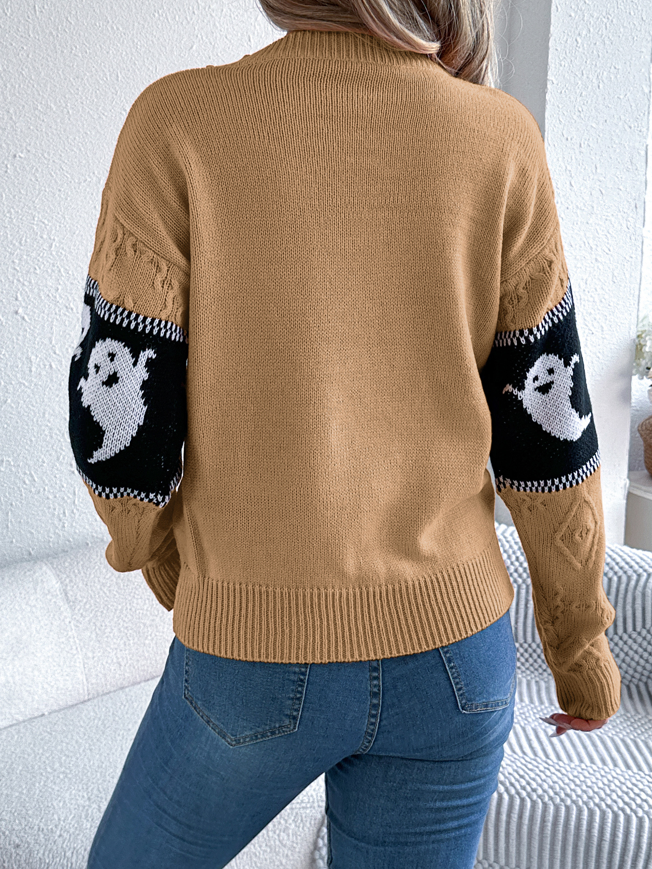 Women Ghost Color Block Long Sleeve Pullover Sweater