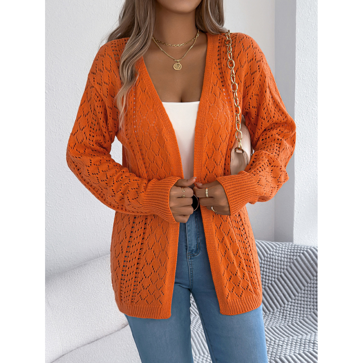 Women Hollow Out Lantern Sleeve Long Sleeve Cardigan Sweater Coat