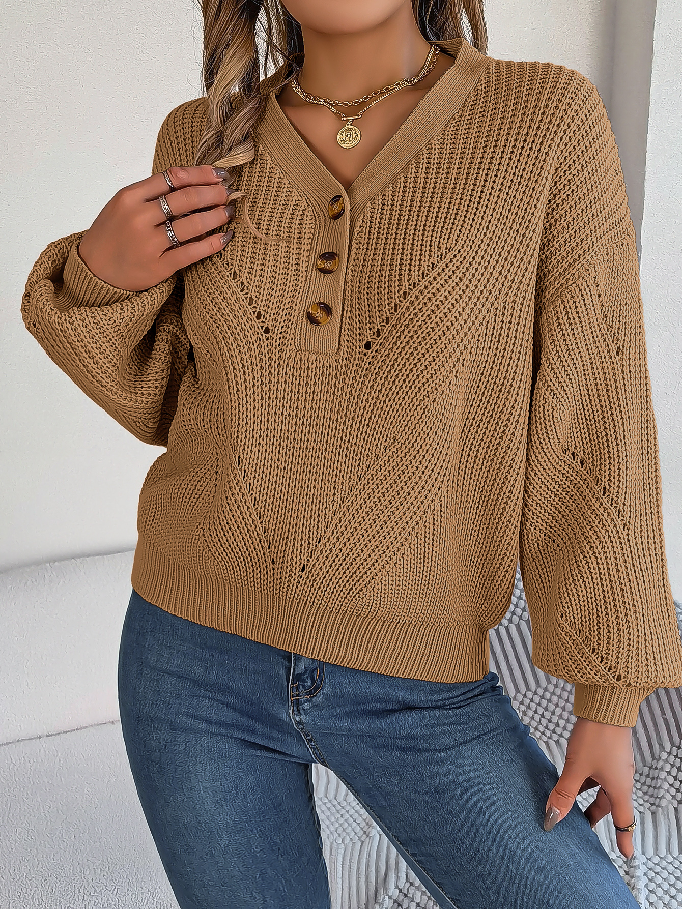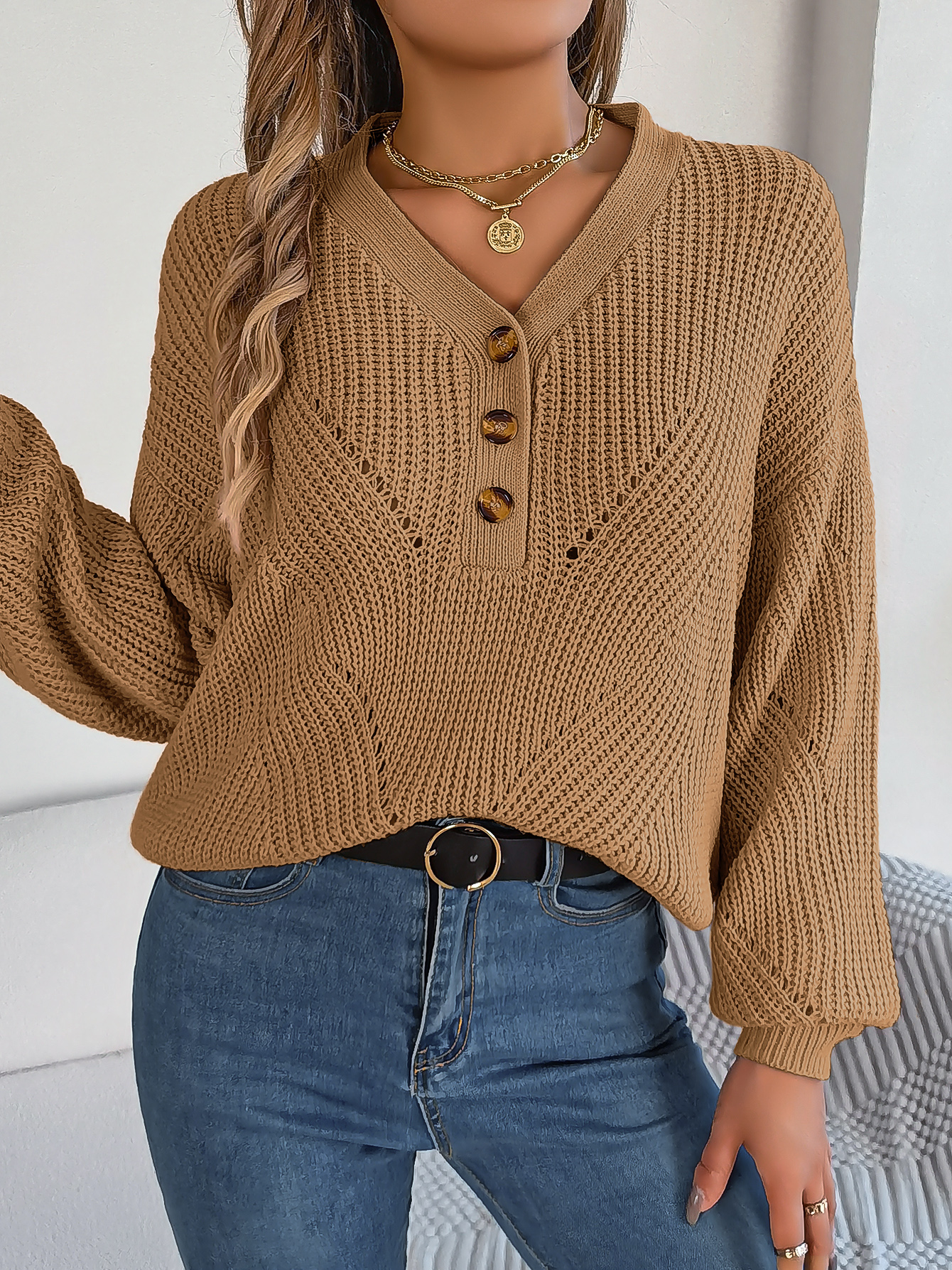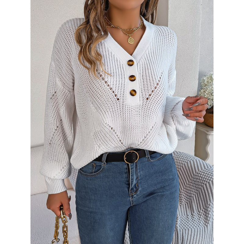 Women Hollow Out V-Neck Button Lantern Sleeve Pullover Sweater
