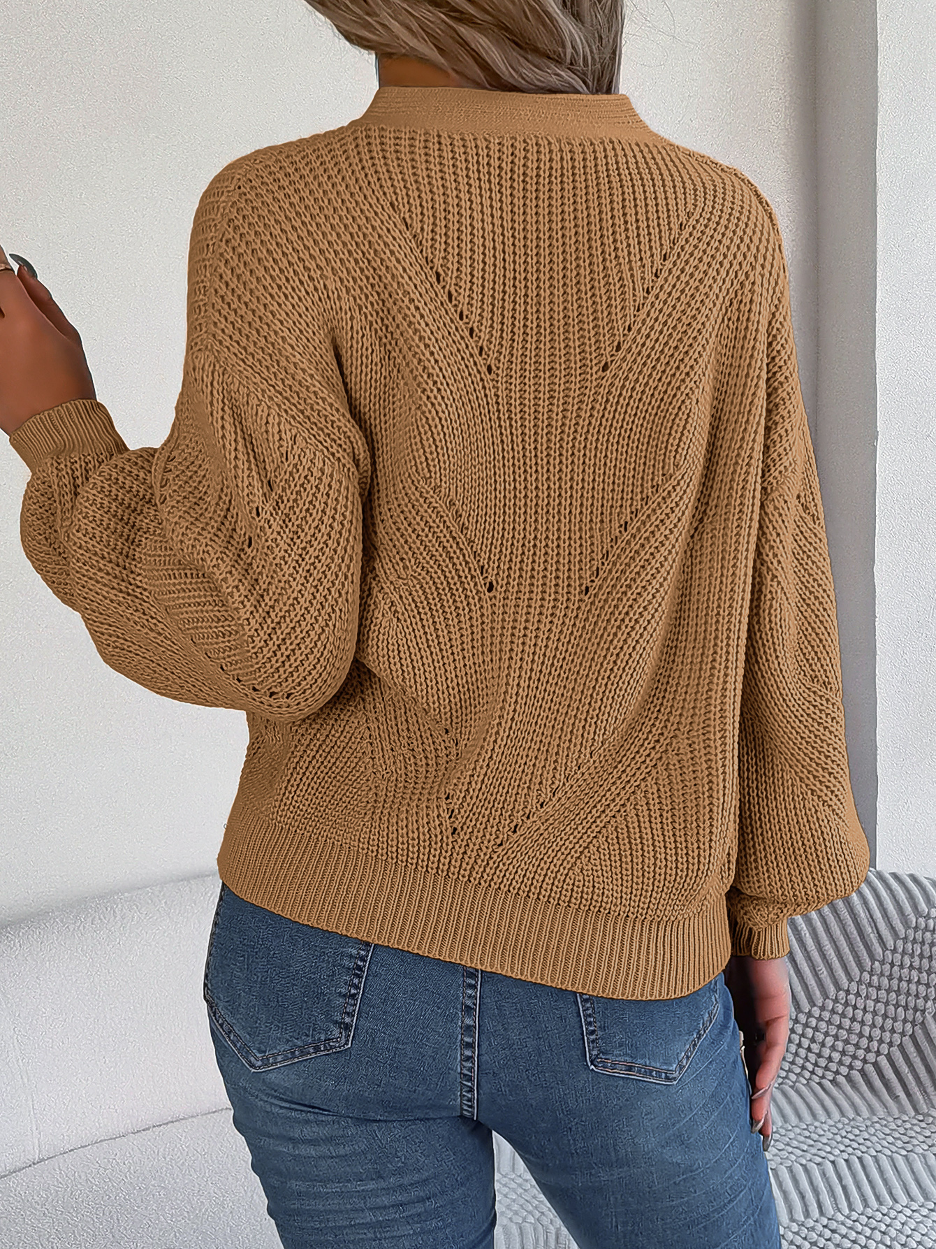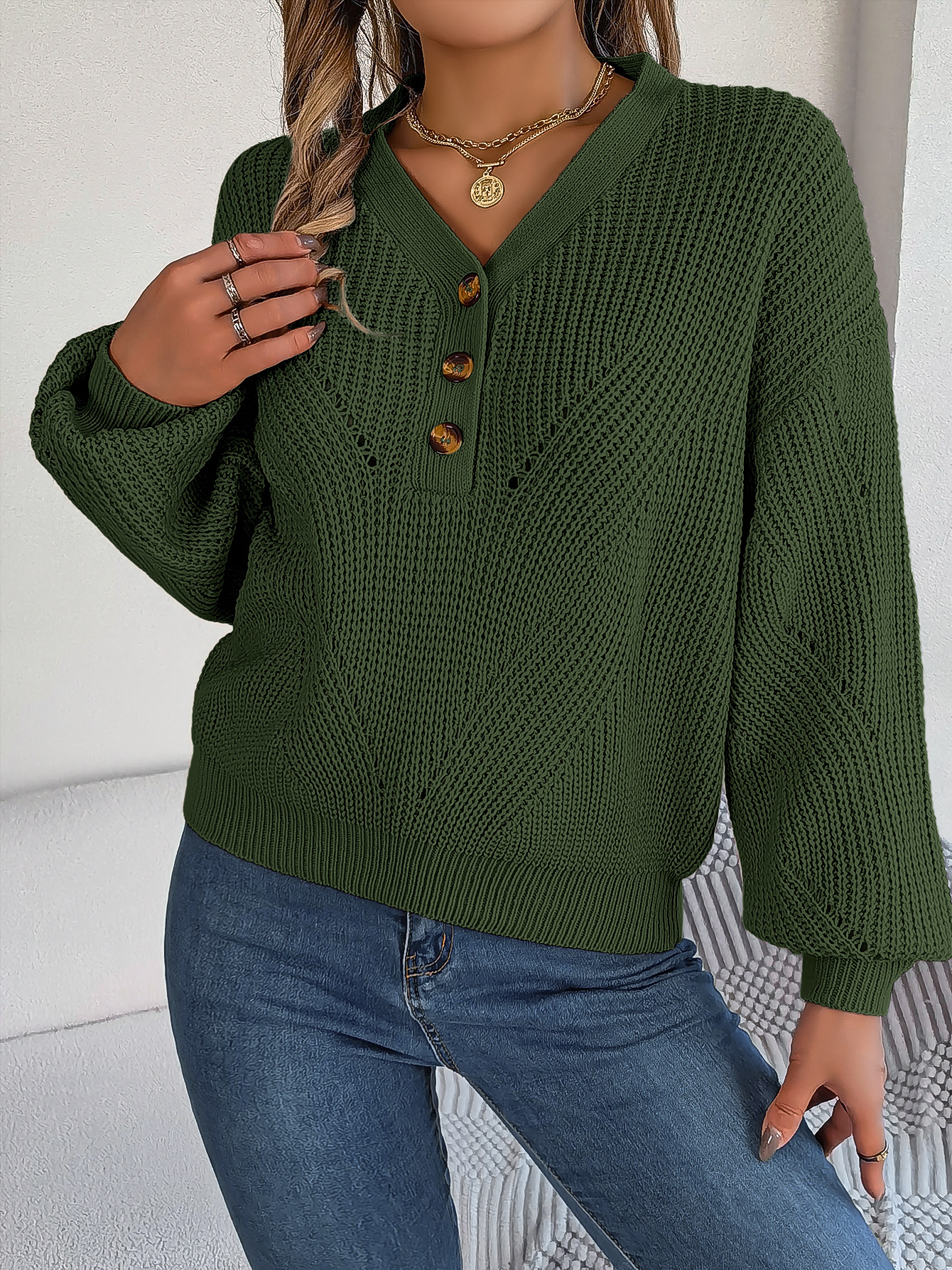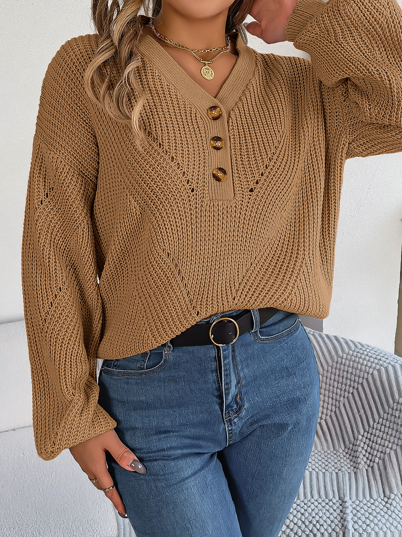 Women Hollow Out V-Neck Button Lantern Sleeve Pullover Sweater