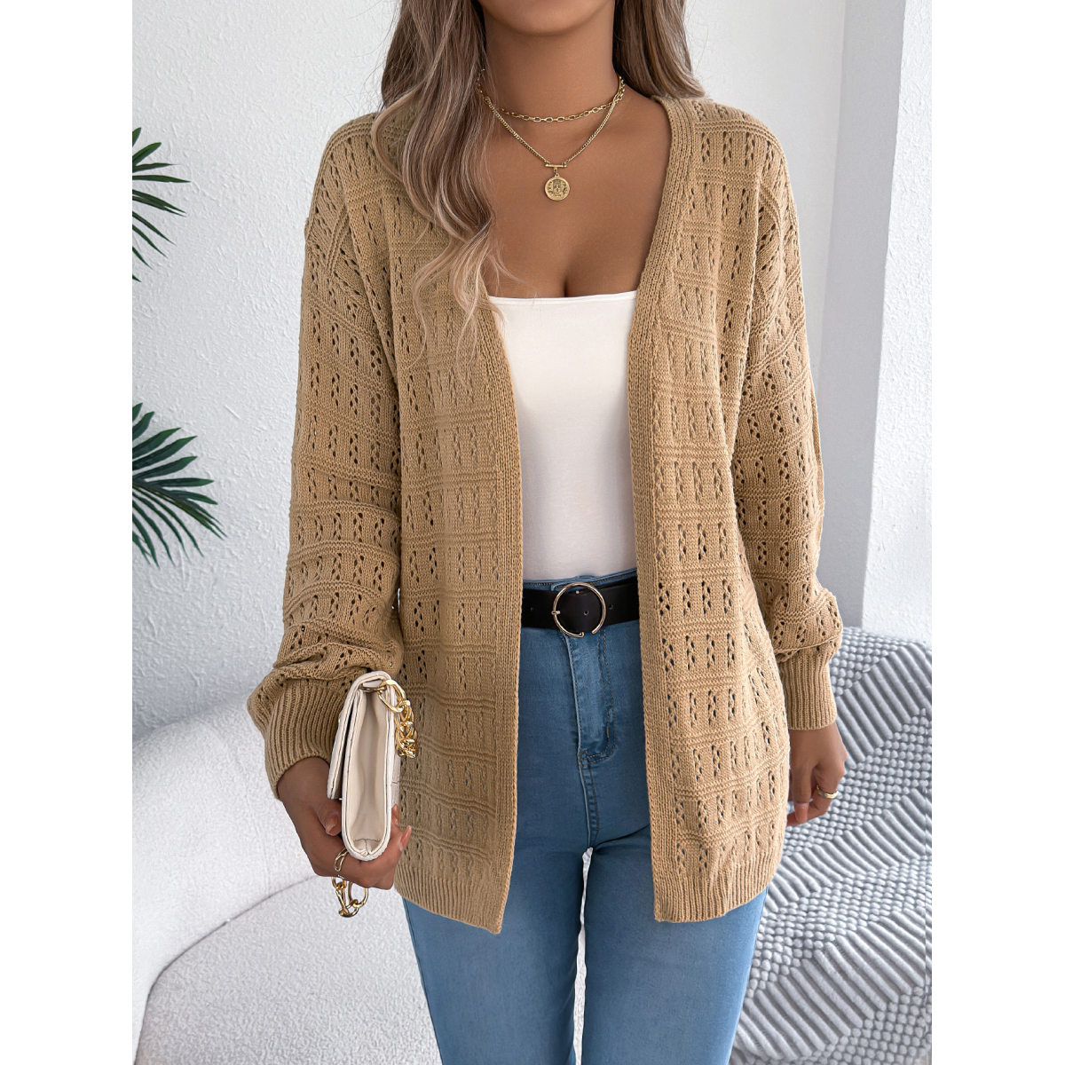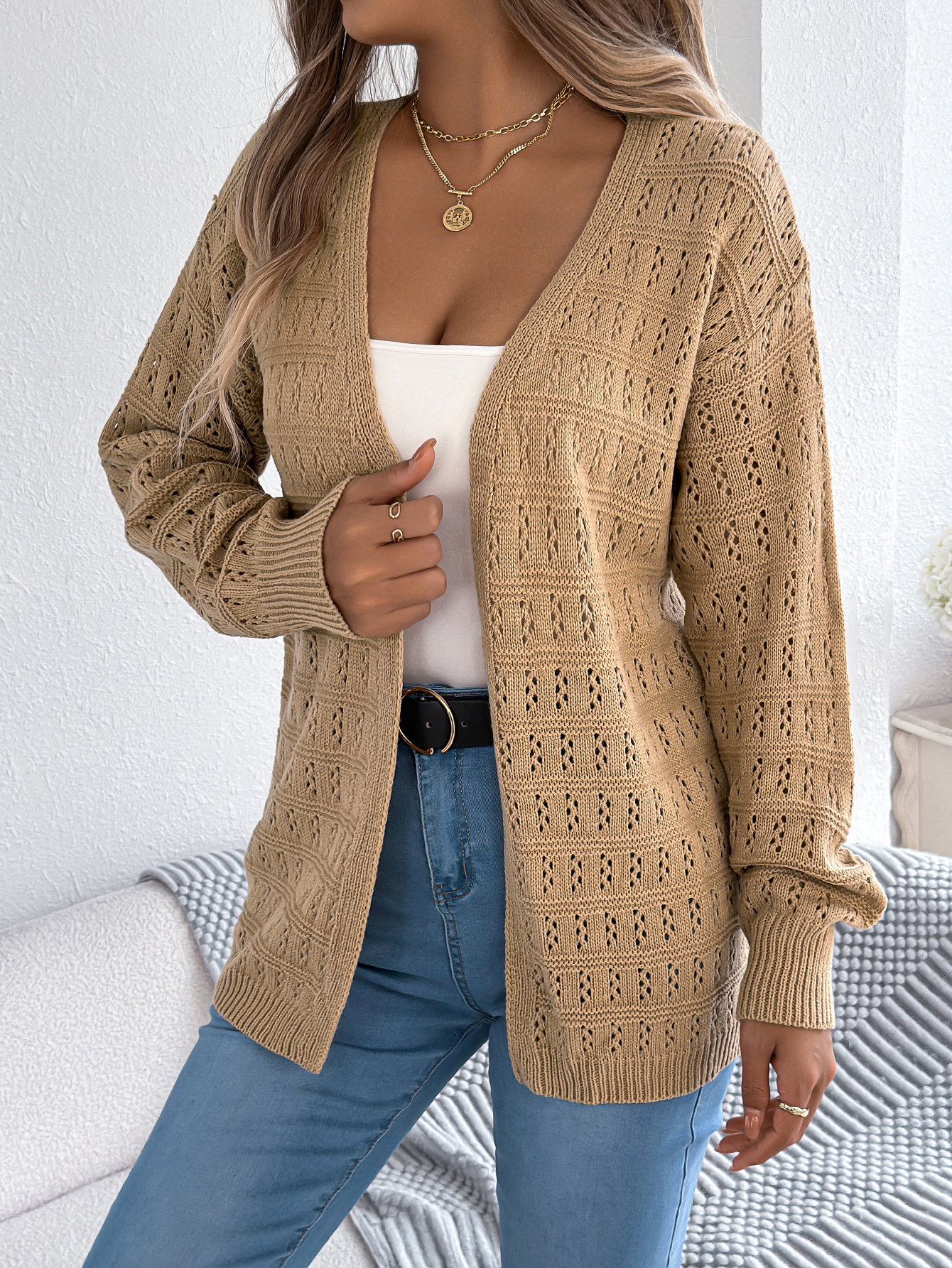 Women Solid Color Hollow Out Lantern Sleeve Long Sleeve Cardigan Sweater Coat