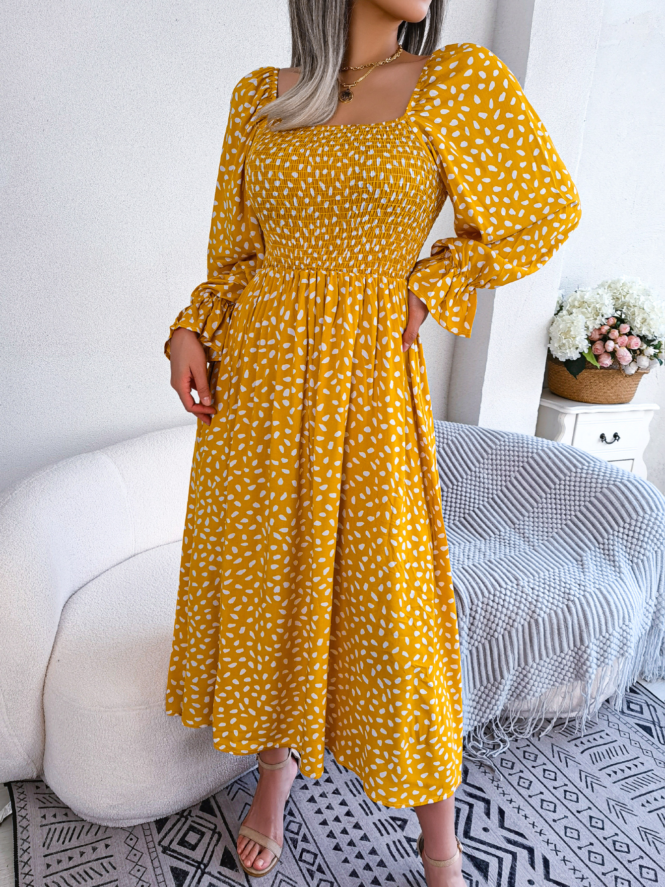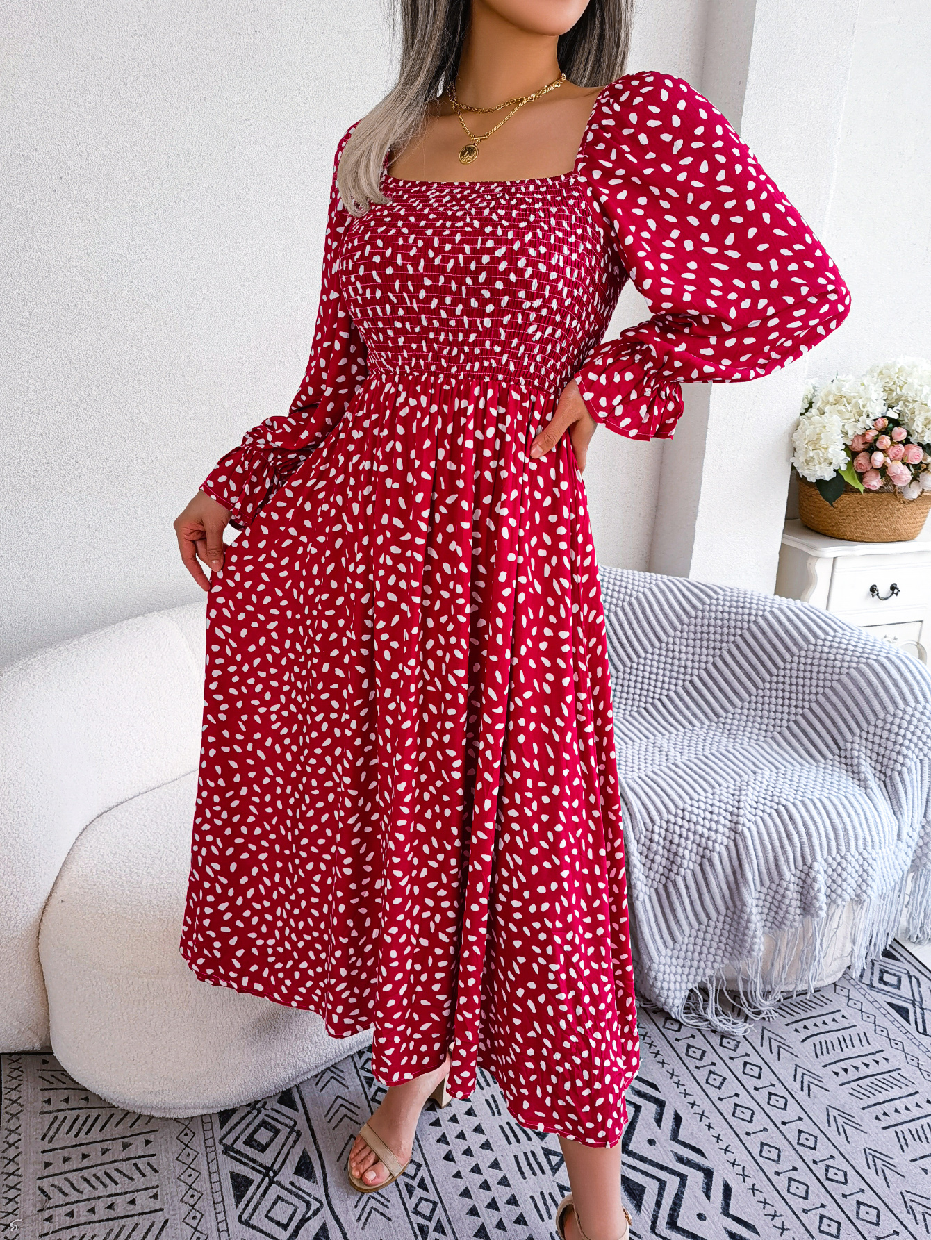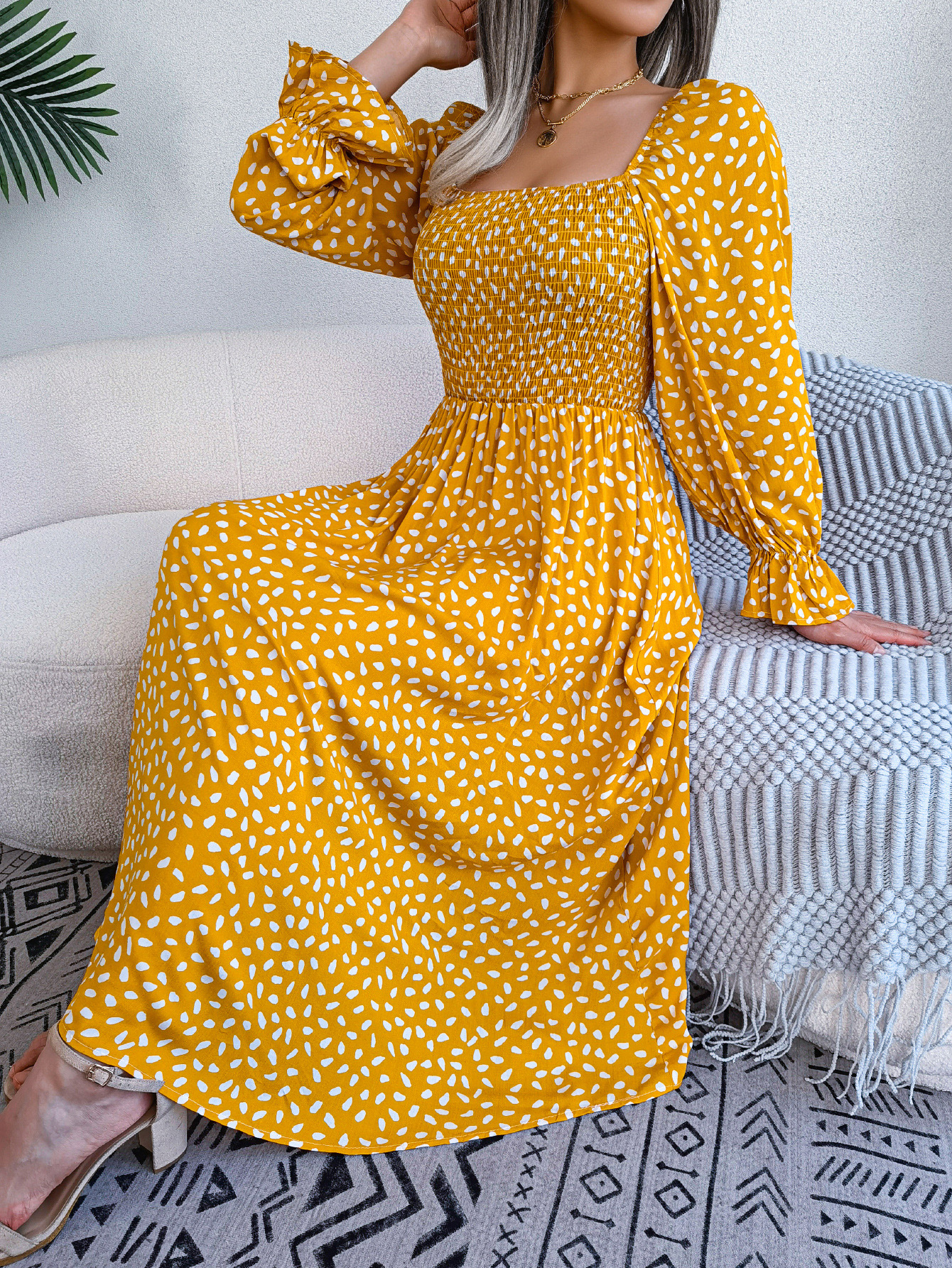 Women Square Neck Long Sleeve Vacation Rayon Pleated Maxi Dress