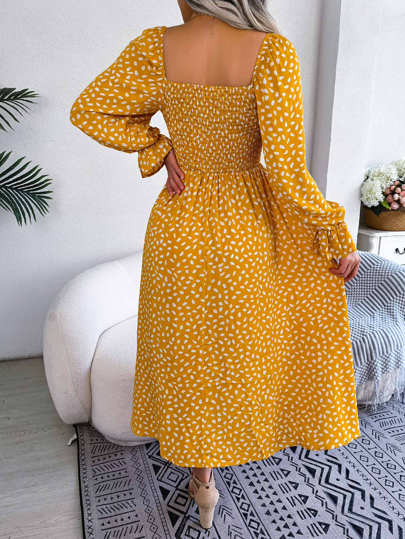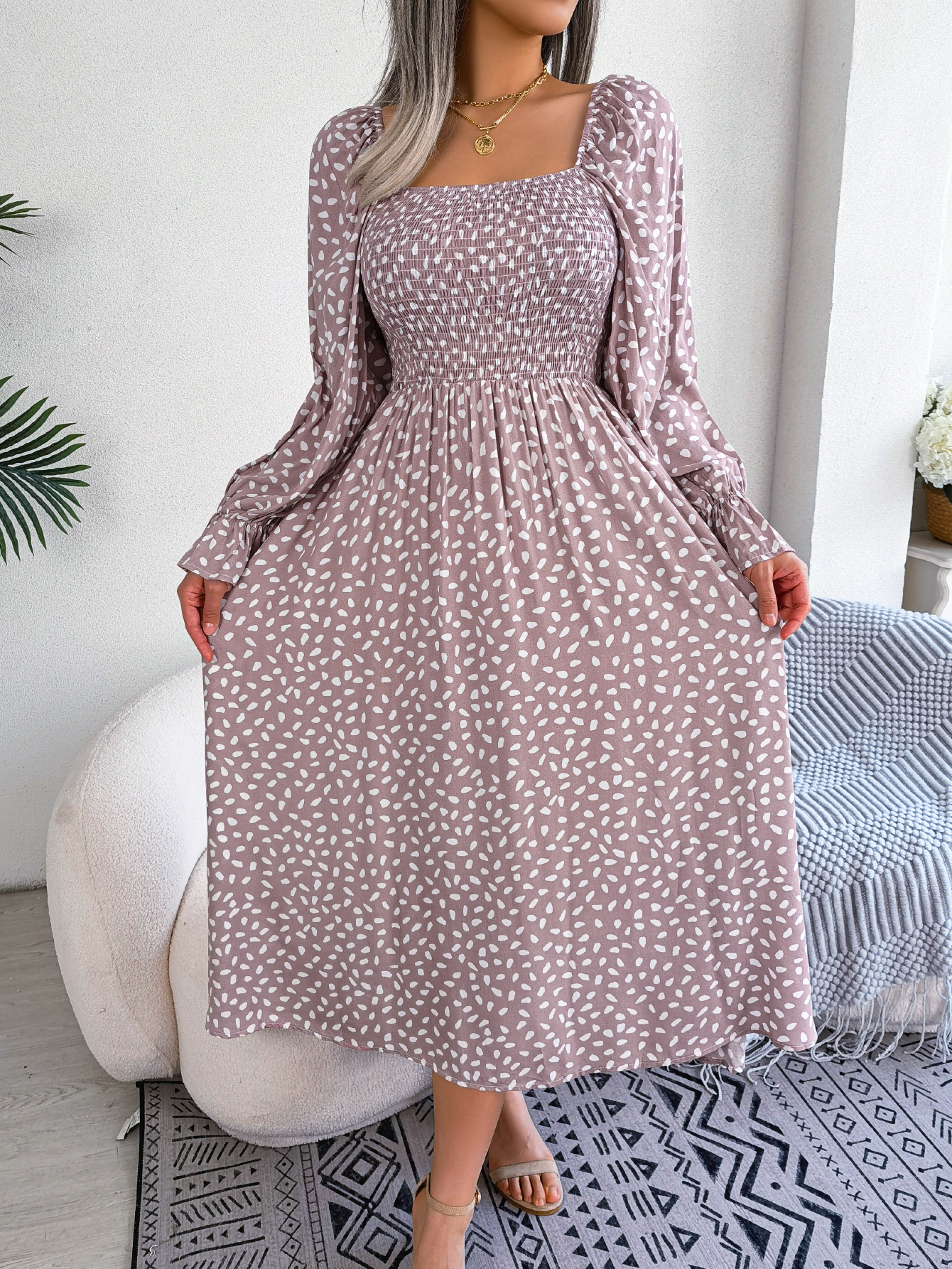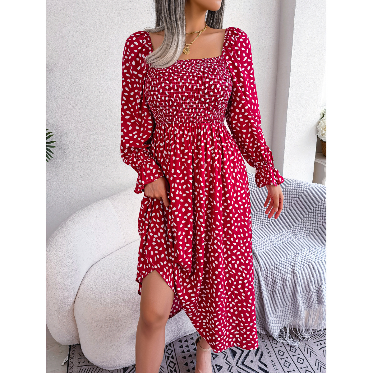 Women Square Neck Long Sleeve Vacation Rayon Pleated Maxi Dress