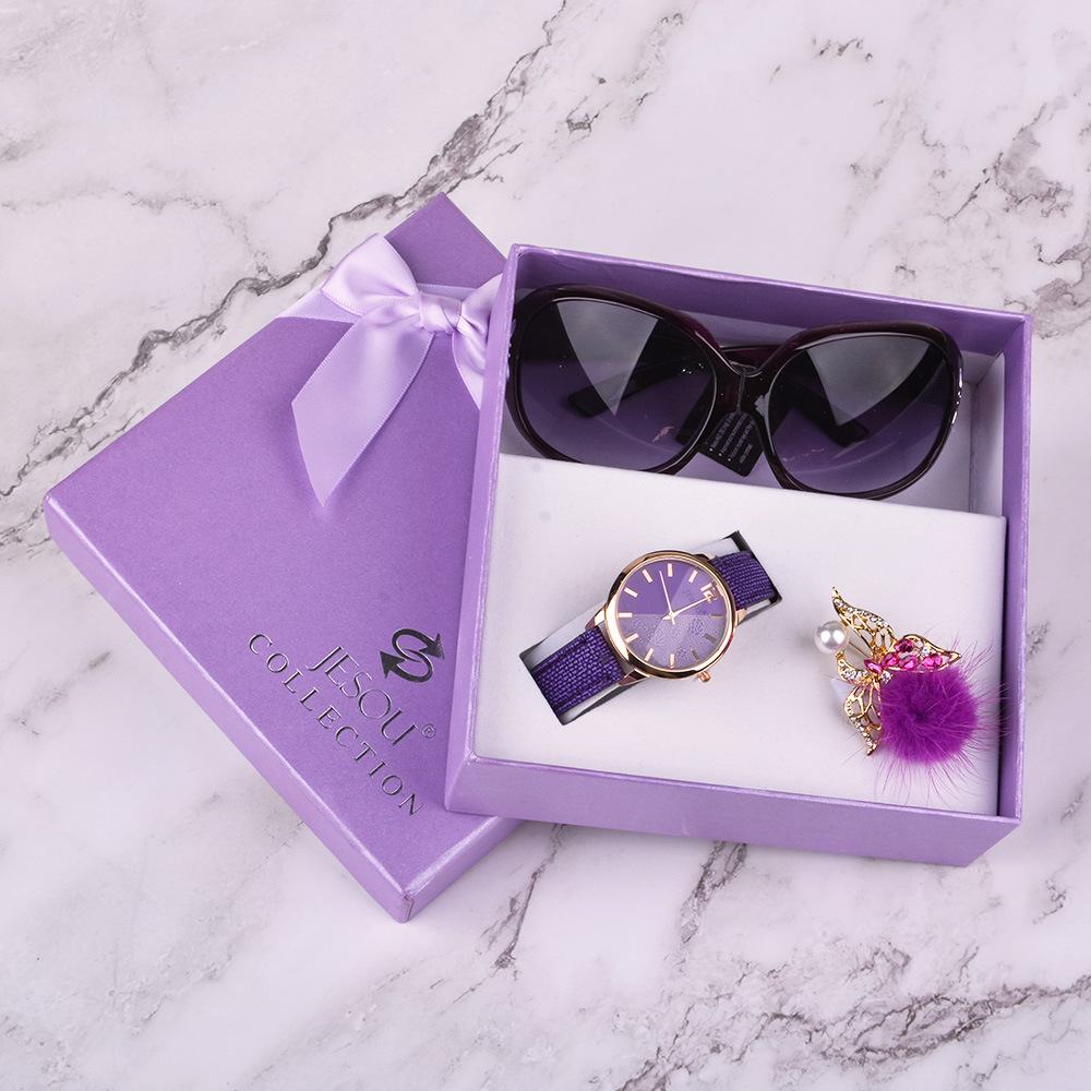 Women Watches Leather Quartz Wristwatch Sunglasses Corsage 3 Pcs Girl Christmas Gift New Year Gift Ladies Gift Box
