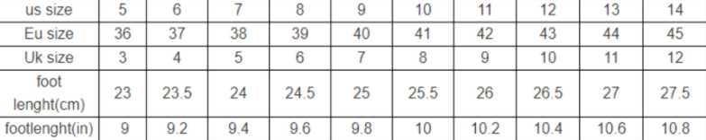 Sizes: 36 (US size 5), 37 (US size 6), 38 (US size 7), 39 (US size 8), 40 (US size 9), 41 (US size 10), 42 (US size 11) , 43 (US 12 yards), 44 (US 13 yards)