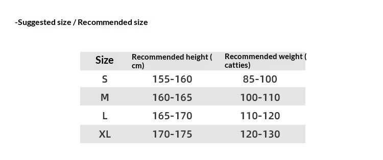 Size: S (85–100 jin, 155–160 cm), M (100–110 jin, 160–165 cm), L (110–120 jin, 165–170 cm), XL (120–130 jin, 170–175 cm)