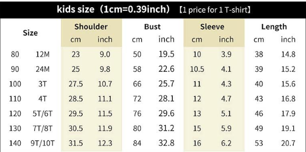 Kids size: 80(12M), 90(24M), 100(3T), 110(4T), 120(5T/6T), 130(7T/8T), 140(9T/10T)