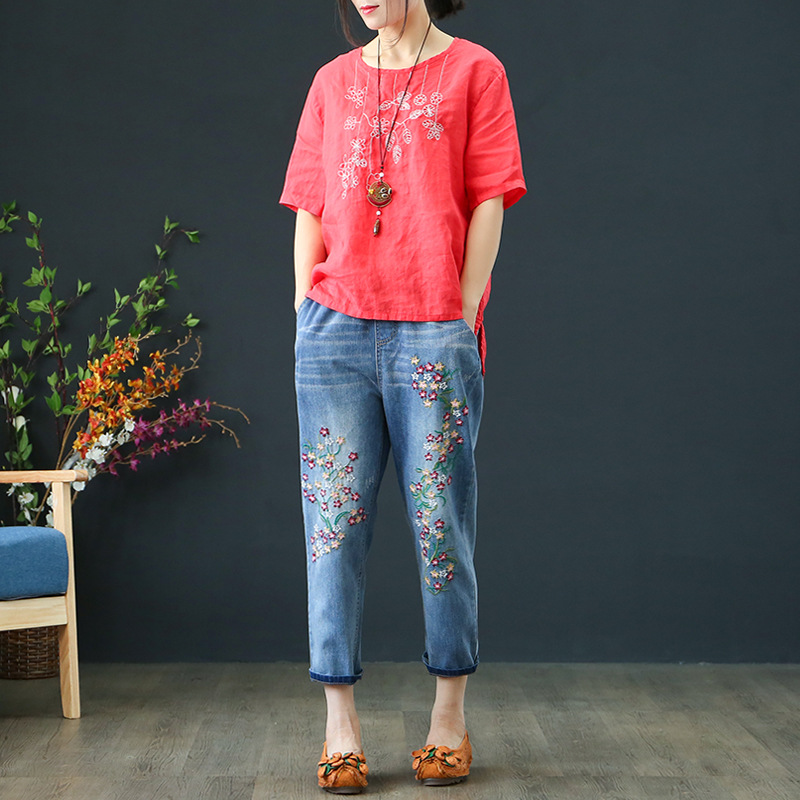 Women's Art Embroidery Plus Size Loose Light Blue Jeans