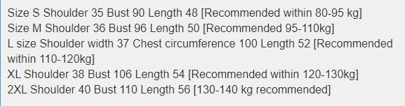 Size: S [recommended within 80-95kg], M [recommended within 95-110kg], L [recommended within 110-120kg], XL [recommended within 120-130kg]], 2XL [recommended within 130-140kg]]