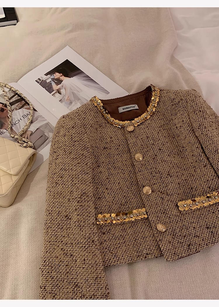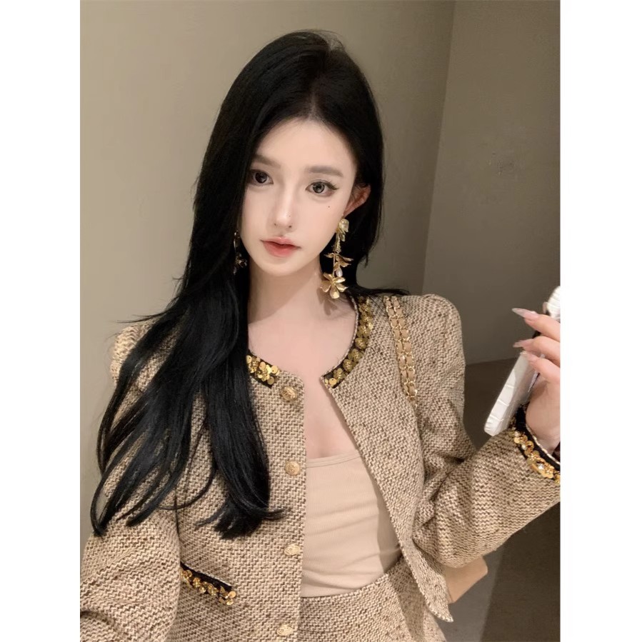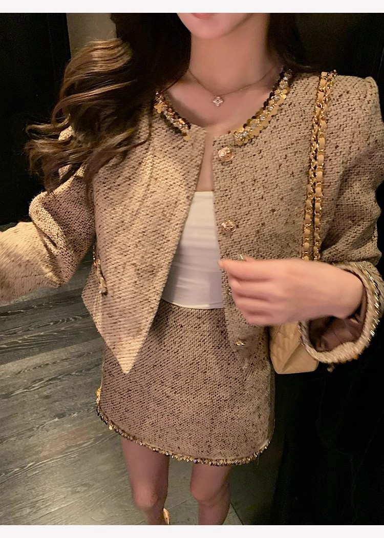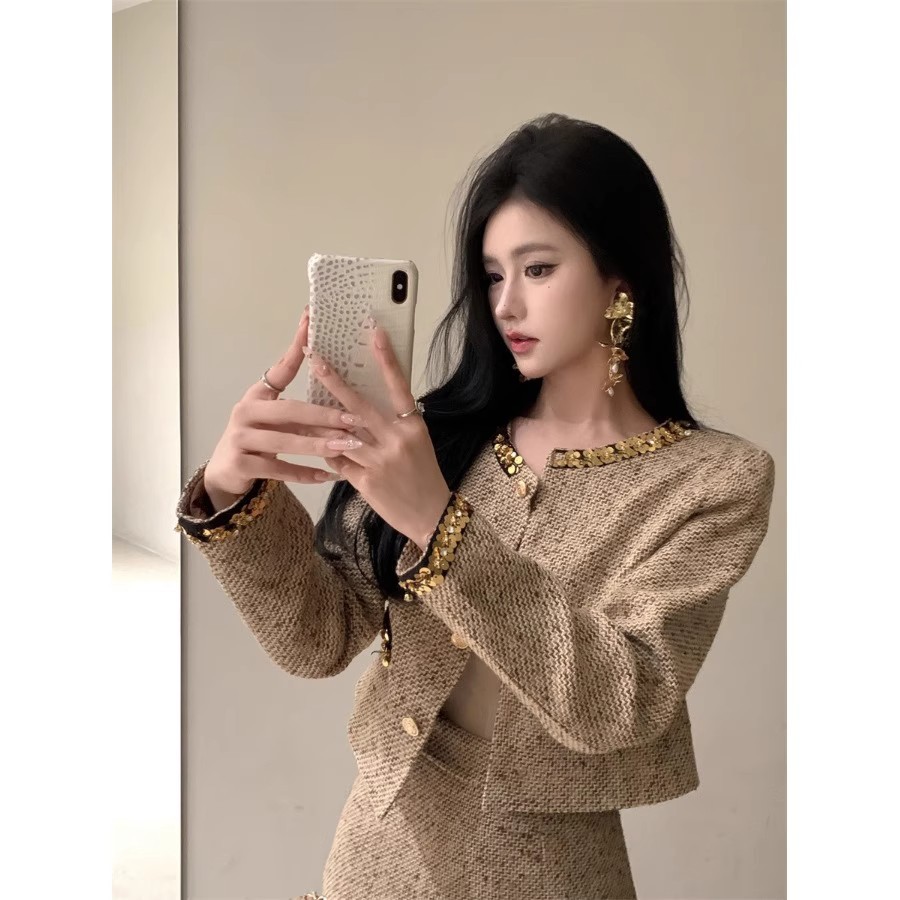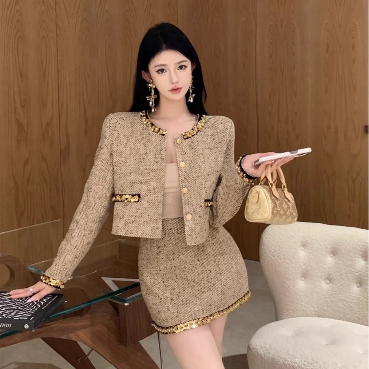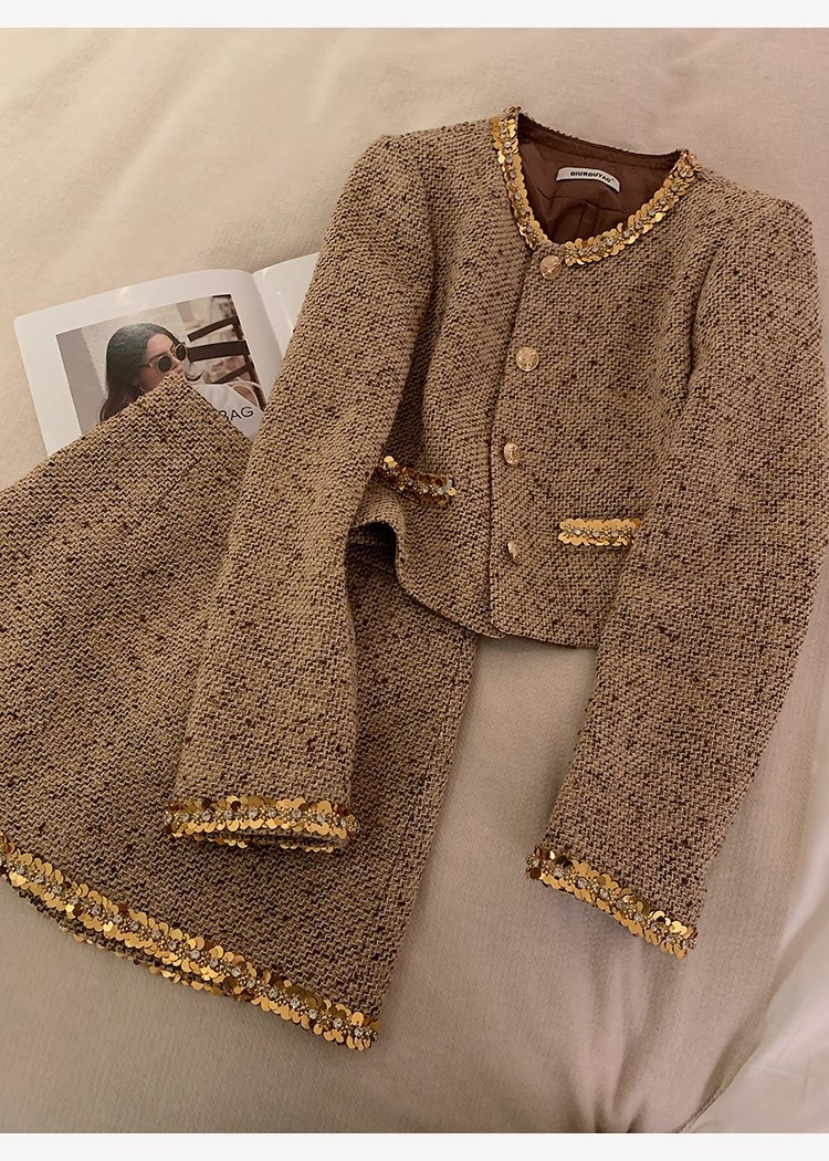 Color: golden brown (skirt), golden brown (coat), golden brown (suit)