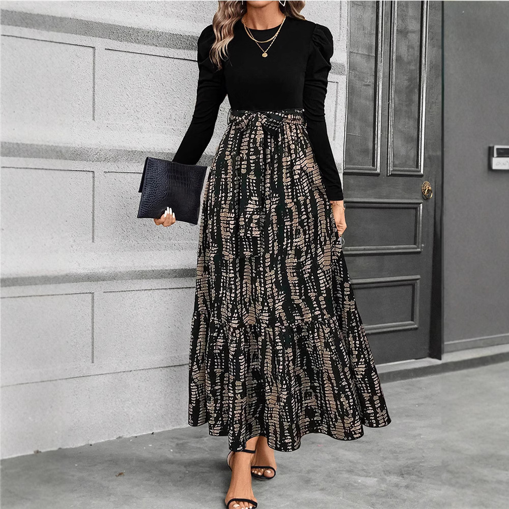 Womens Autumn Floral Print Crew-Neck Long-Sleeve Dress