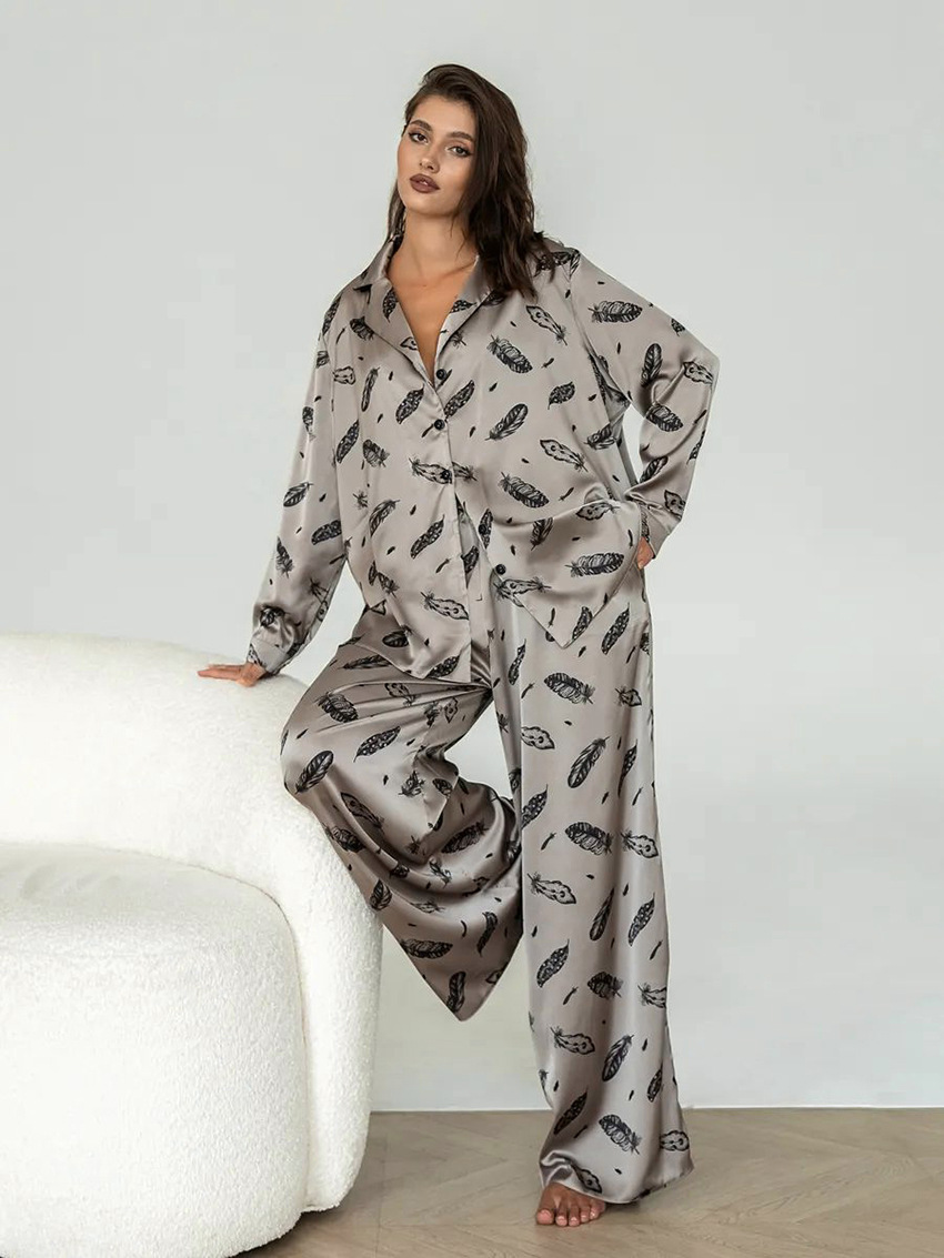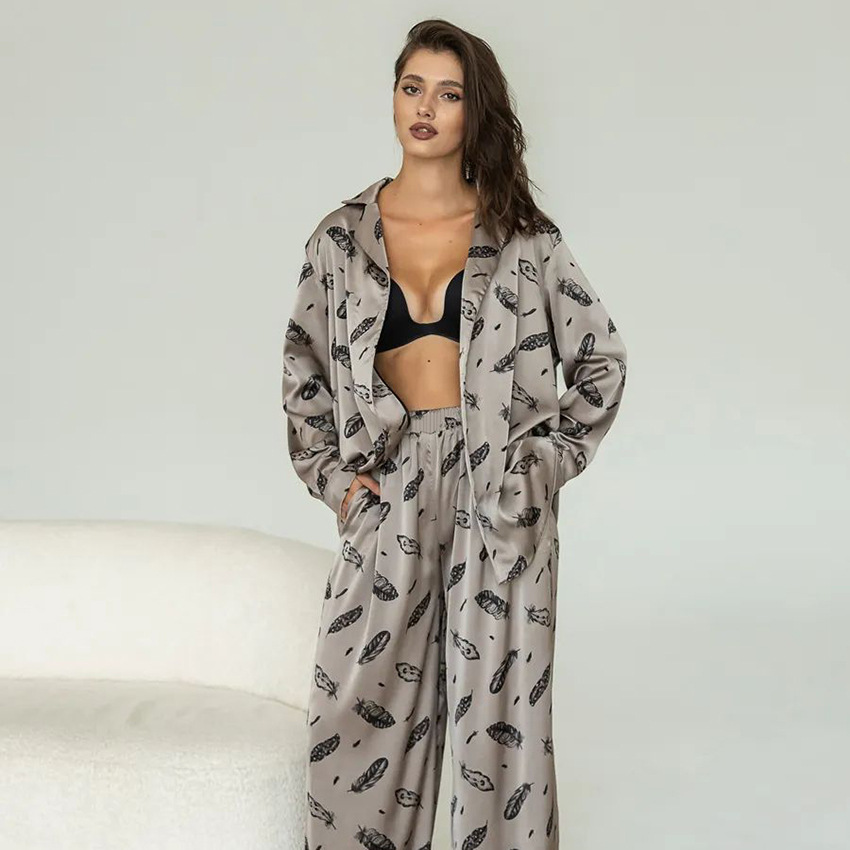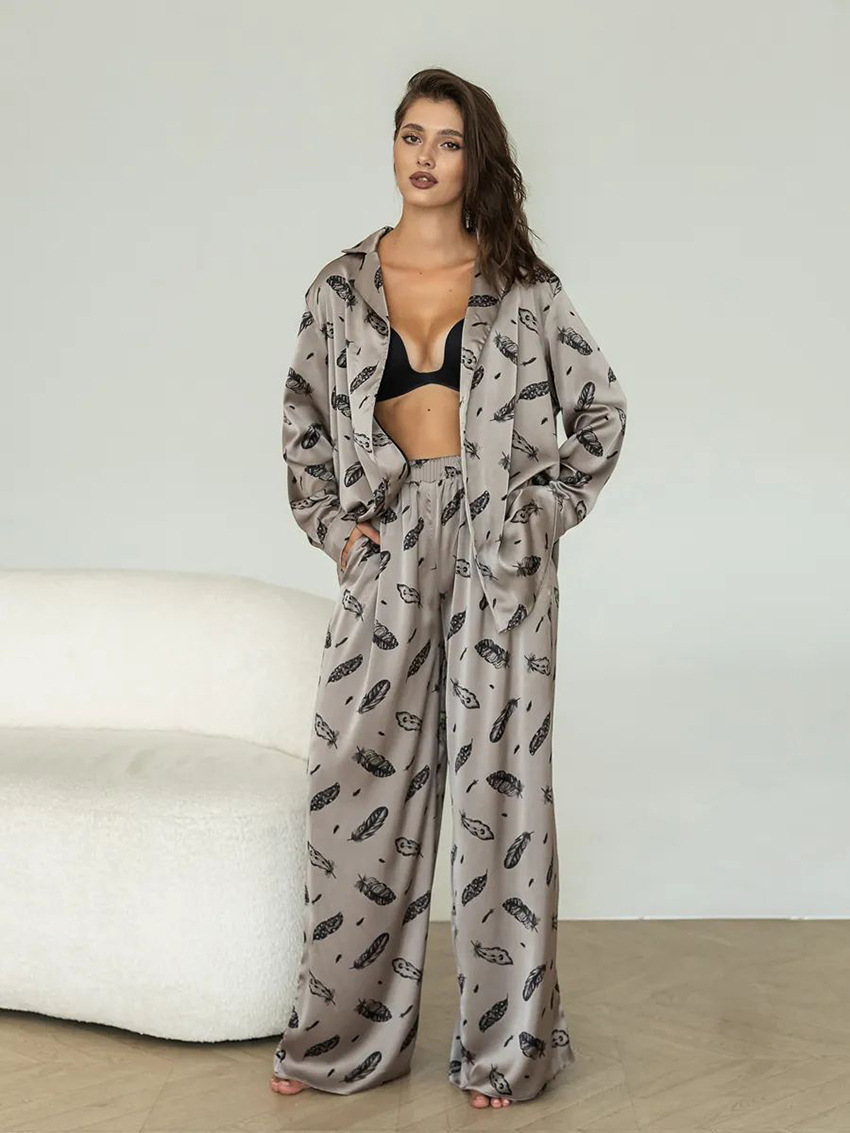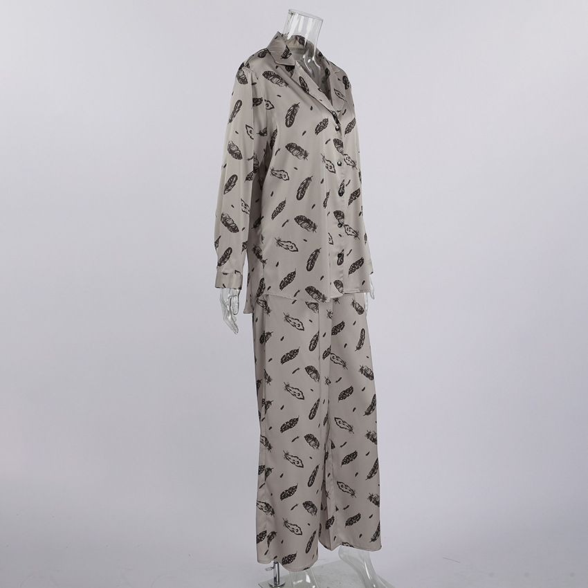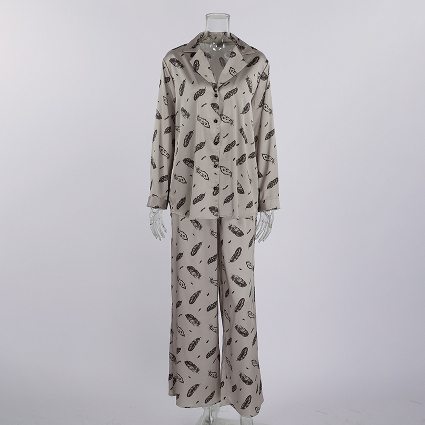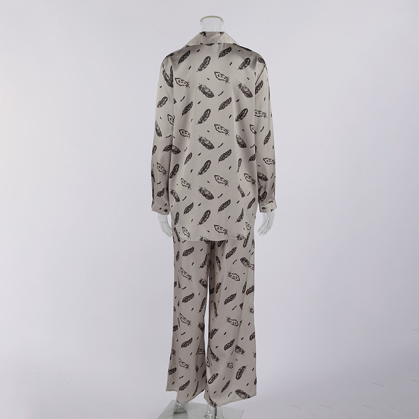 Womens Autumn Loose Stylish Printed Long-Sleeve Top And Pants Two-Piece Set In Imitation Silk For Home Wear