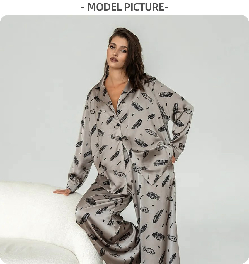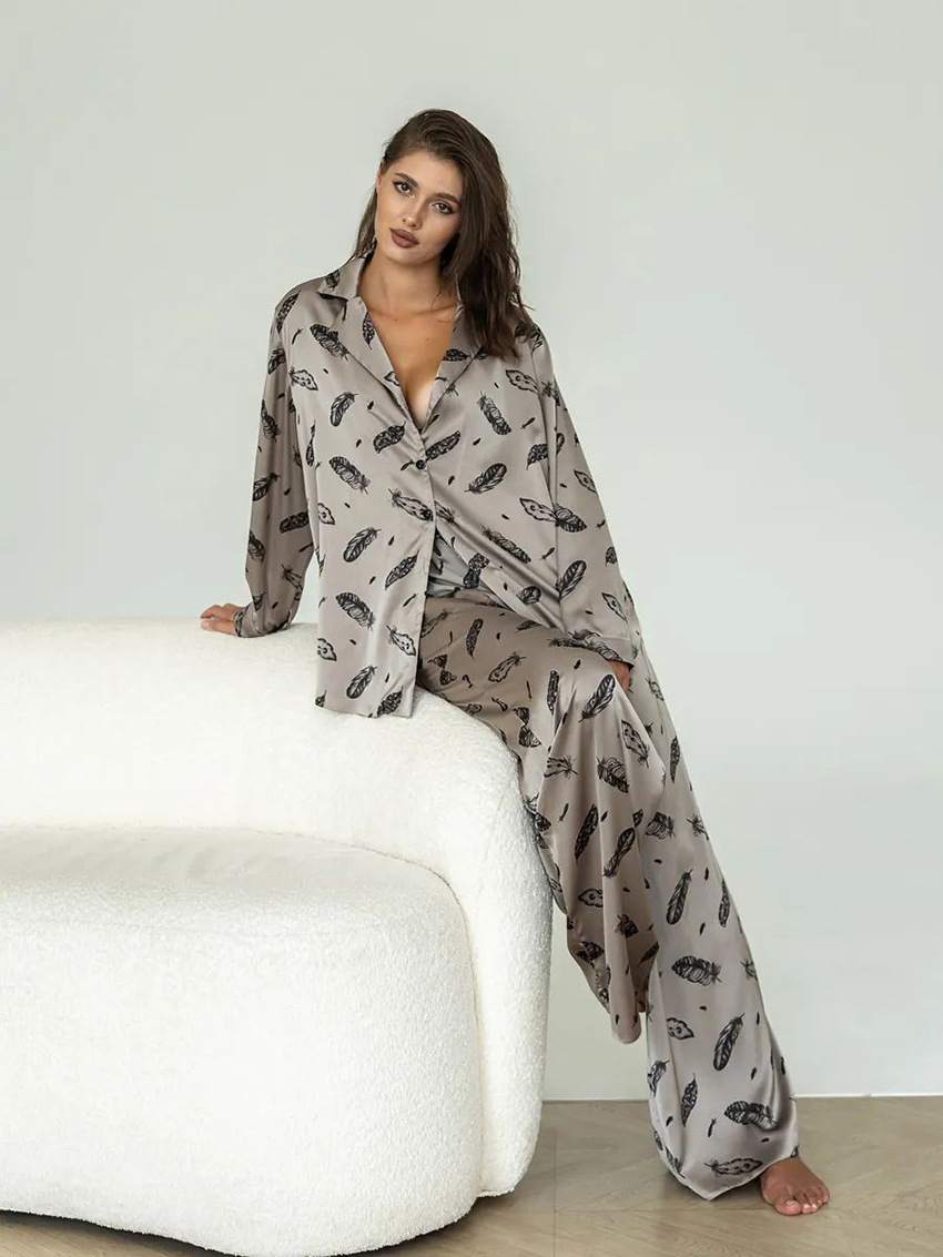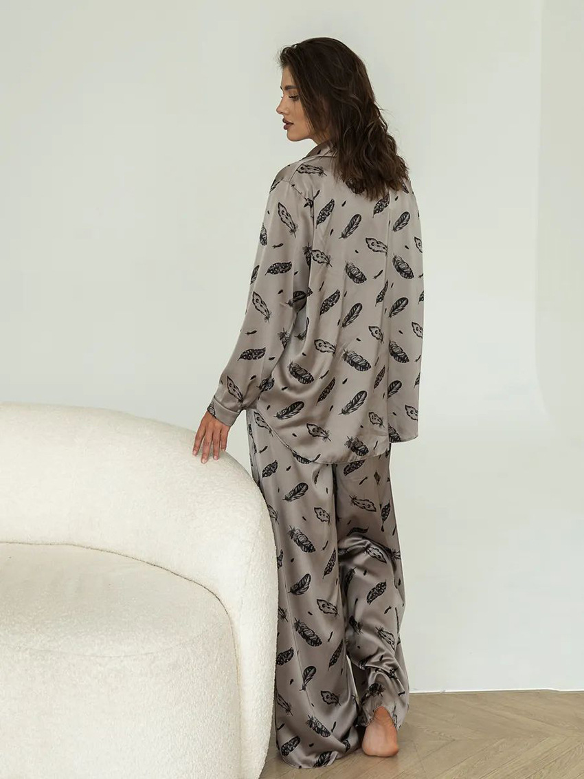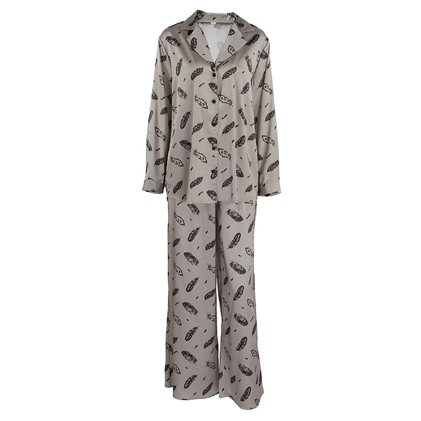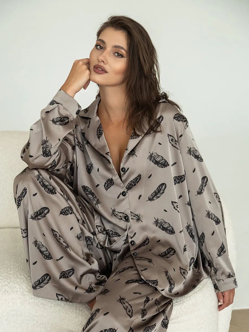 Womens Autumn Loose Stylish Printed Long-Sleeve Top And Pants Two-Piece Set In Imitation Silk For Home Wear