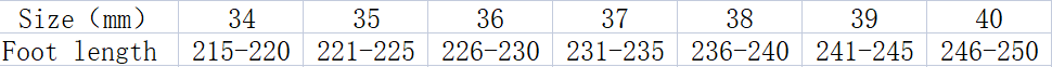 Size: 34, 35, 36, 37, 38, 39, 40, 41, 42