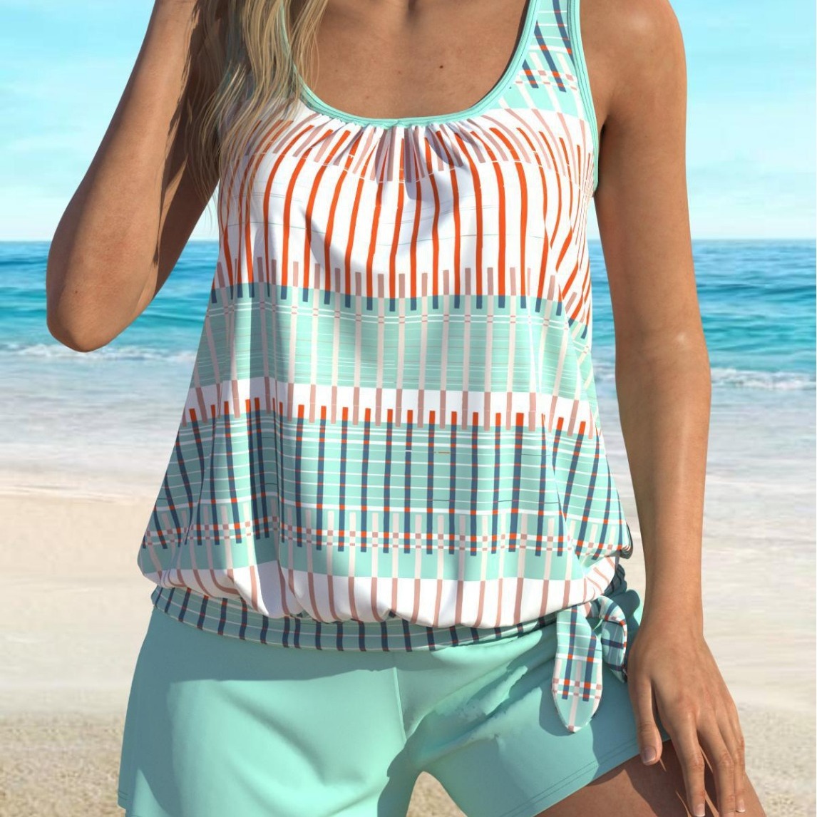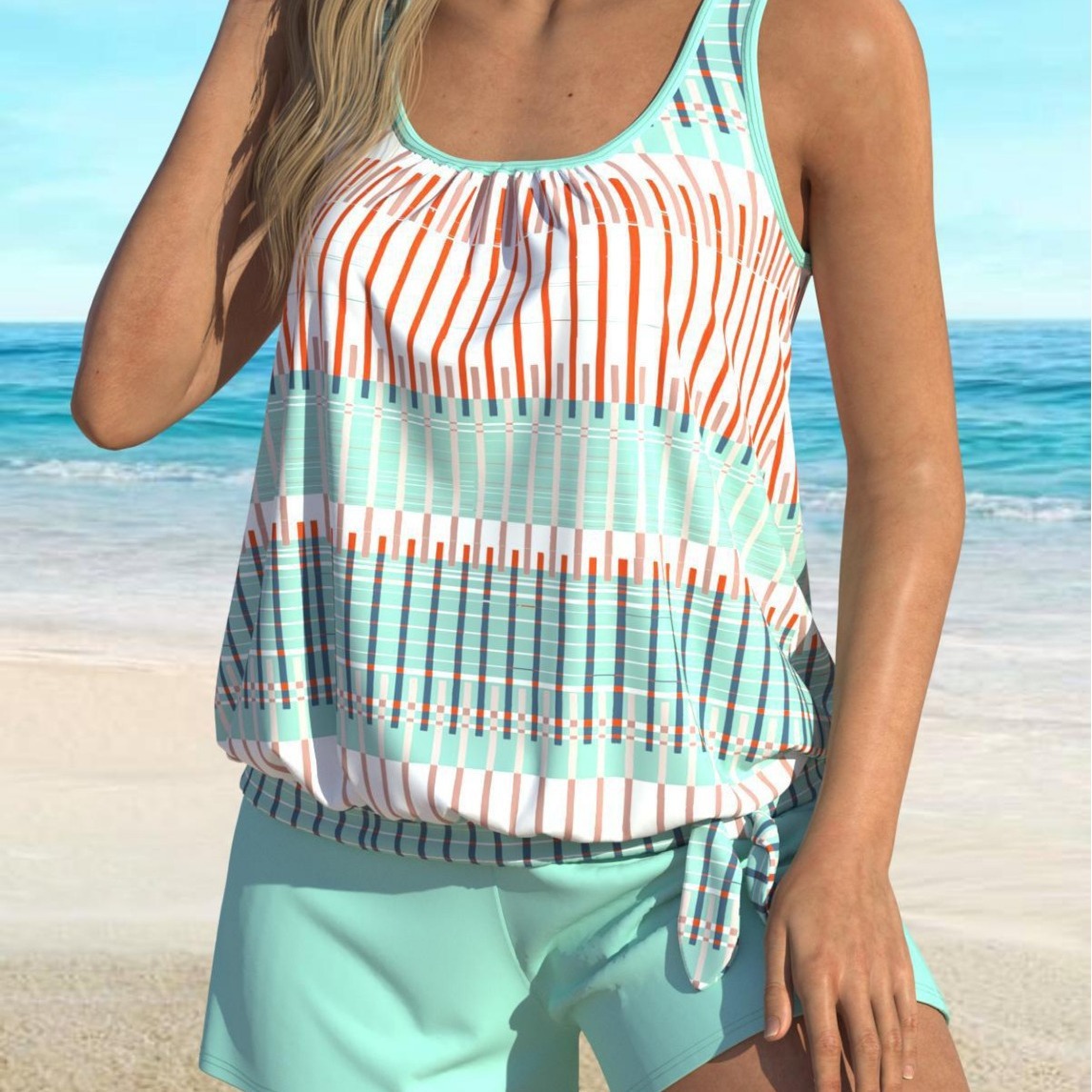 Women's Blue Striped Color Split Swimsuit