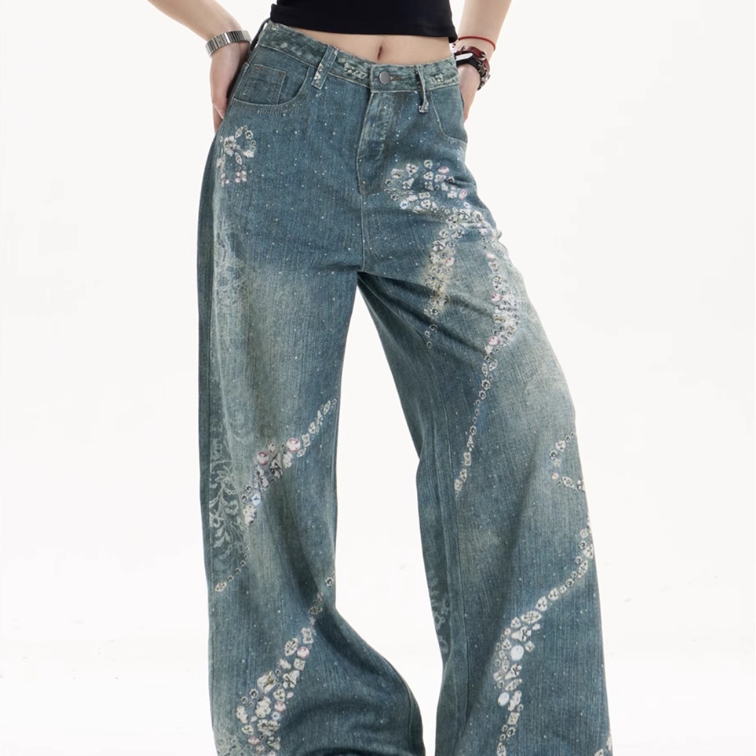 Women's Bowknot Printed Jeans Loose Wide-leg Pants