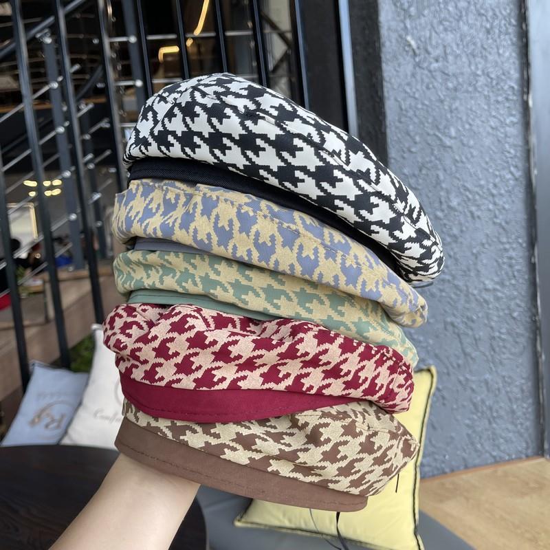 Women's British Style Houndstooth Plaid Flat Top Beret