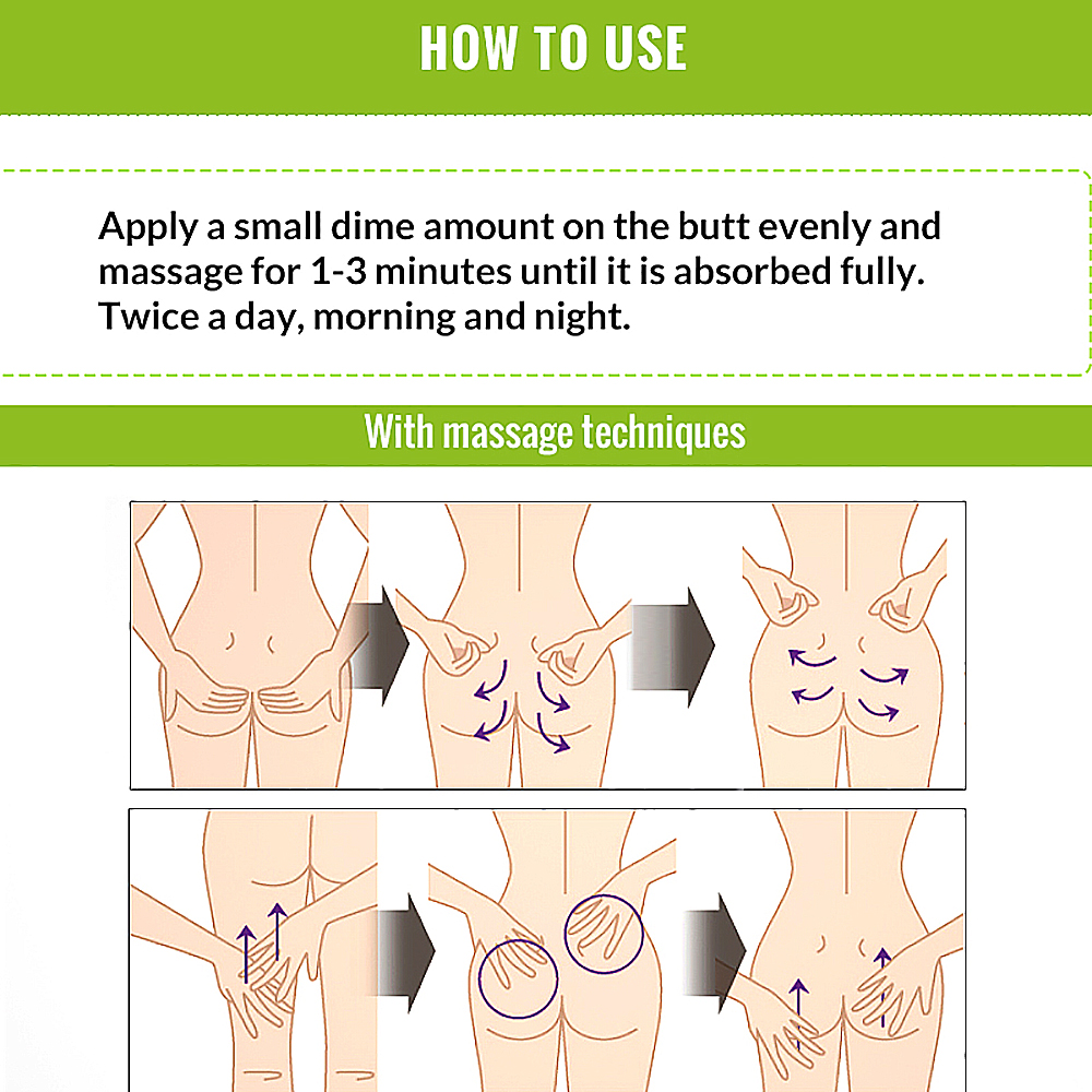 The buttocks enhancement cream uses a variety of herbal extracts to make the buttocks bigger and firmer. People who specialize in hip fat. It uses different types of herbal extracts to lift the sagging problem areas and make the buttocks look fuller!