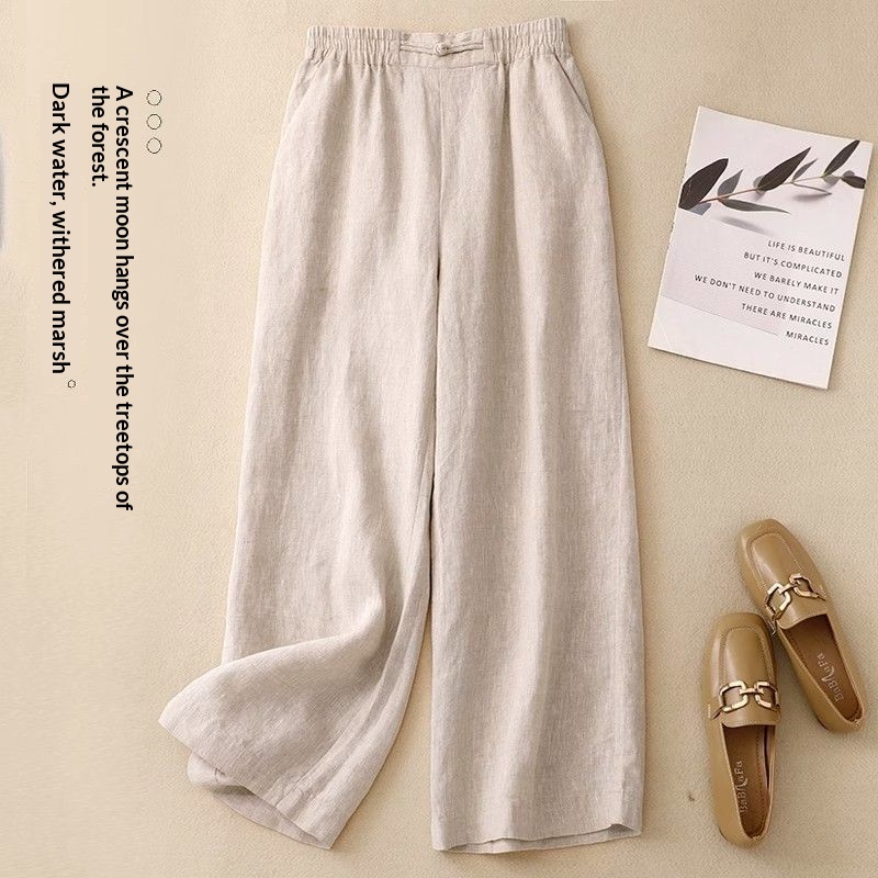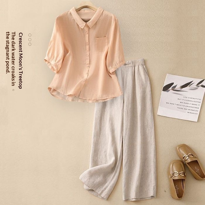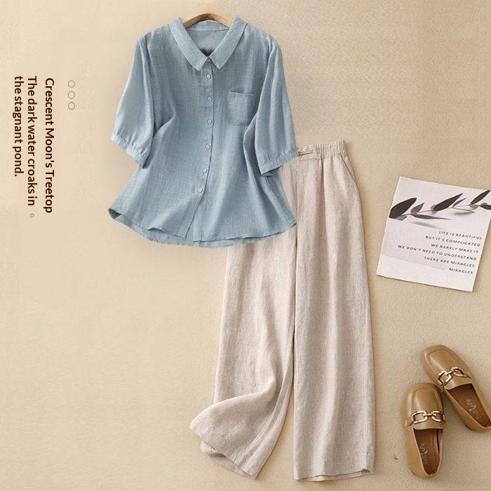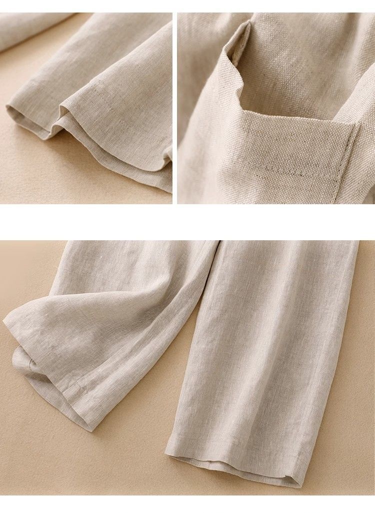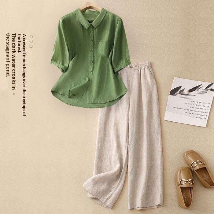Colors: Pink top with linen pants, gray top with linen pants, green top with linen pants, blue top with linen pants