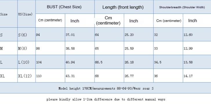 1. Asian sizes are 1 to 2 sizes smaller than European and American people. Choose the larger size if your size between two sizes. Please allow 2-3cm differences due to manual measurement. 2. Please check the size chart carefully before you buy the item, if you don't know how to choose size, please contact our customer service. 3.As you know, the different computers display colors differently, the color of the actual item may vary slightly from the following images.