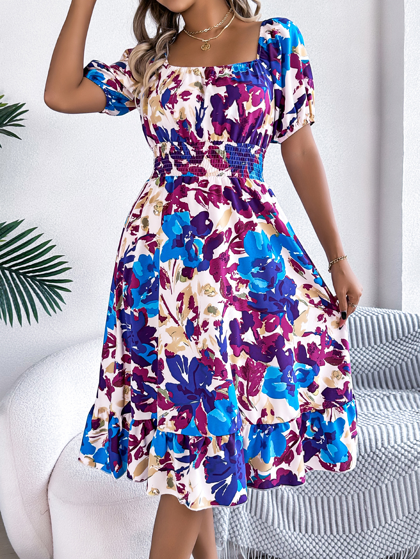 Women's Casual Floral Print Square Neck Short Sleeve Tie Waist Ruffle A-Line Dress